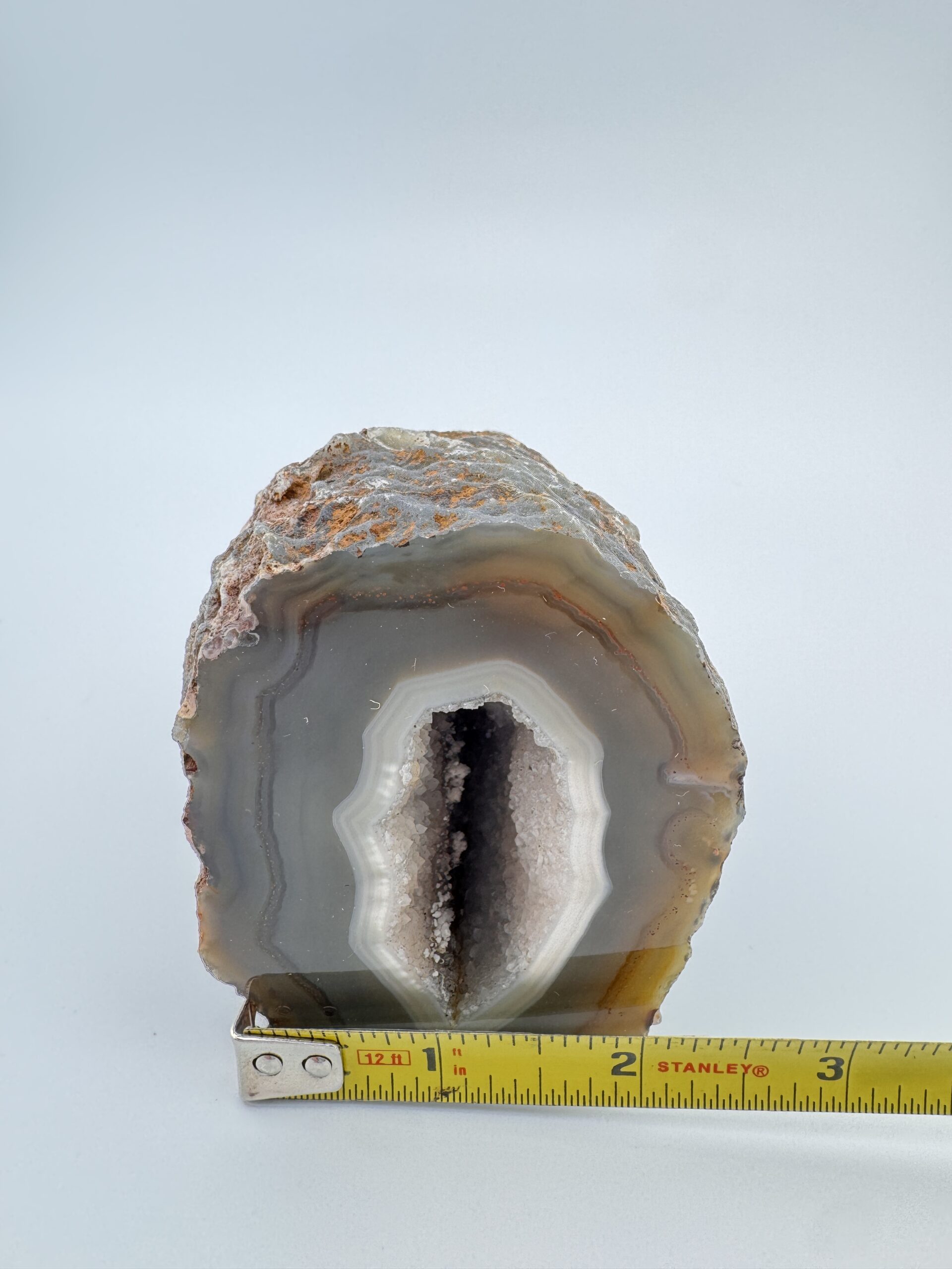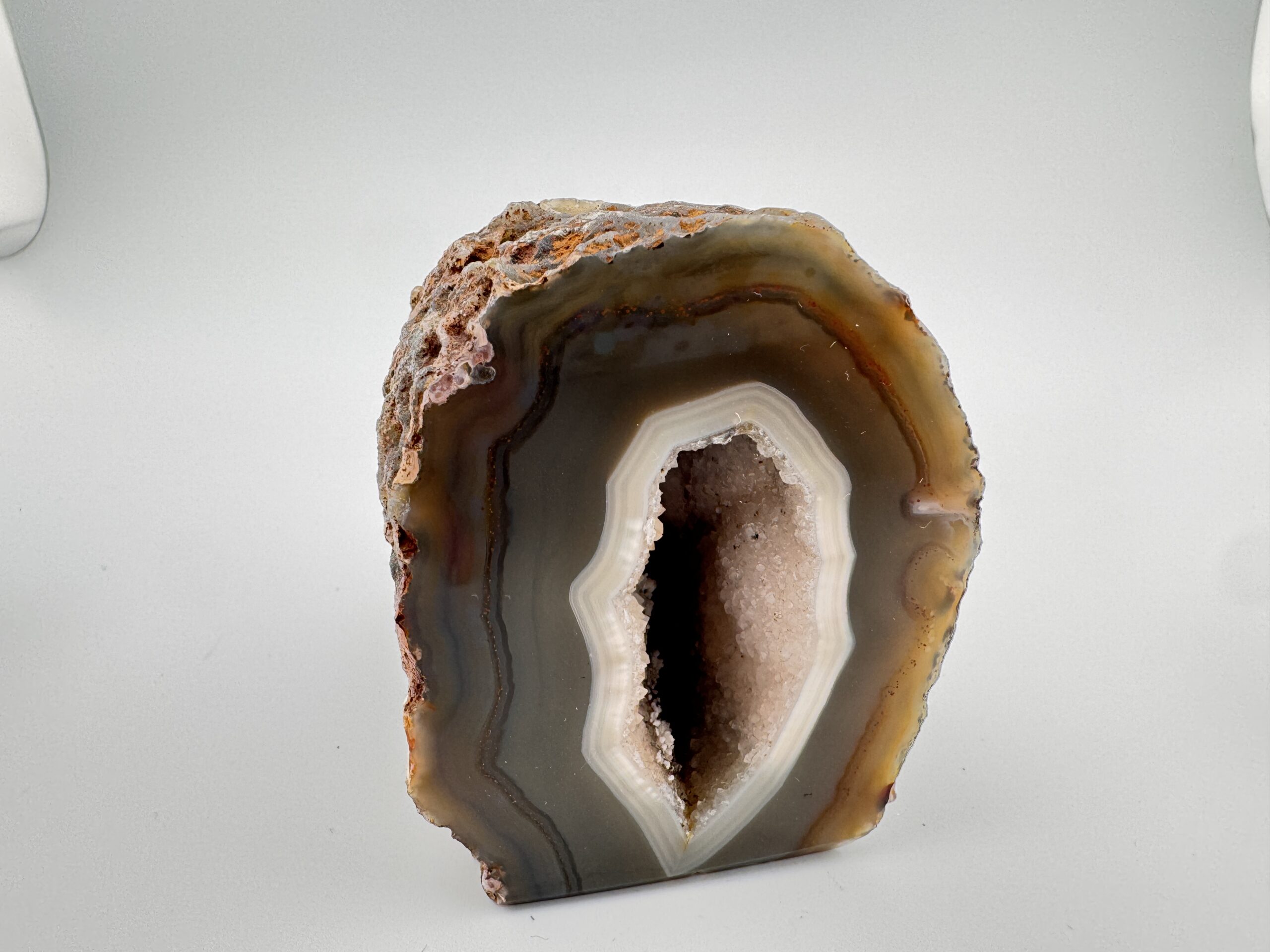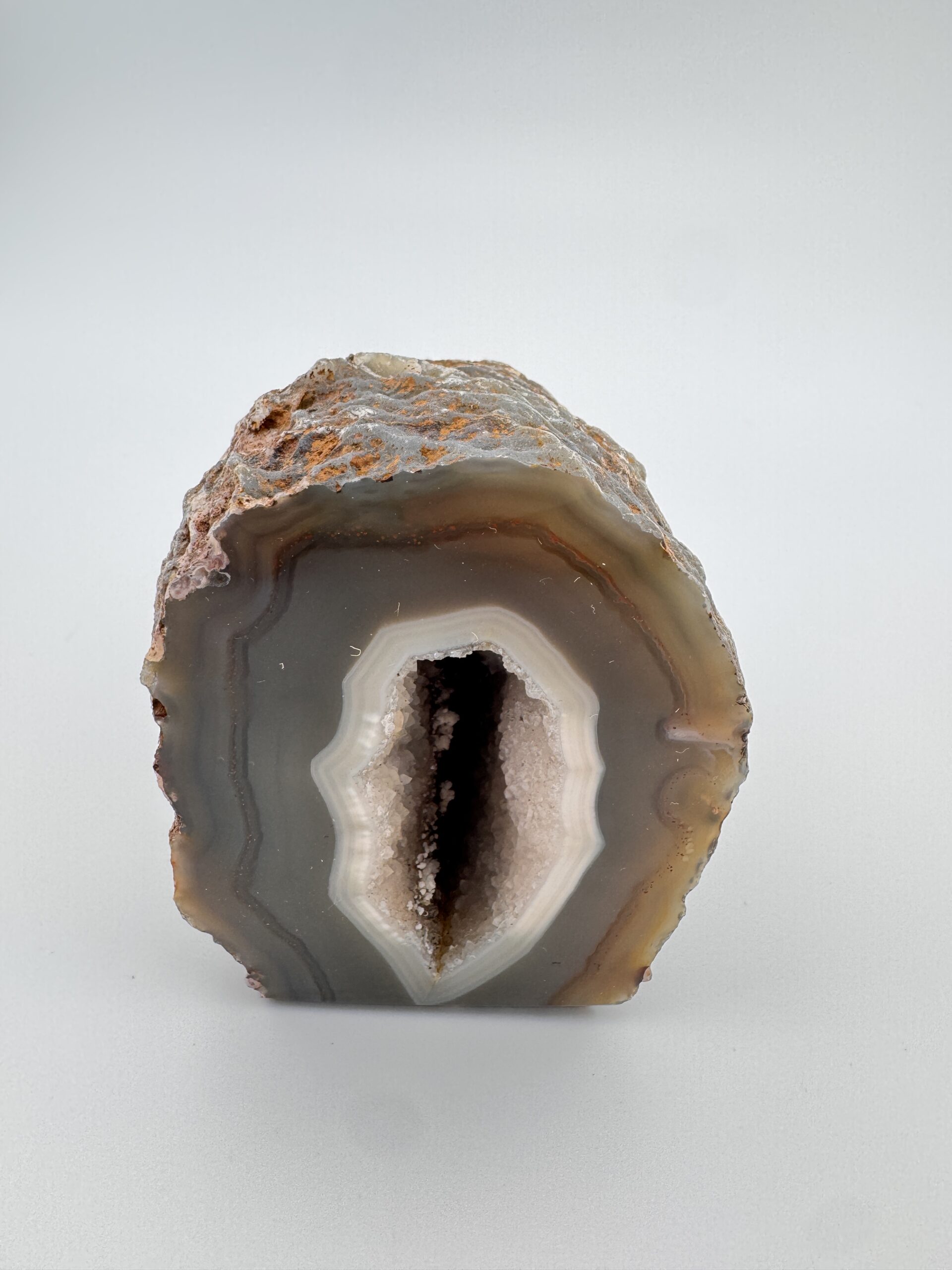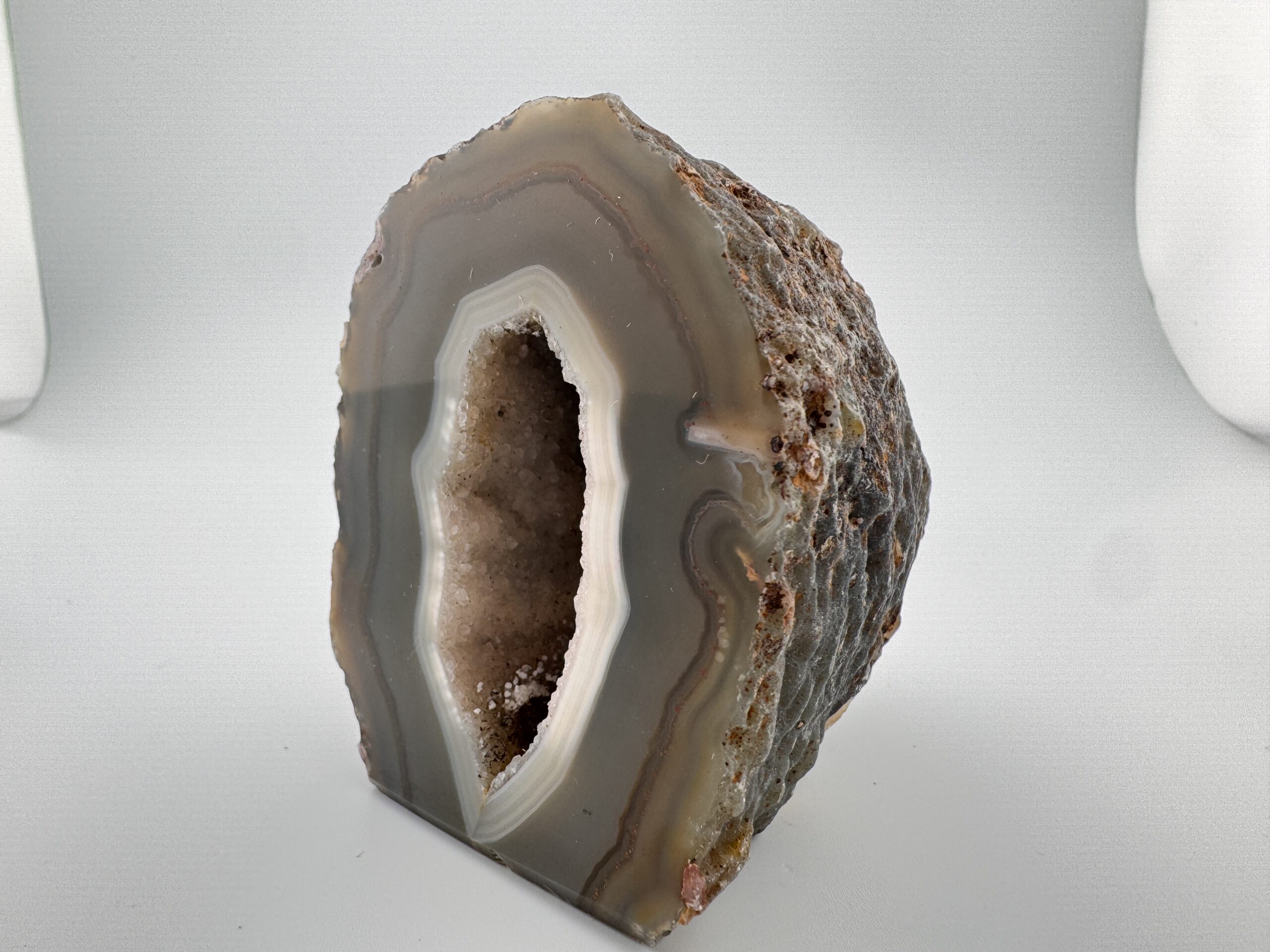 Natural Agate cut base geode, measuring roughly 2.5″ x 3.37″ x 3.15″. Polished front displaying gorgeous natural banding with the natural rough back and a stable flat base.