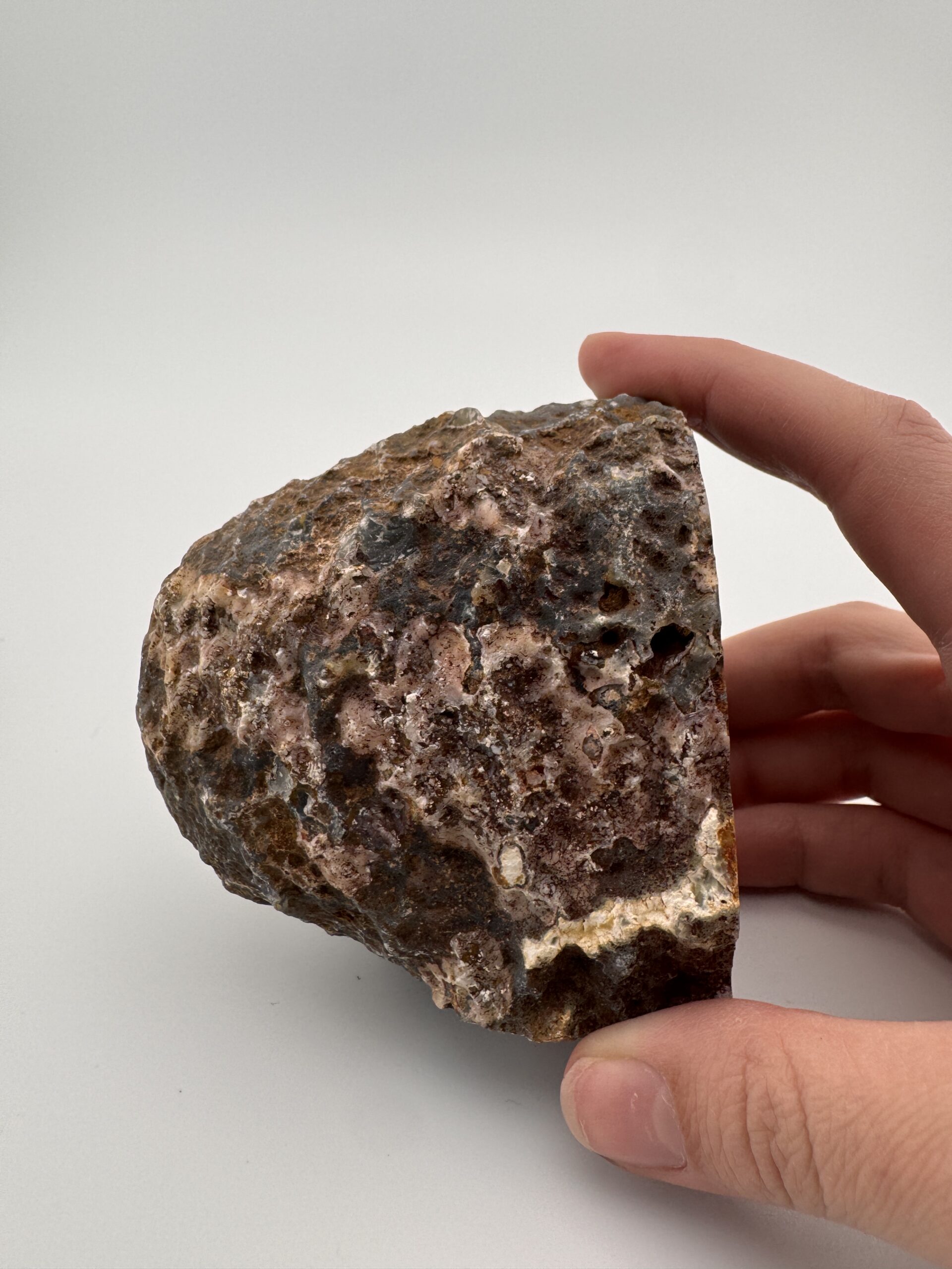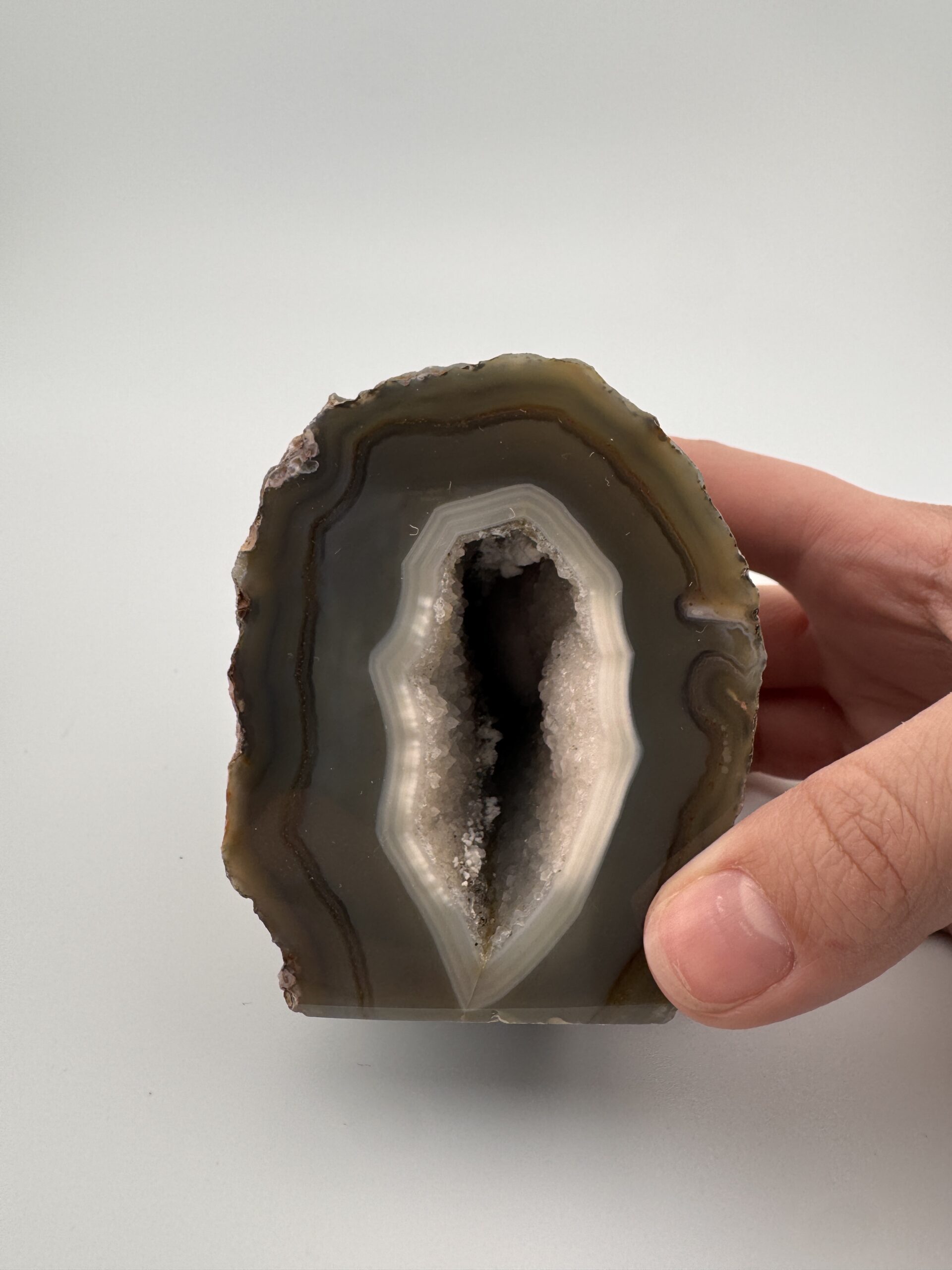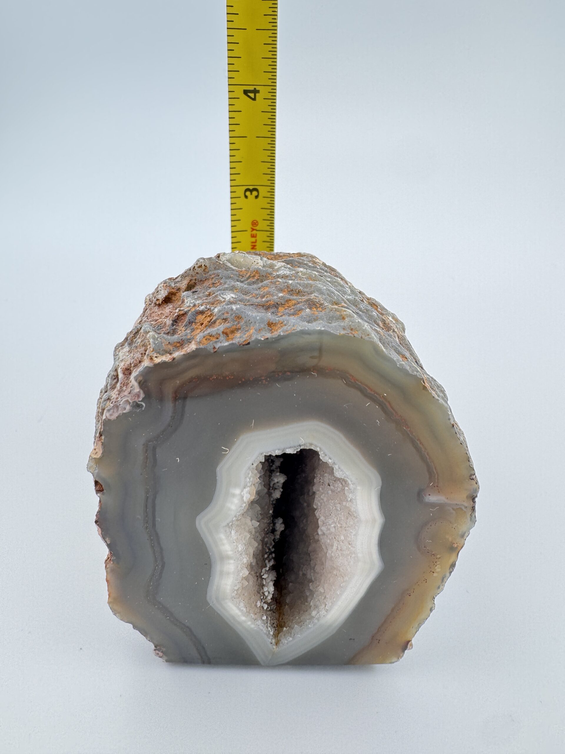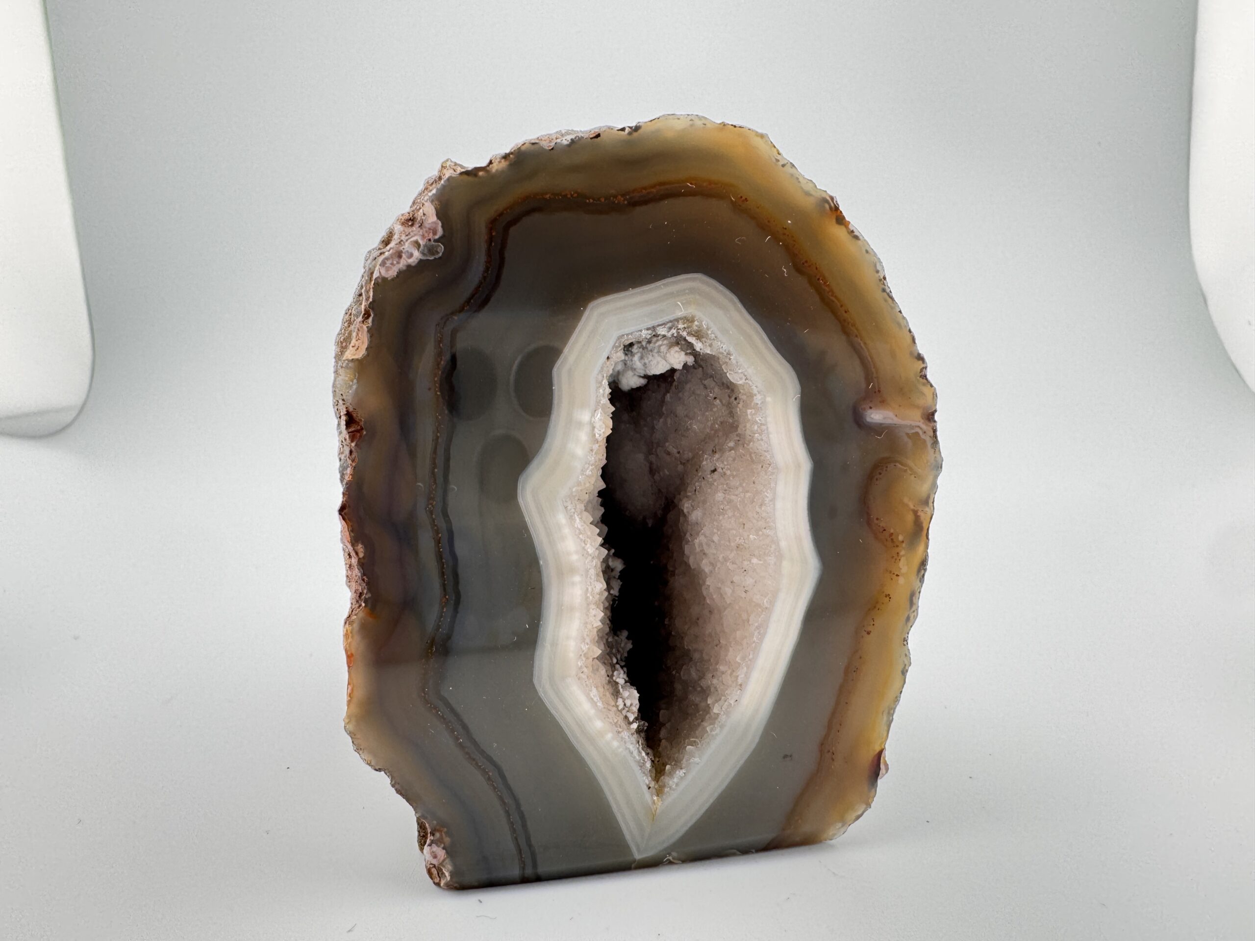 Natural Agate cut base geode, measuring roughly 2.5″ x 3.37″ x 3.15″. Polished front displaying gorgeous natural banding with the natural rough back and a stable flat base.