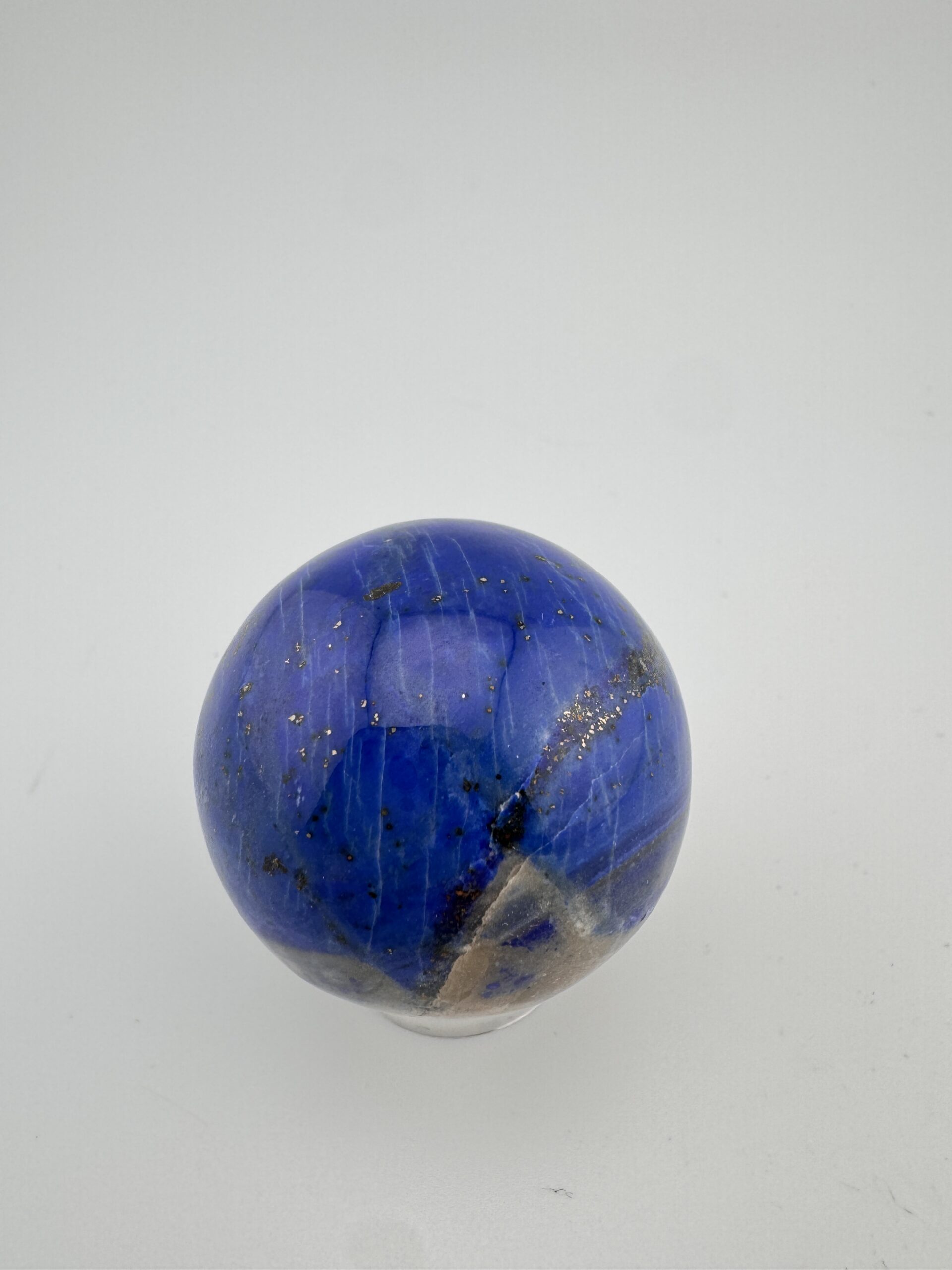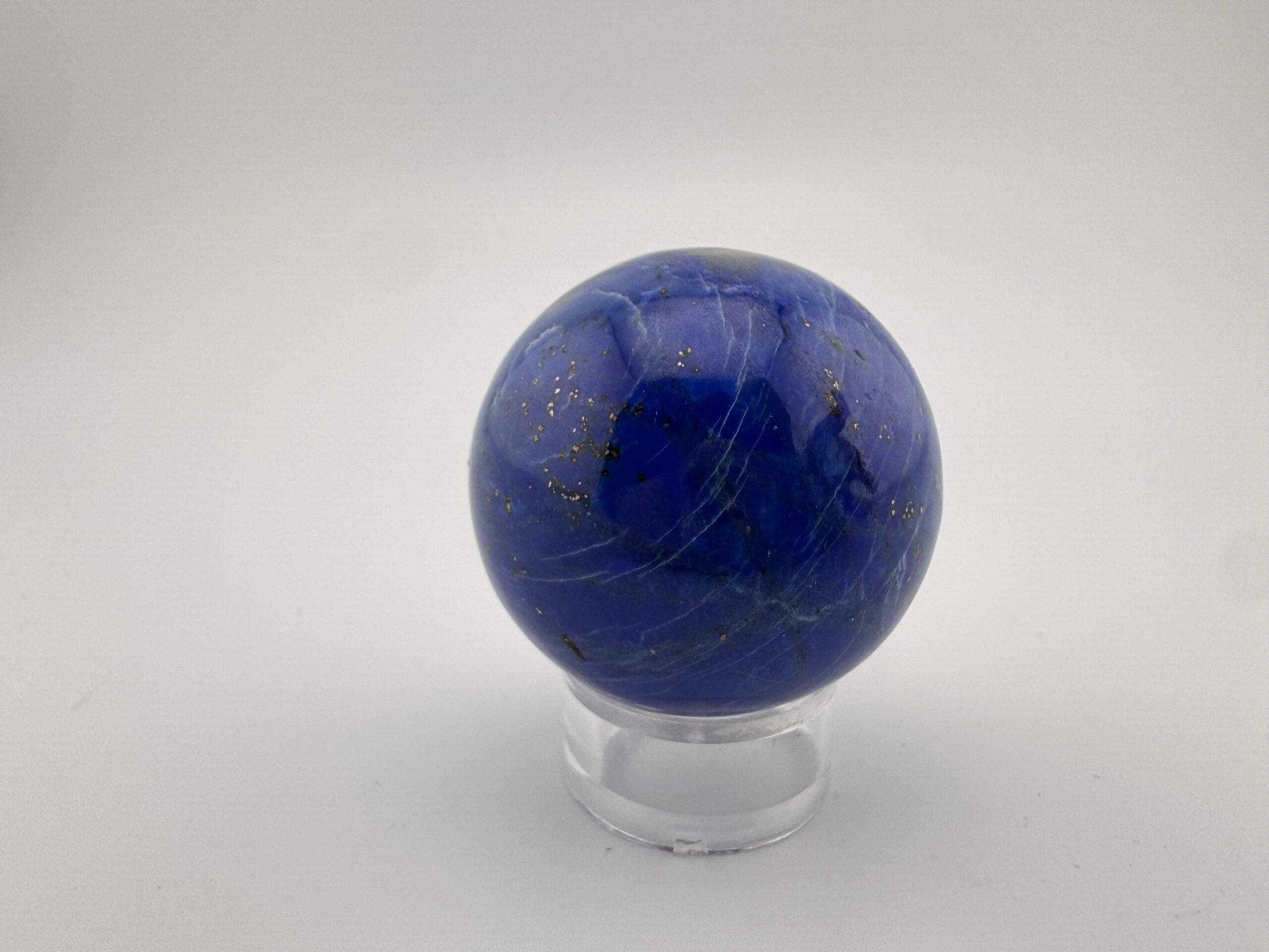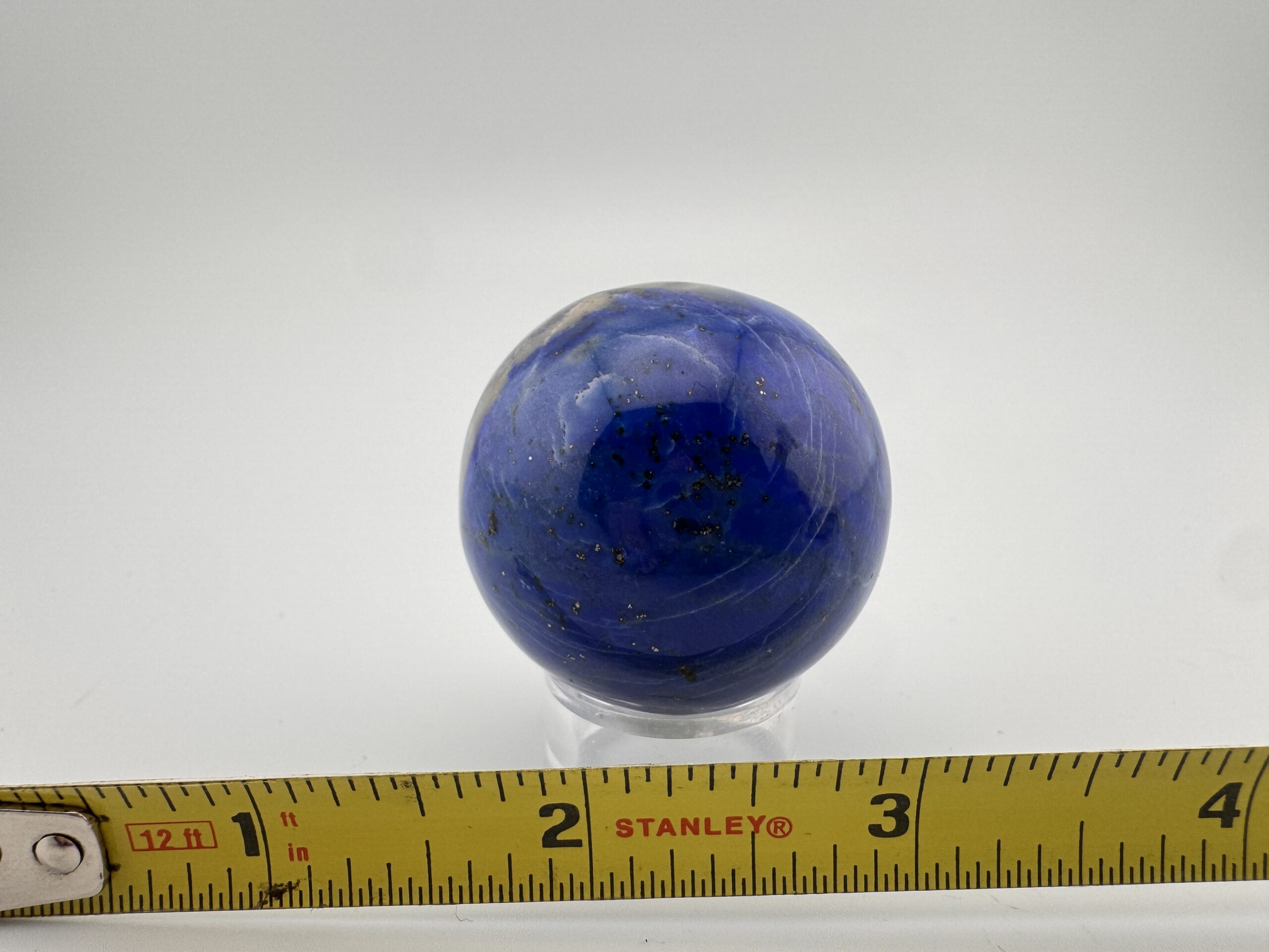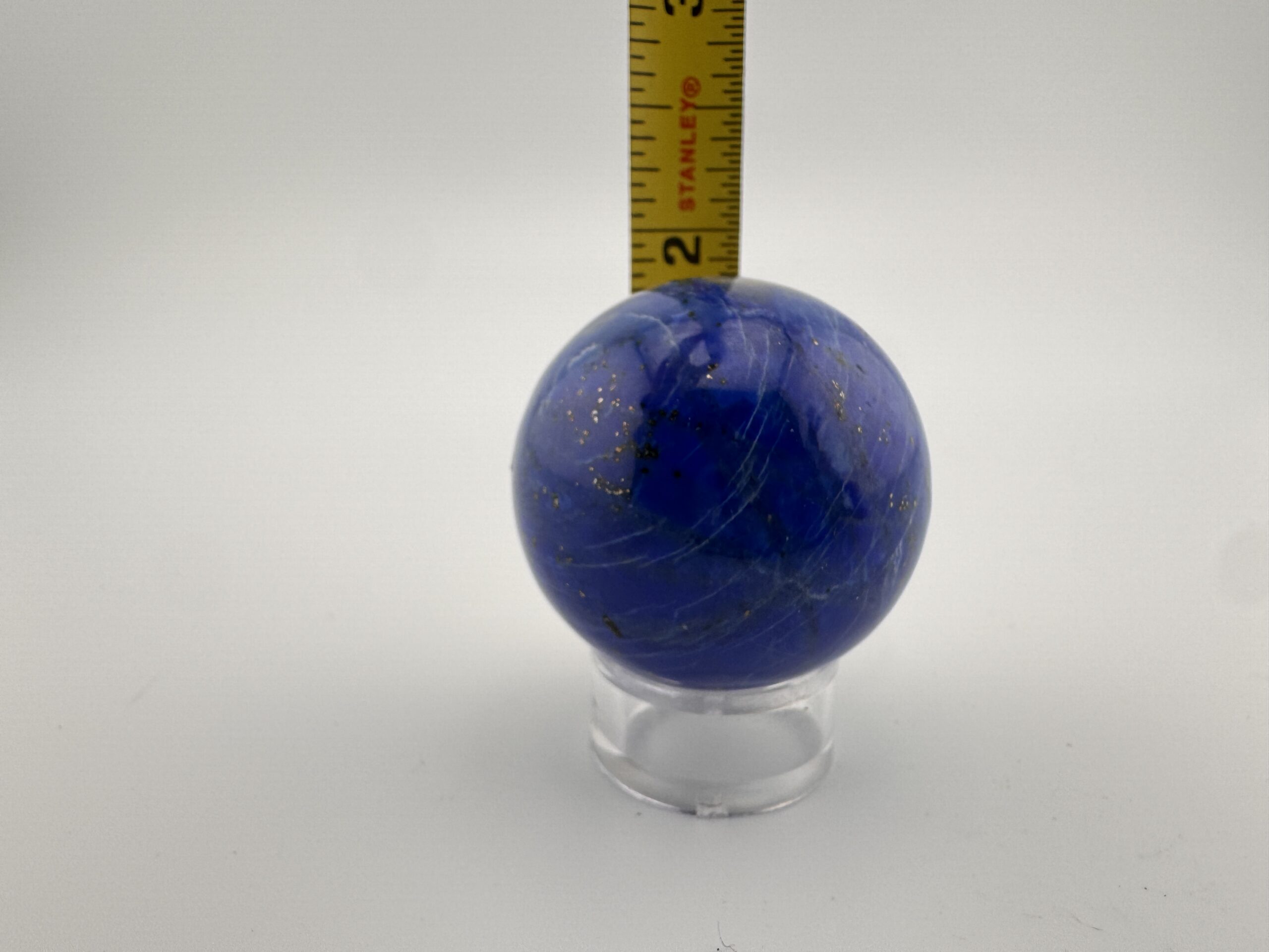 This polished Lapis Lazuli sphere measures 1.5″ across and sits on a clear plastic base, showcasing its vivid royal blue hues accented with natural white and golden flecks. Its smooth, glossy surface highlights the stone’s timeless beauty, making it a charming accent for any desk, shelf, or crystal display.
