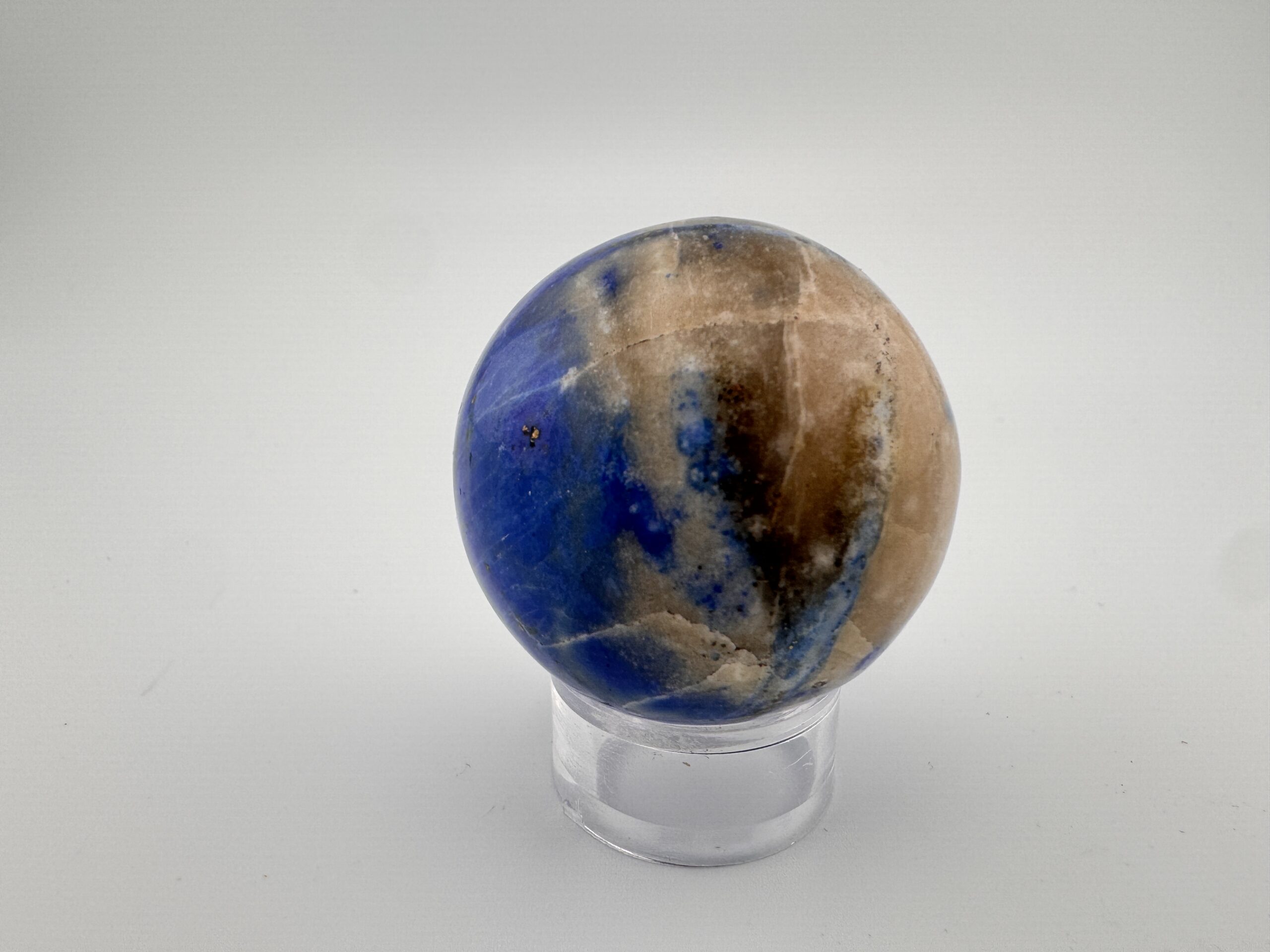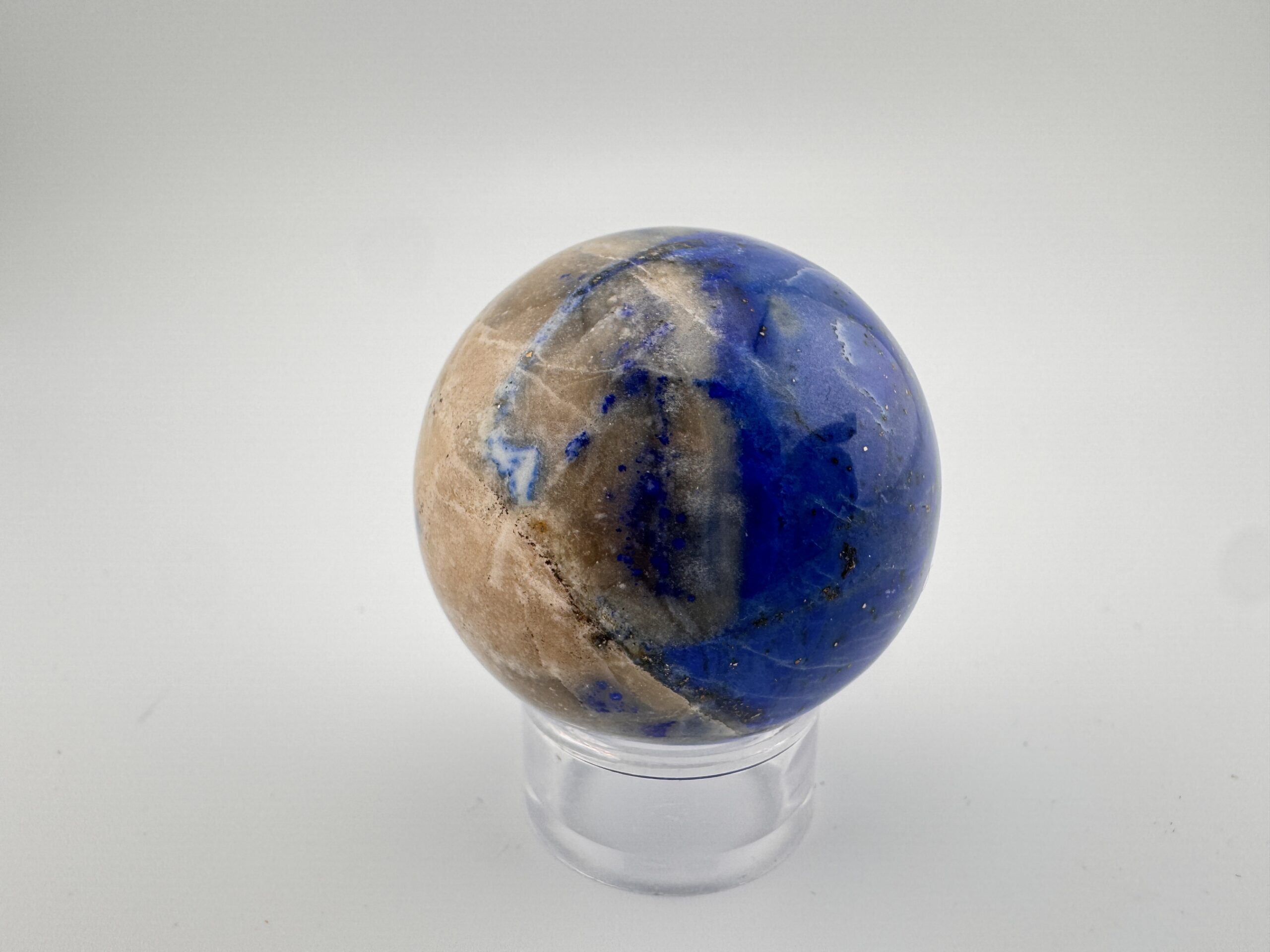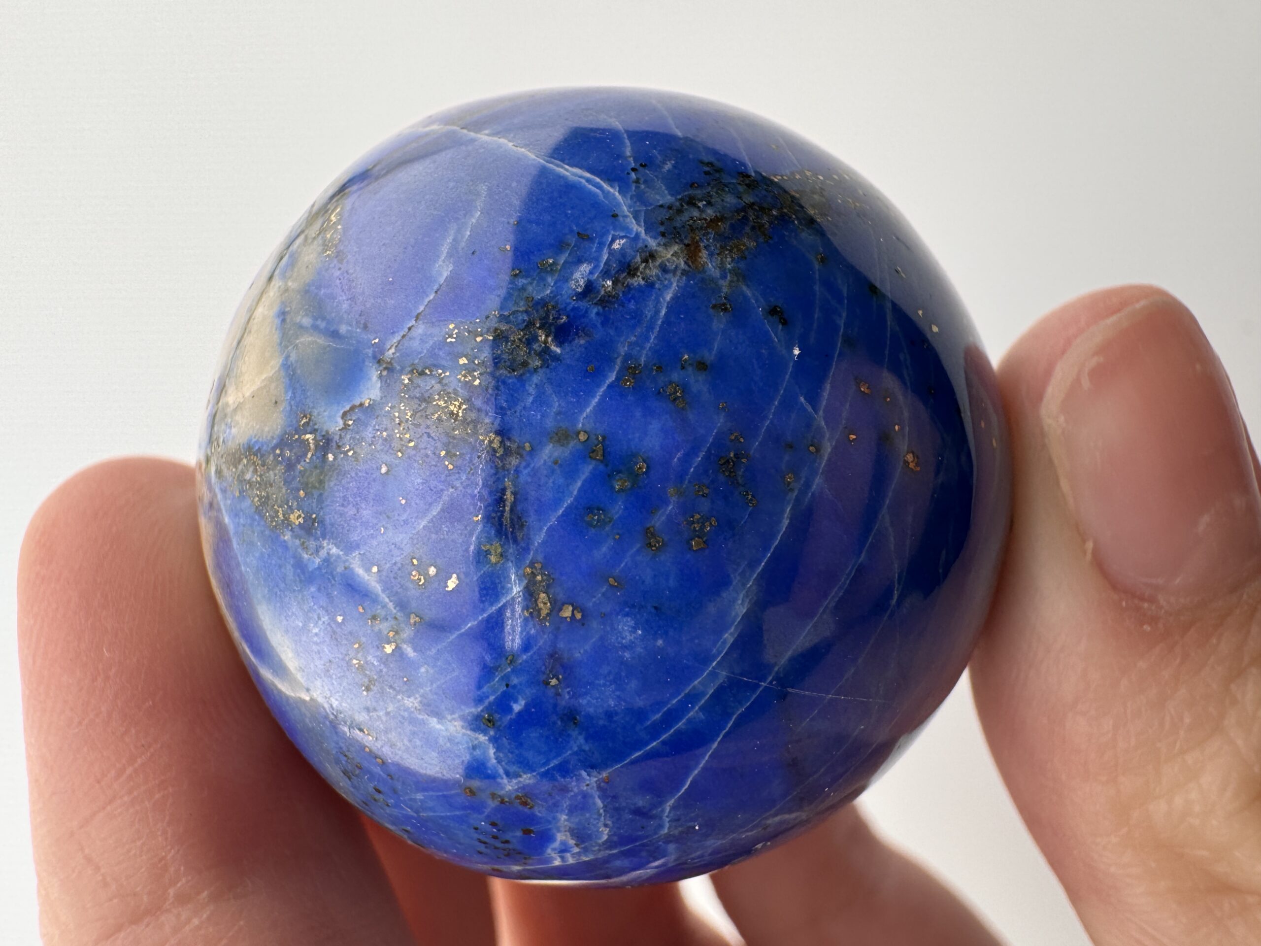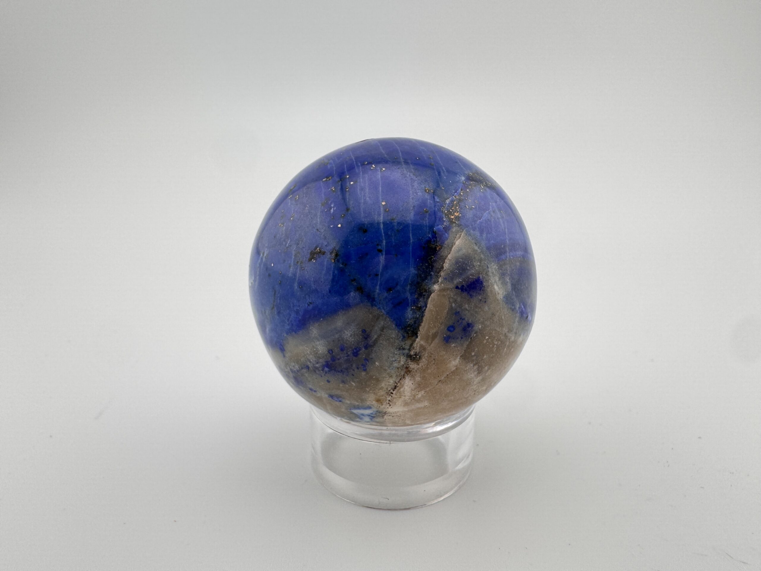 This polished Lapis Lazuli sphere measures 1.5″ across and sits on a clear plastic base, showcasing its vivid royal blue hues accented with natural white and golden flecks. Its smooth, glossy surface highlights the stone’s timeless beauty, making it a charming accent for any desk, shelf, or crystal display.