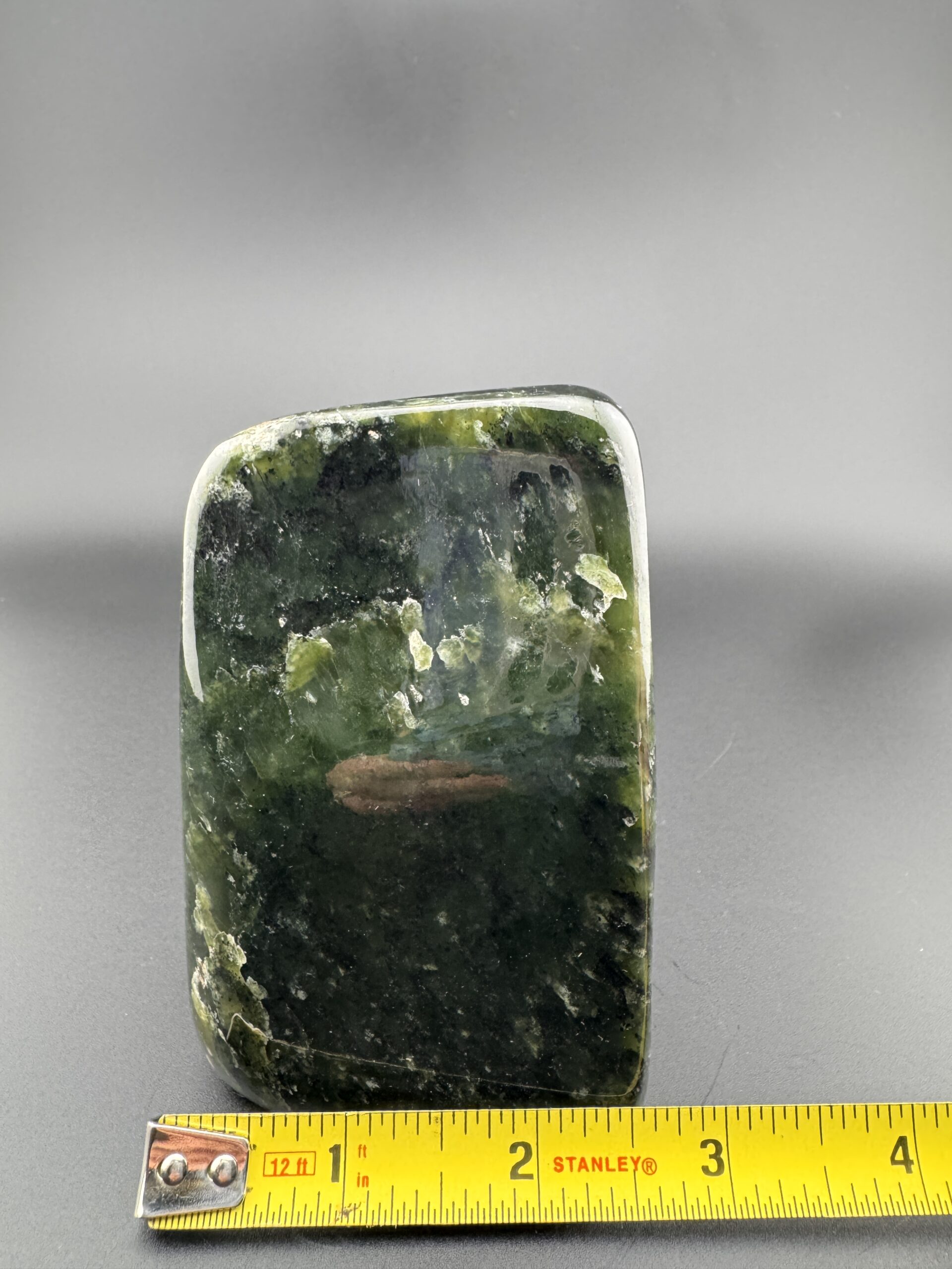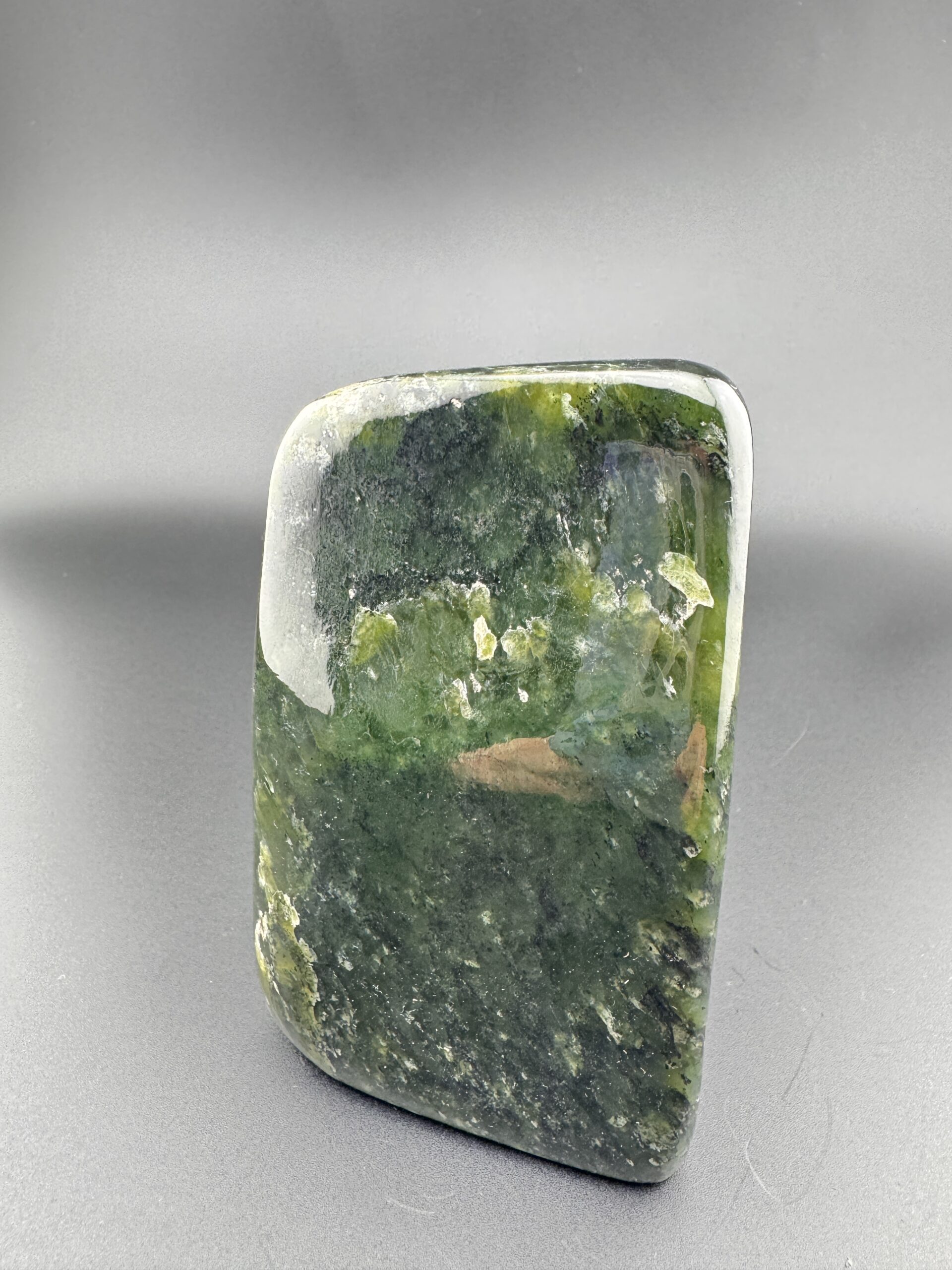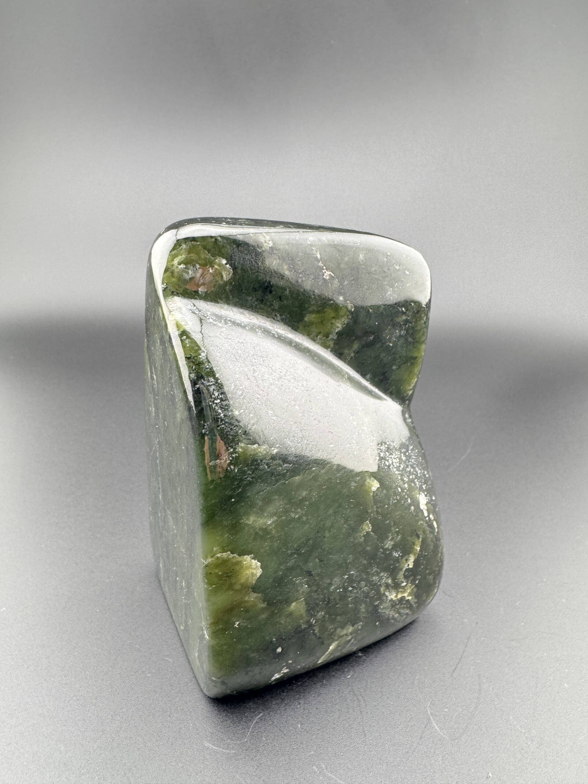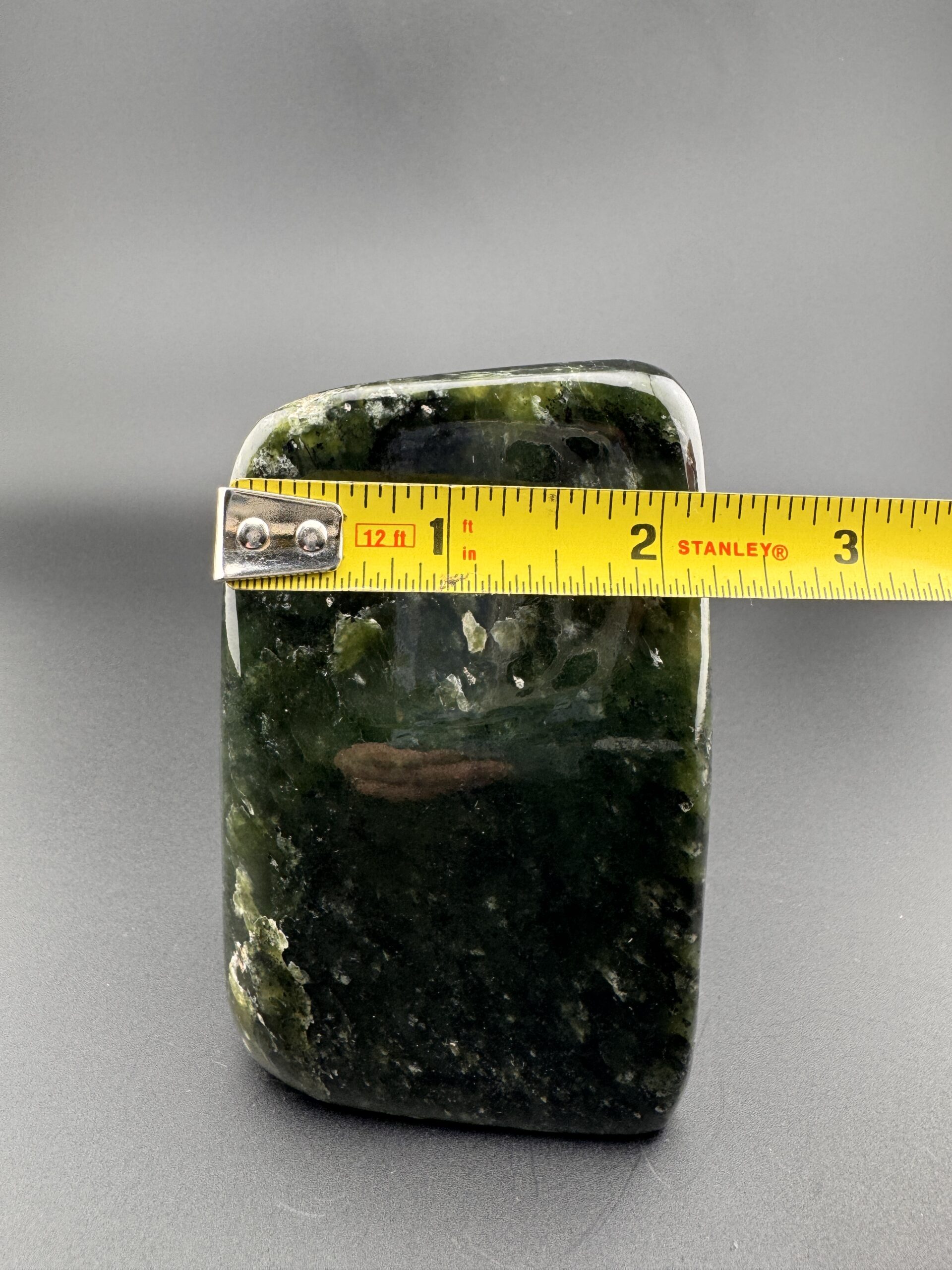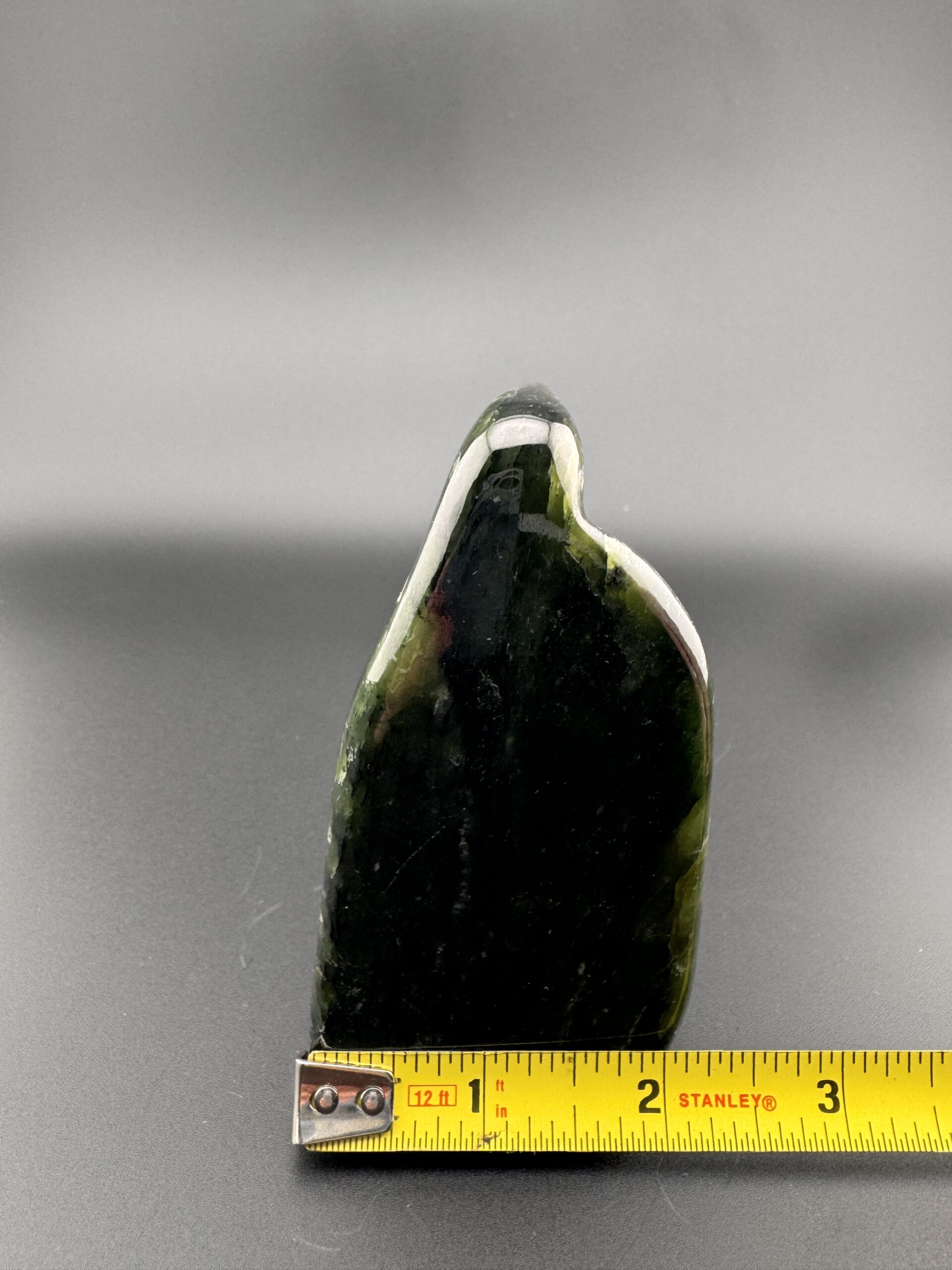 This freeform polished Jade piece displays soothing shades of rich green color with a smooth glossy finish.  Each curve and contour highlights the stone’s natural beauty and unique character.  Measuring 2″ x 2.5″ x 4″ and weighing 24 ounces, making it a timeless addition to any collection or as a calming addition in your space.