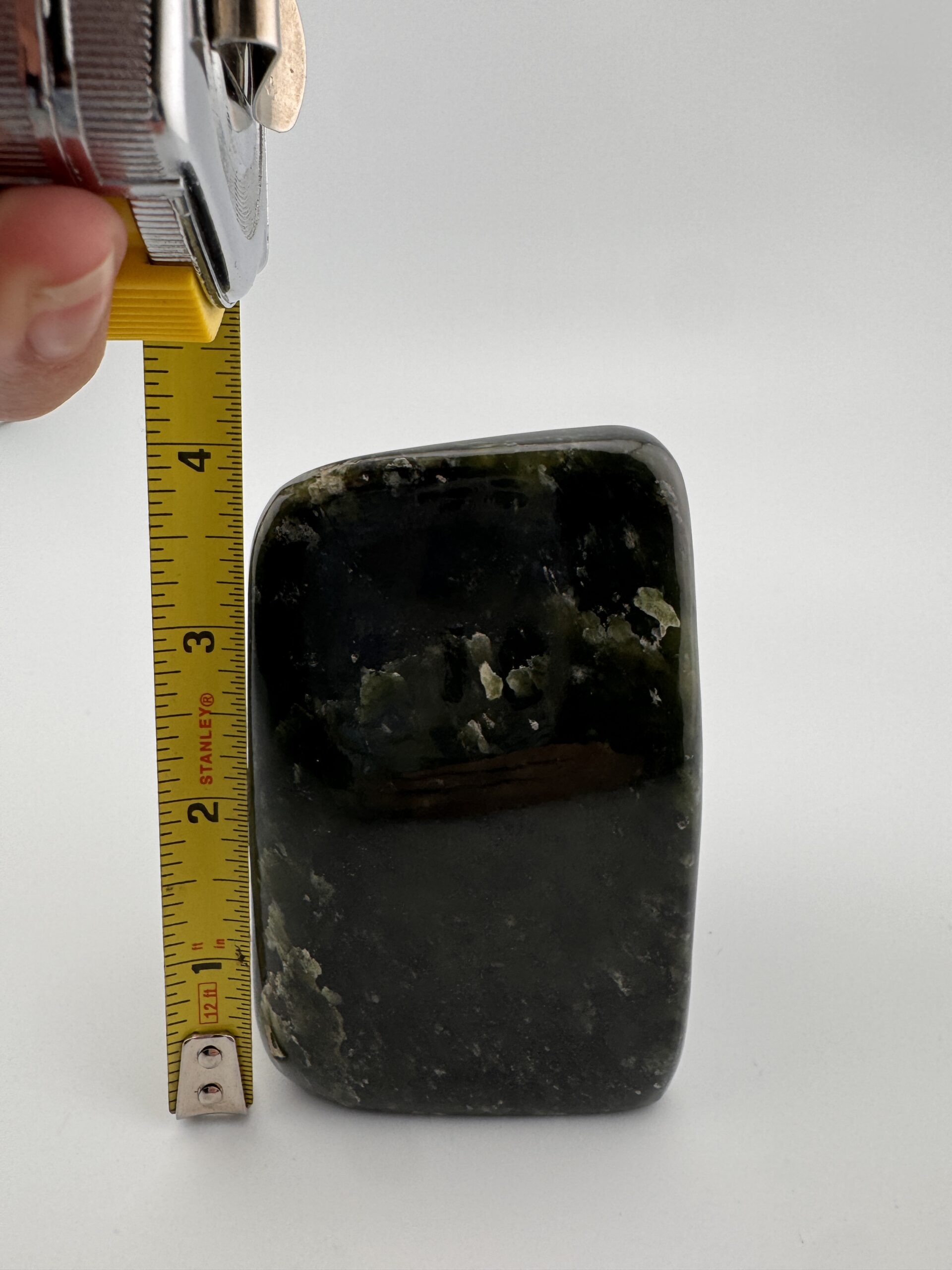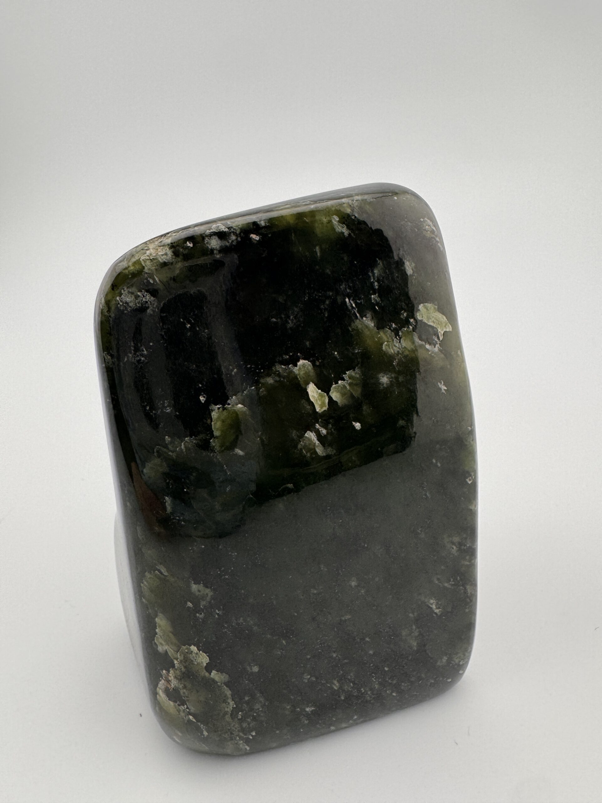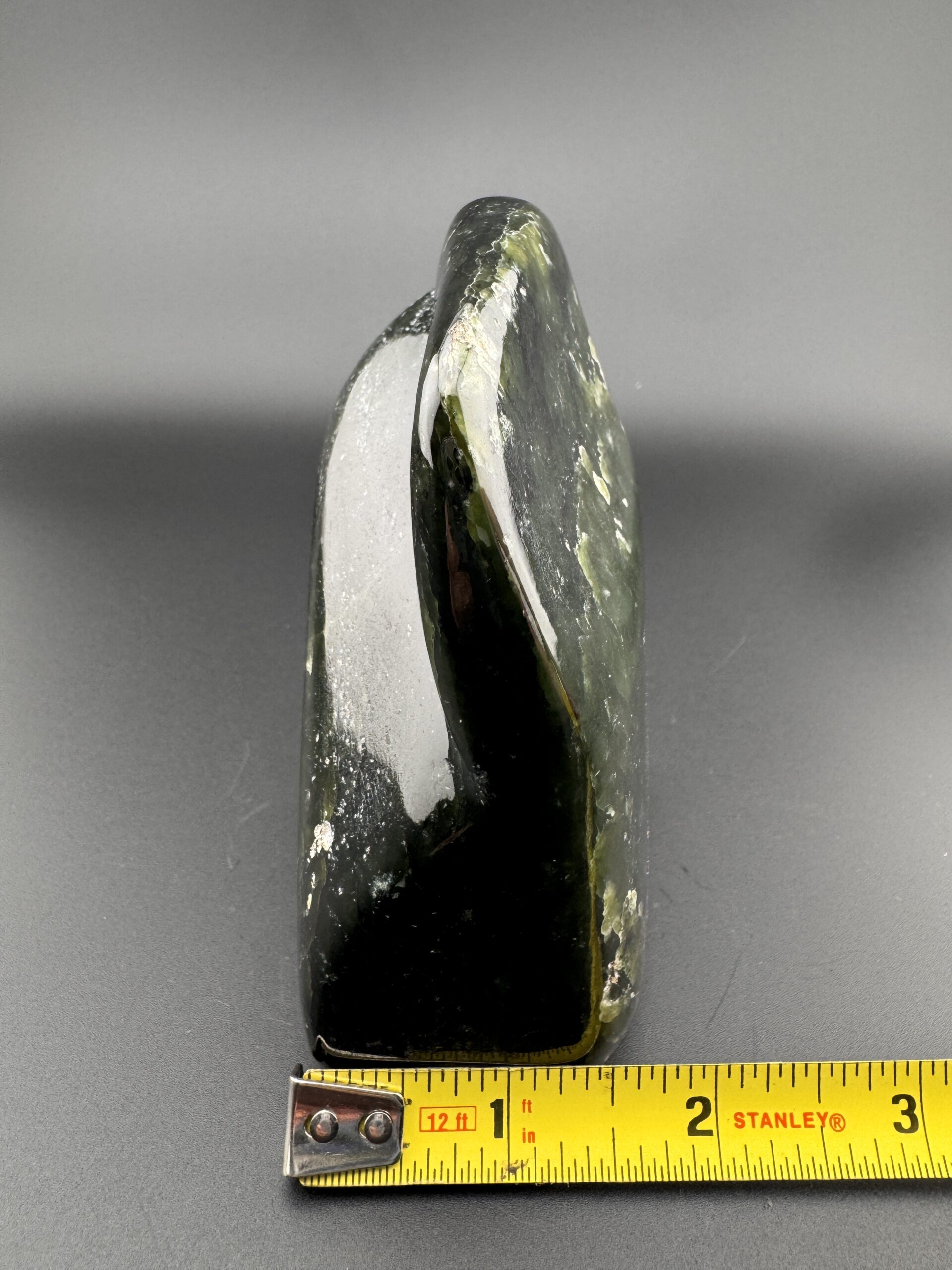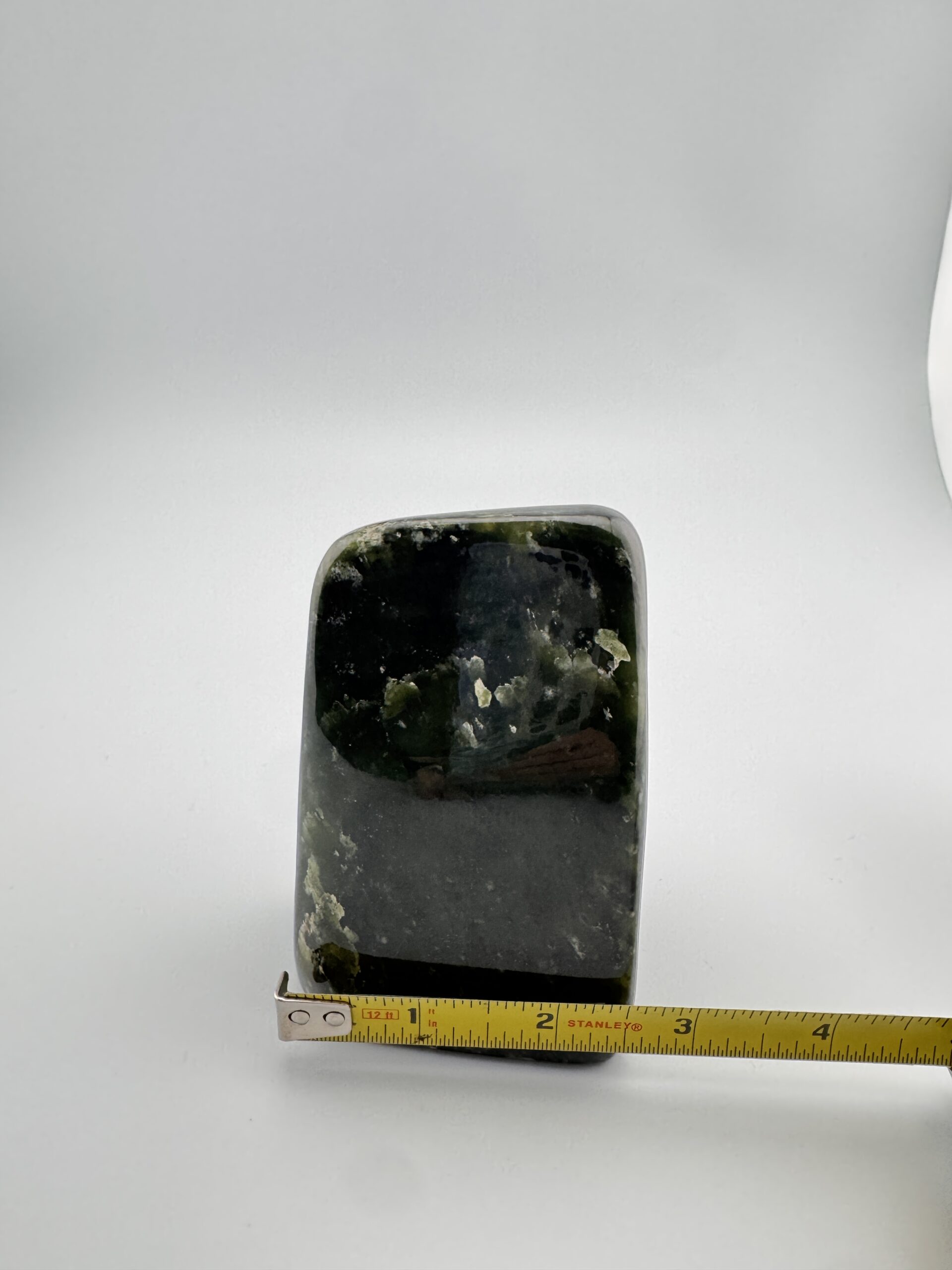This freeform polished Jade piece displays soothing shades of rich green color with a smooth glossy finish.  Each curve and contour highlights the stone’s natural beauty and unique character.  Measuring 2″ x 2.5″ x 4″ and weighing 24 ounces, making it a timeless addition to any collection or as a calming addition in your space.