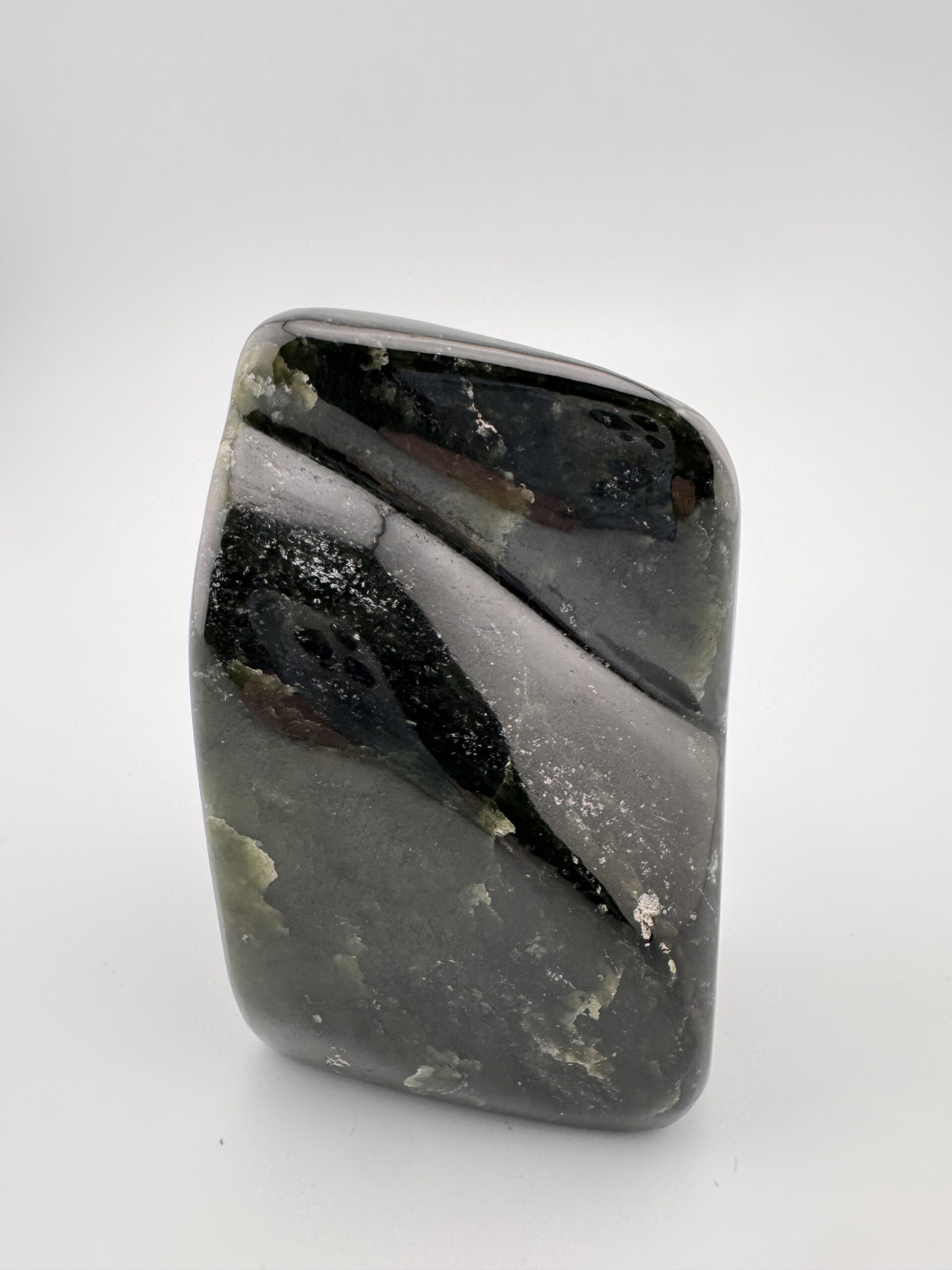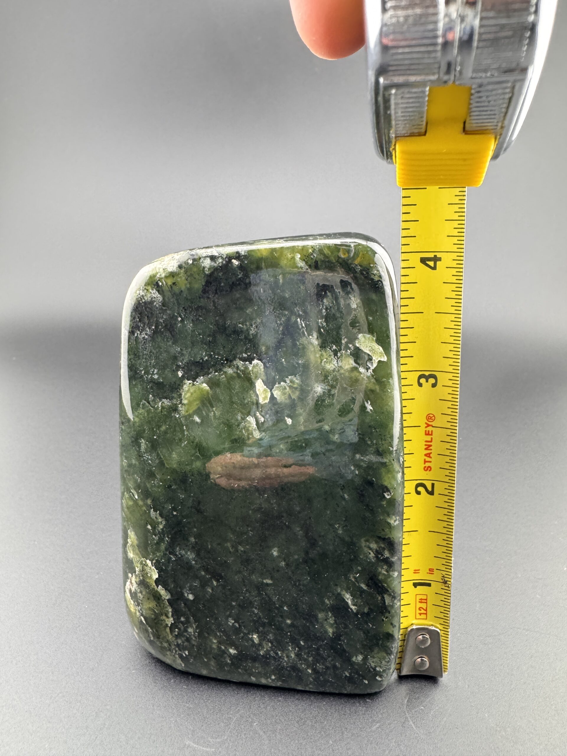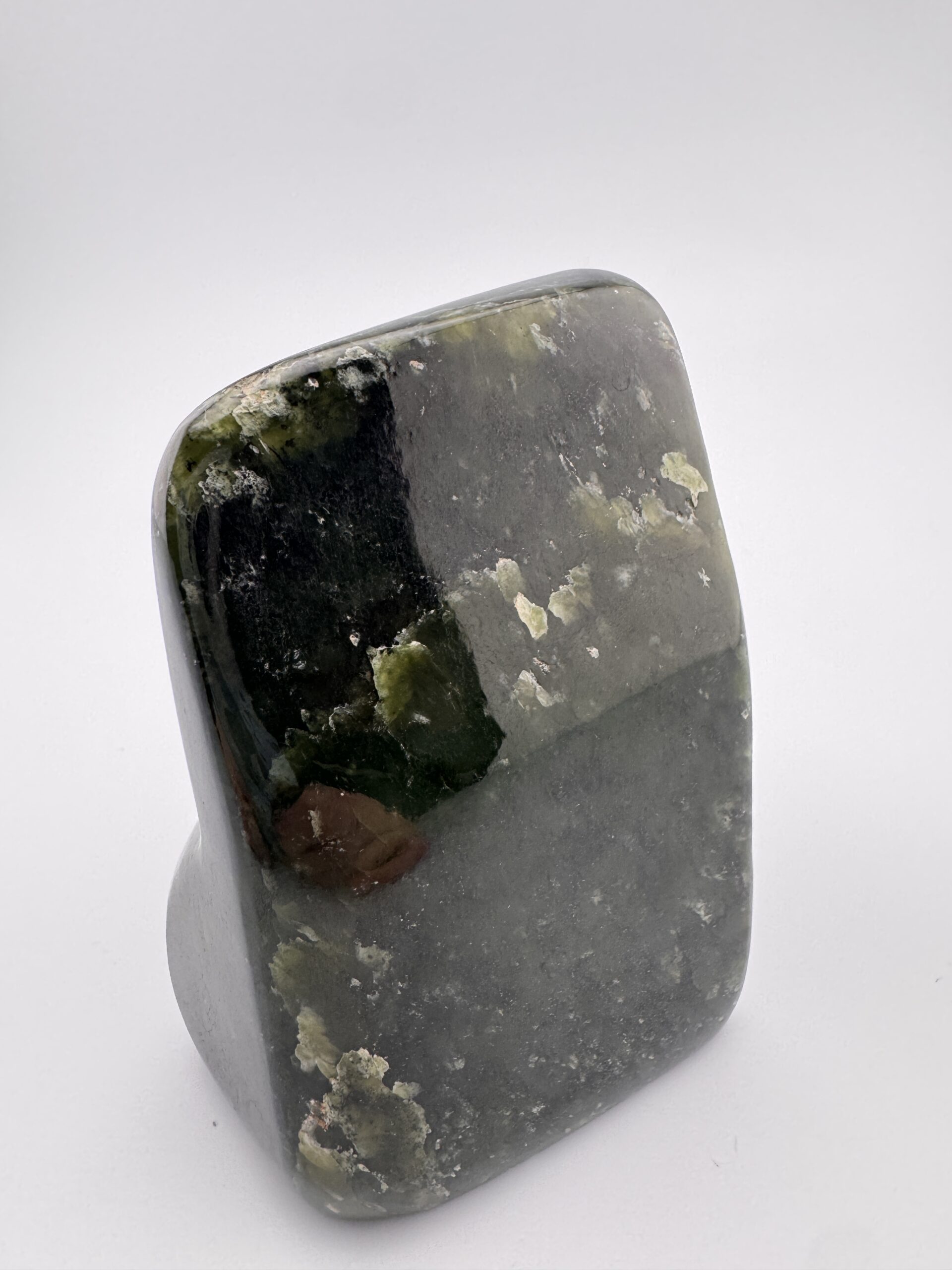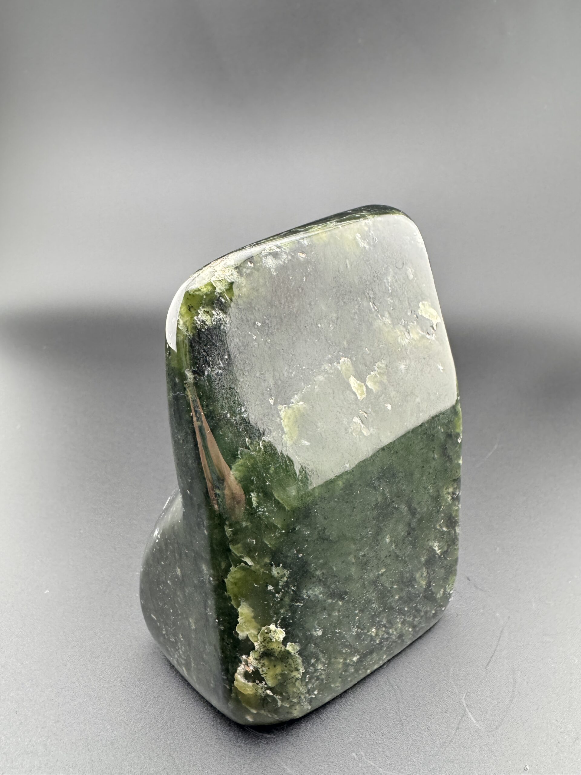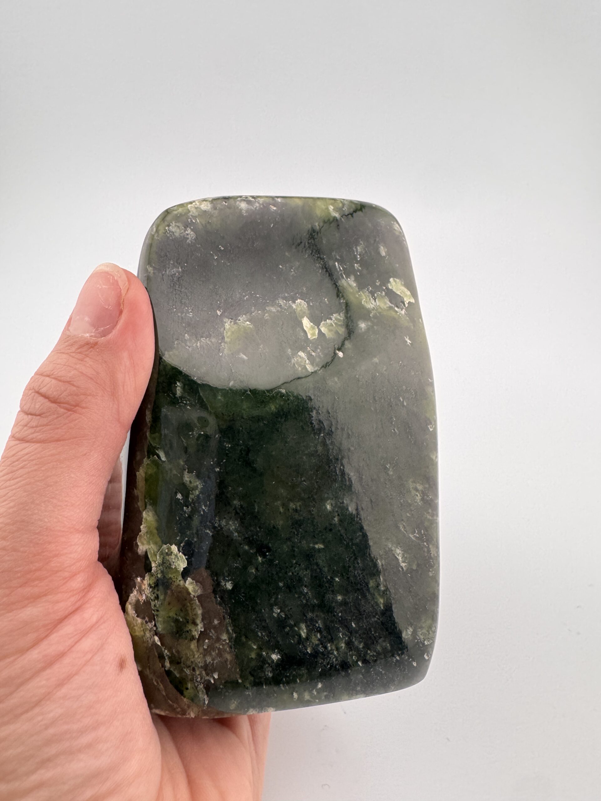 This freeform polished Jade piece displays soothing shades of rich green color with a smooth glossy finish.  Each curve and contour highlights the stone’s natural beauty and unique character.  Measuring 2″ x 2.5″ x 4″ and weighing 24 ounces, making it a timeless addition to any collection or as a calming addition in your space.