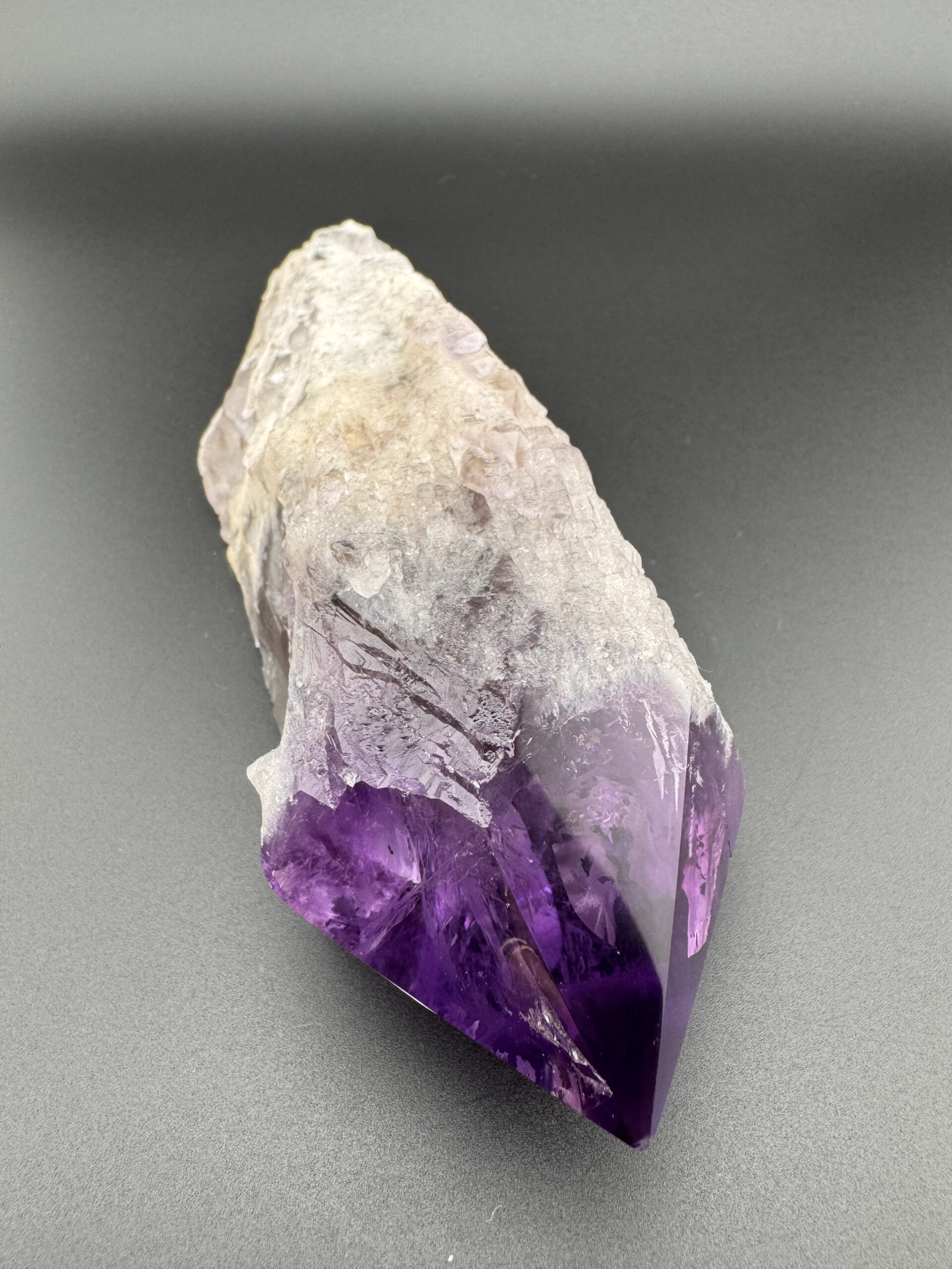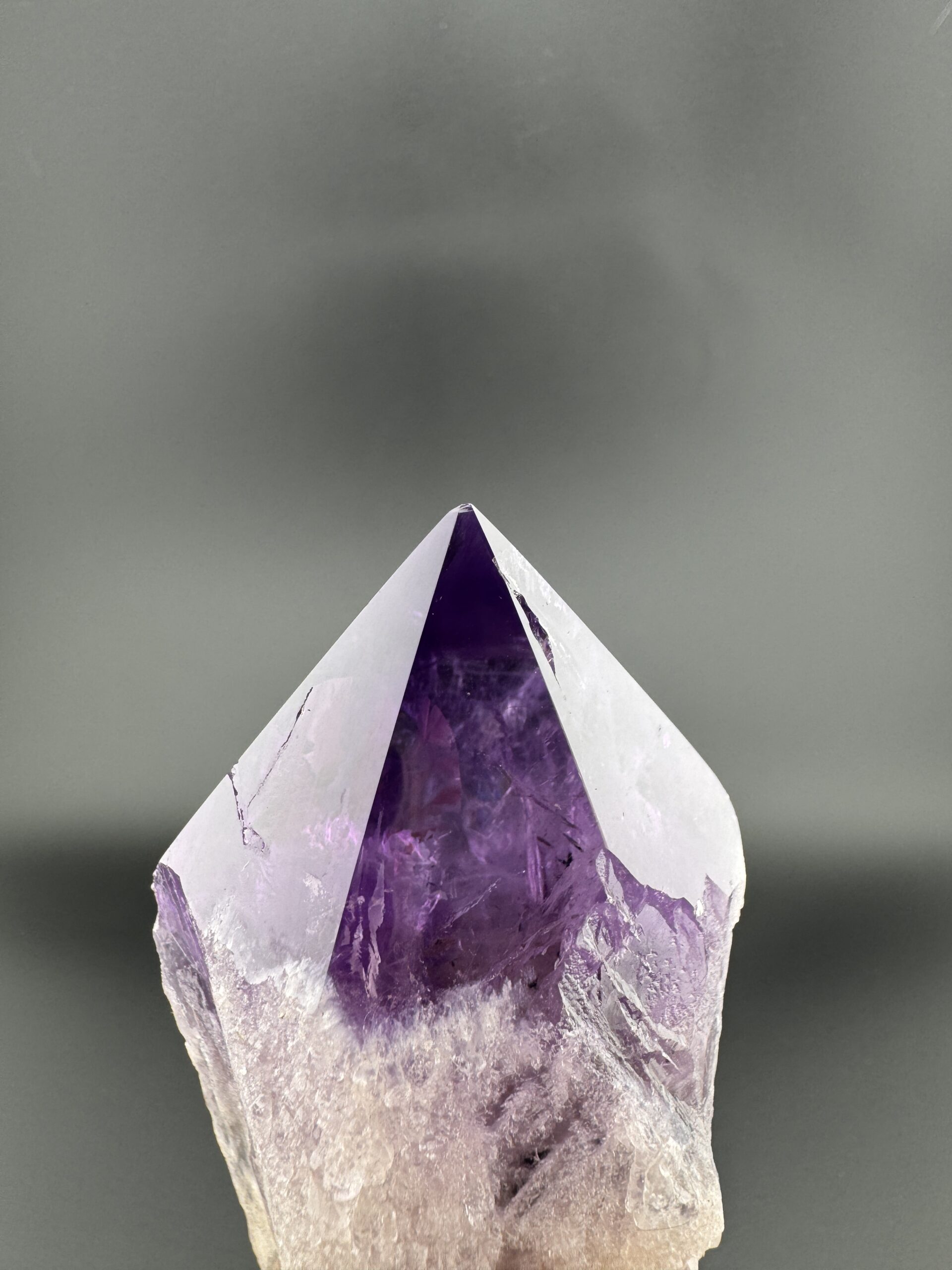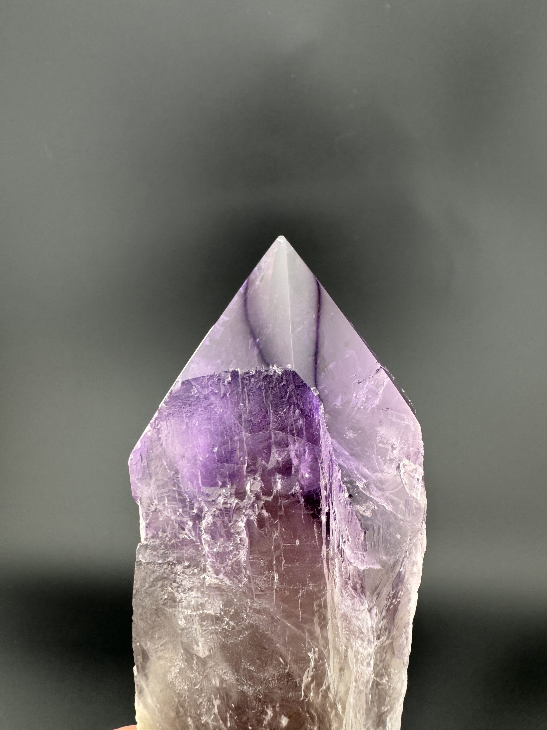 Exceptional natural amethyst point measuring 2″ x 7.5″ x 2″ and displaying the perfect purple-to-clear color gradient that collectors prize most. This specimen was selected for its superior crystal termination and clarity.