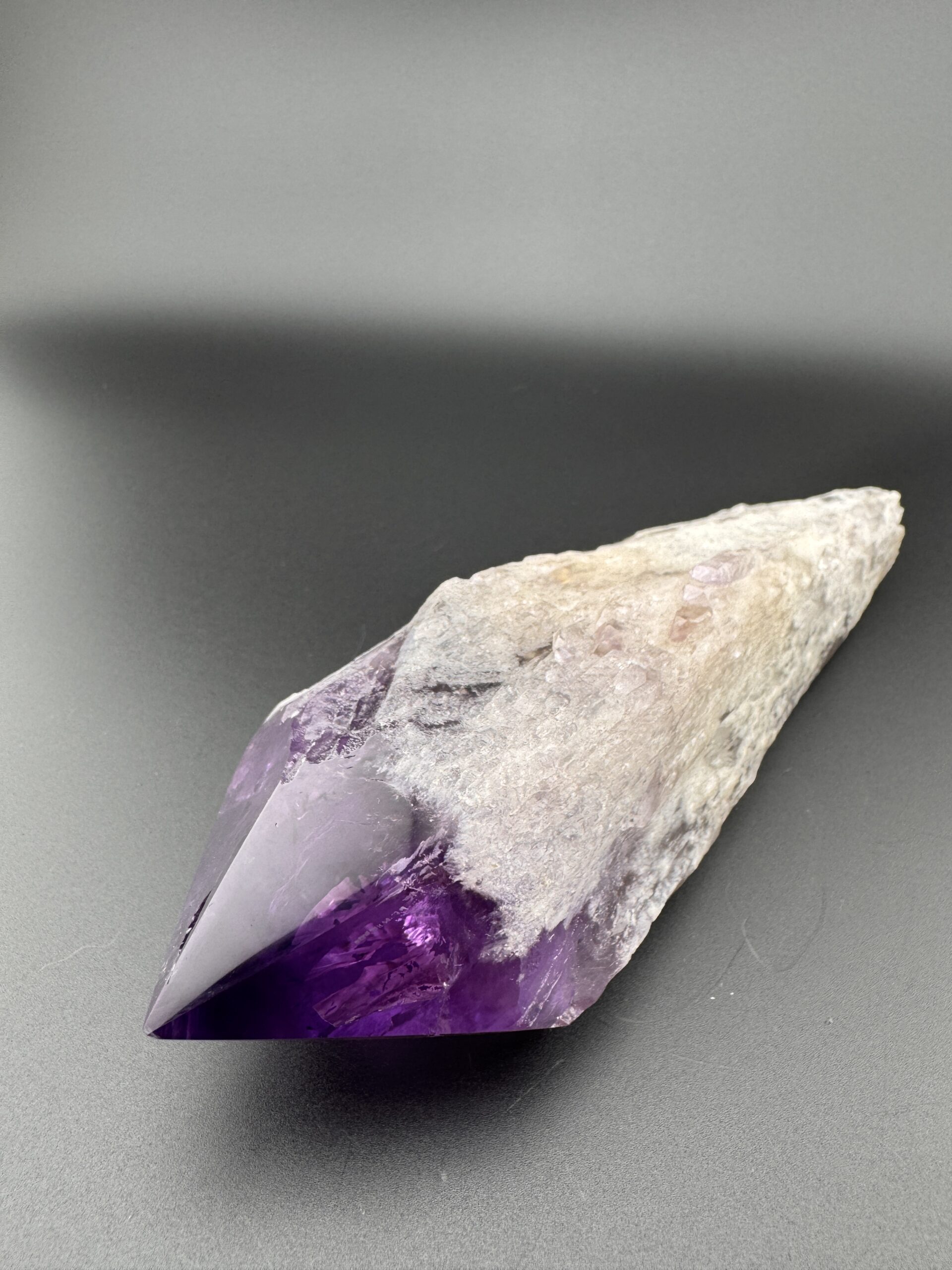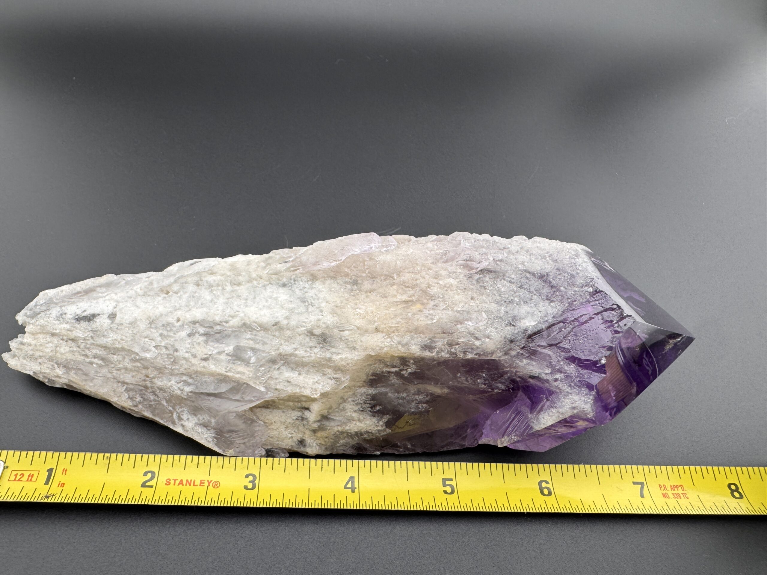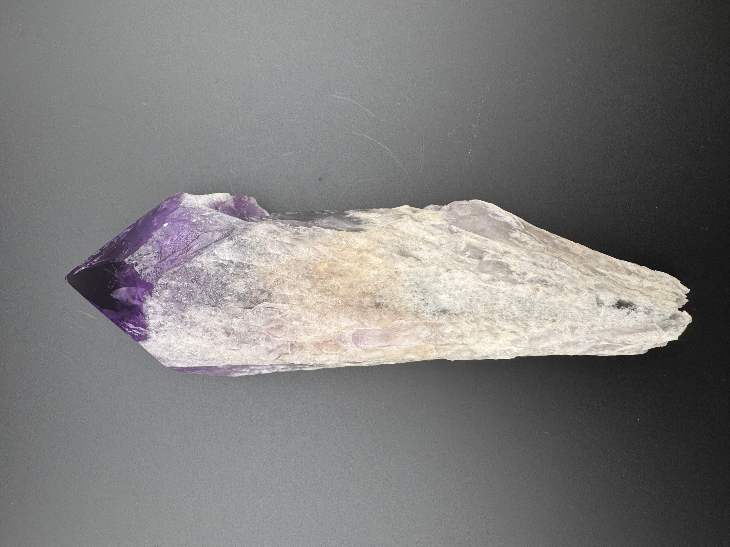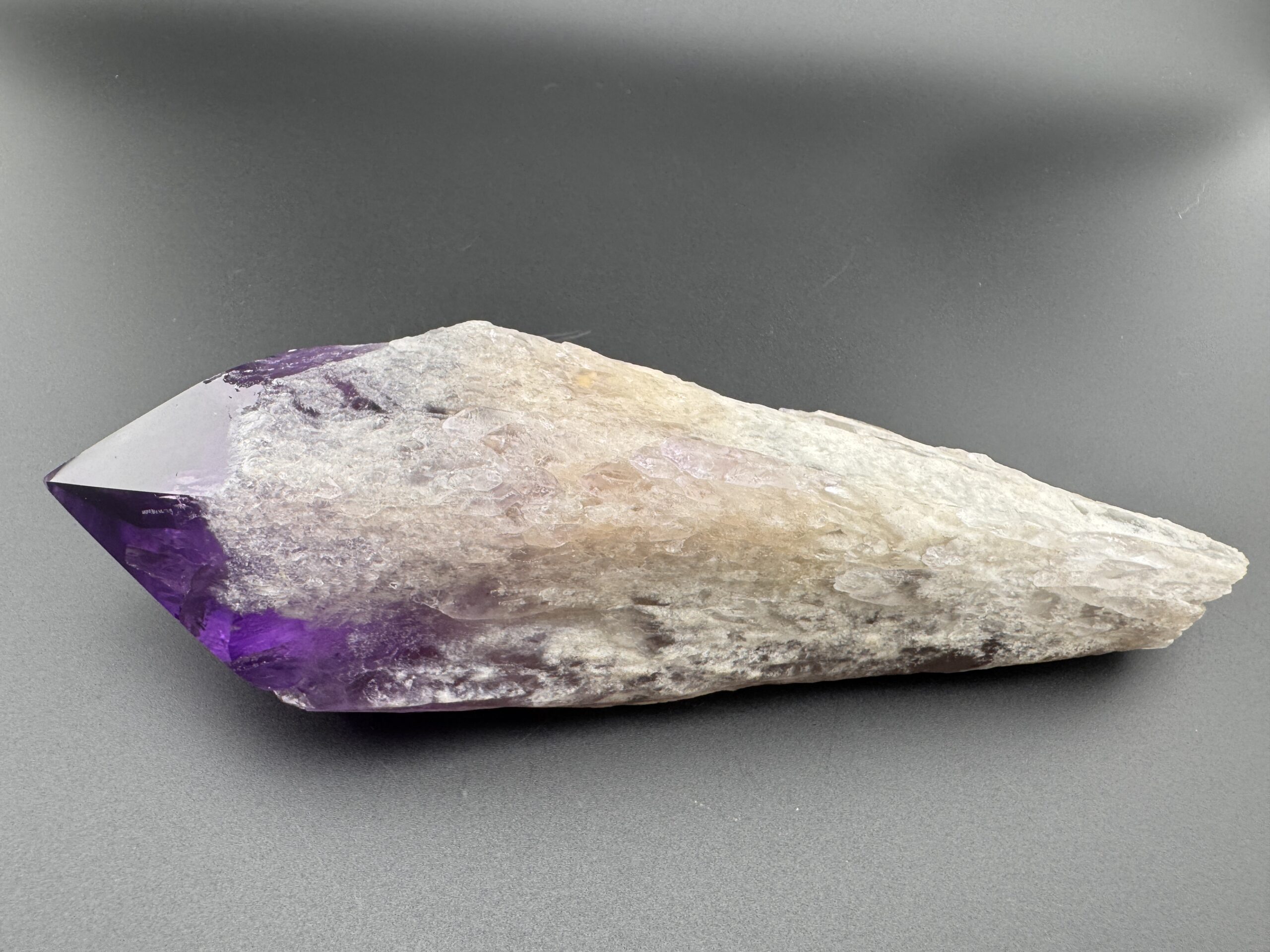 Exceptional natural amethyst point measuring 2″ x 7.5″ x 2″ and displaying the perfect purple-to-clear color gradient that collectors prize most. This specimen was selected for its superior crystal termination and clarity.