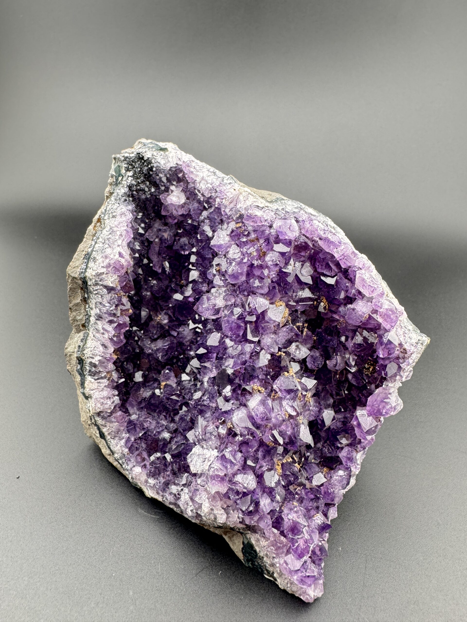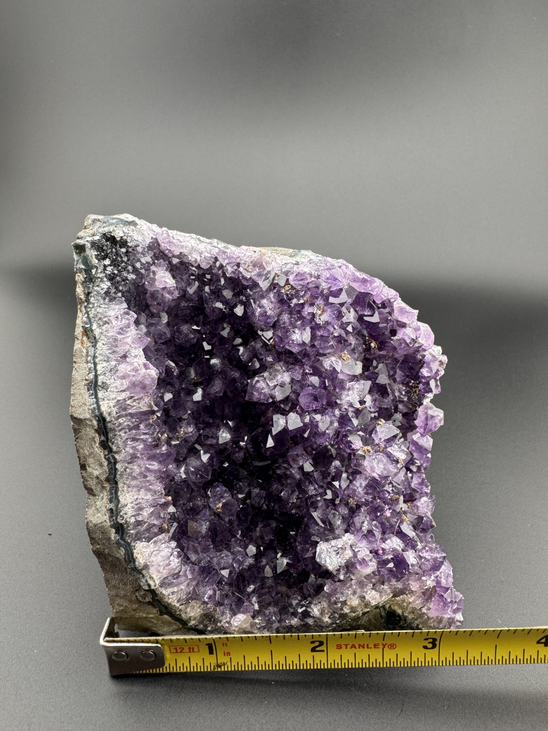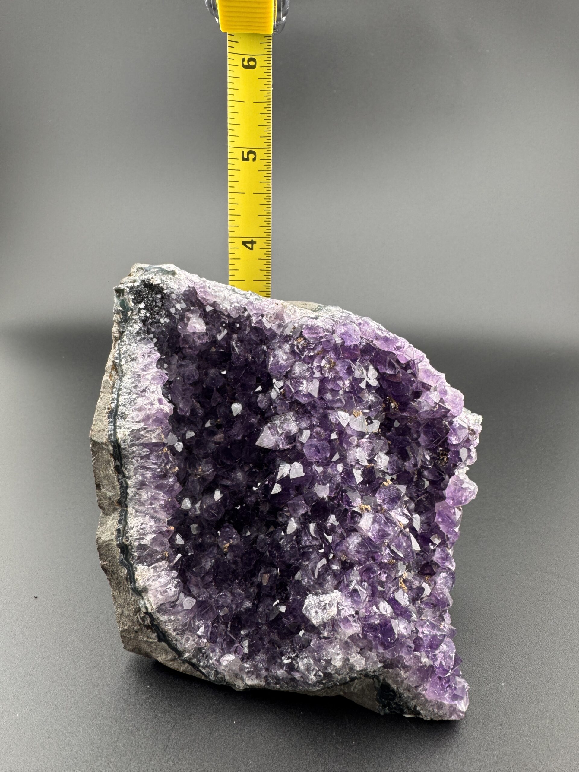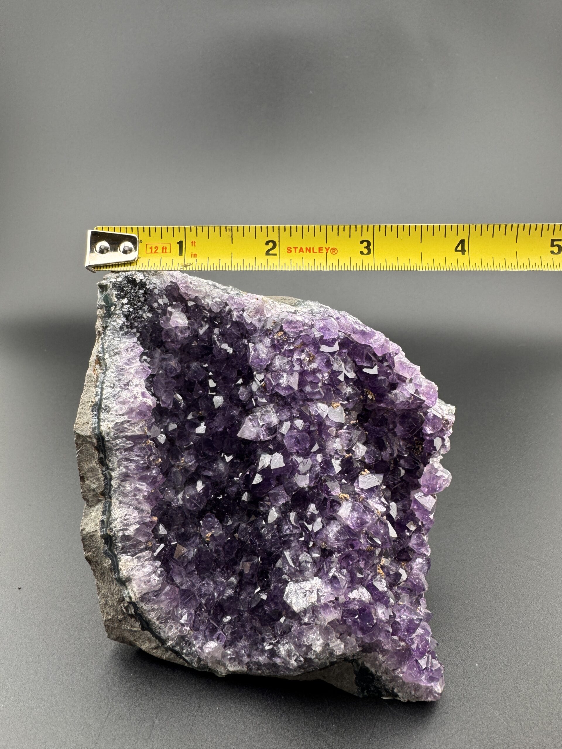 This stunning 21 ounce Amethyst features rich purple crystals that shimmer beautifully under light. Measuring approximately 4″ x 2.5″ x 4″, it displays a natural, open formation with sparkling points and raw edges that highlight the natural beauty of Brazilian Amethyst.