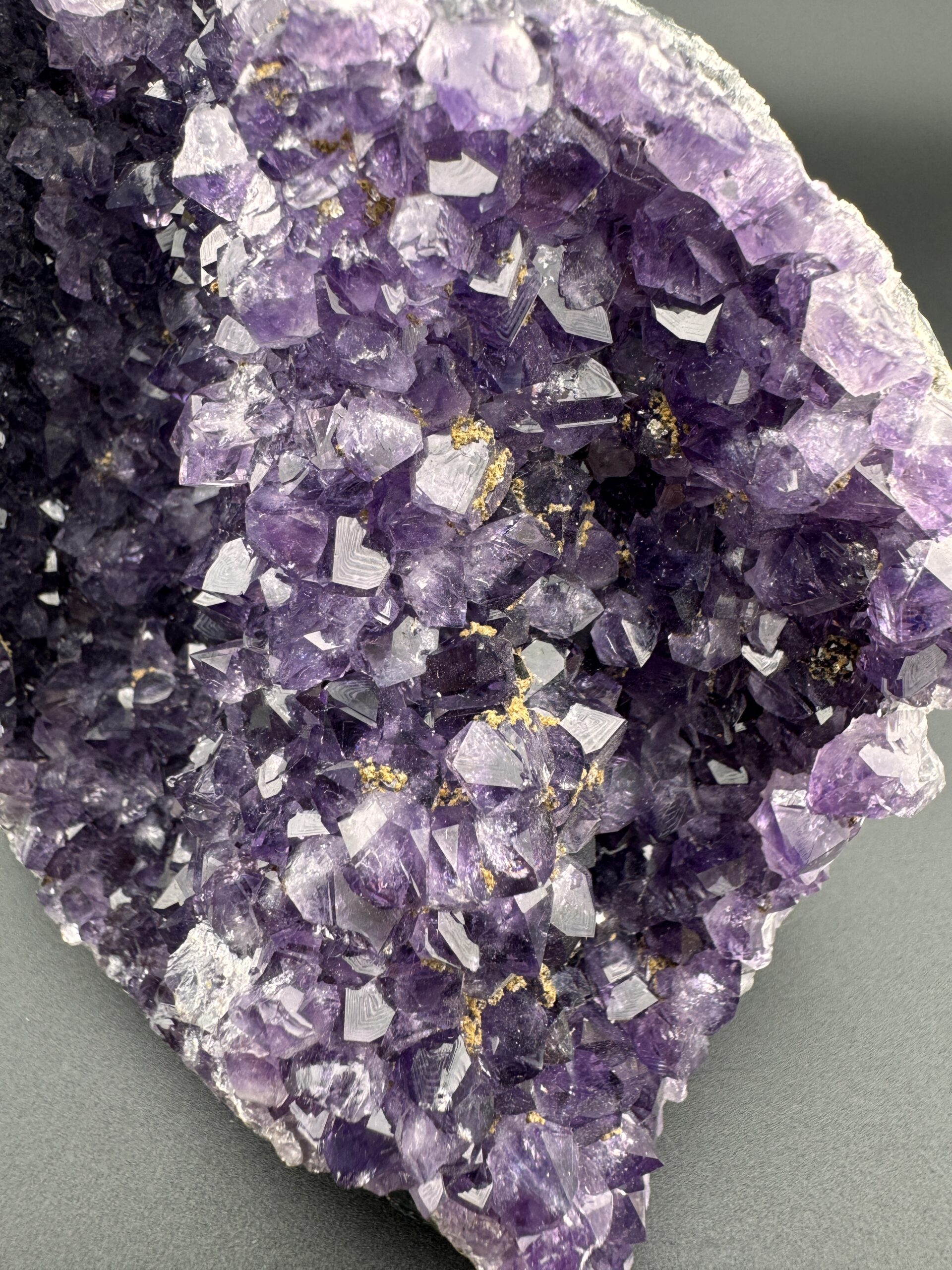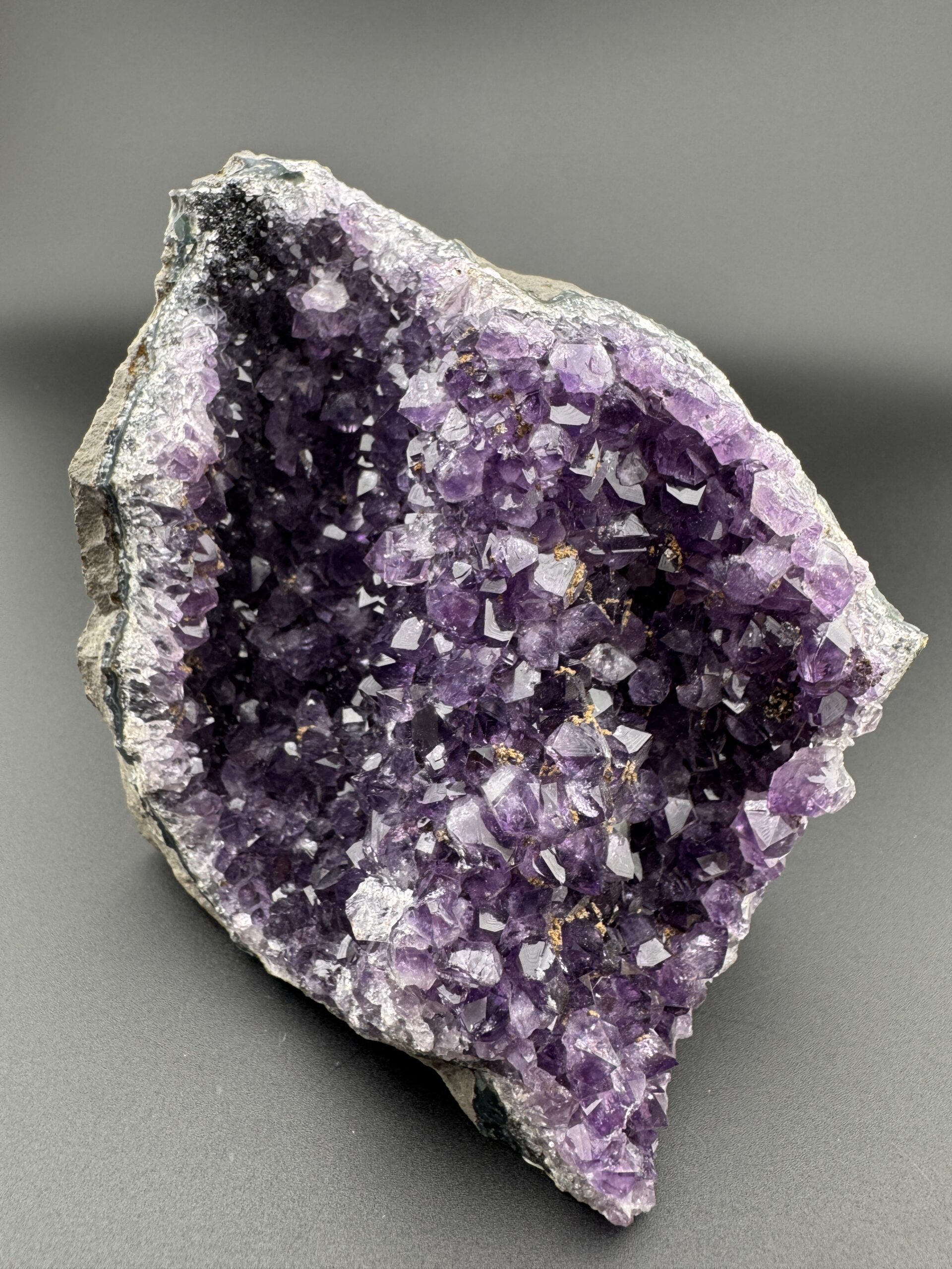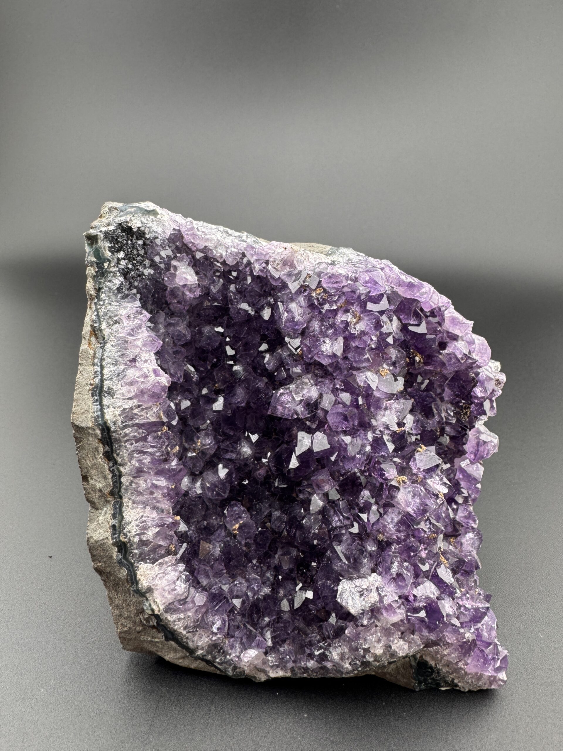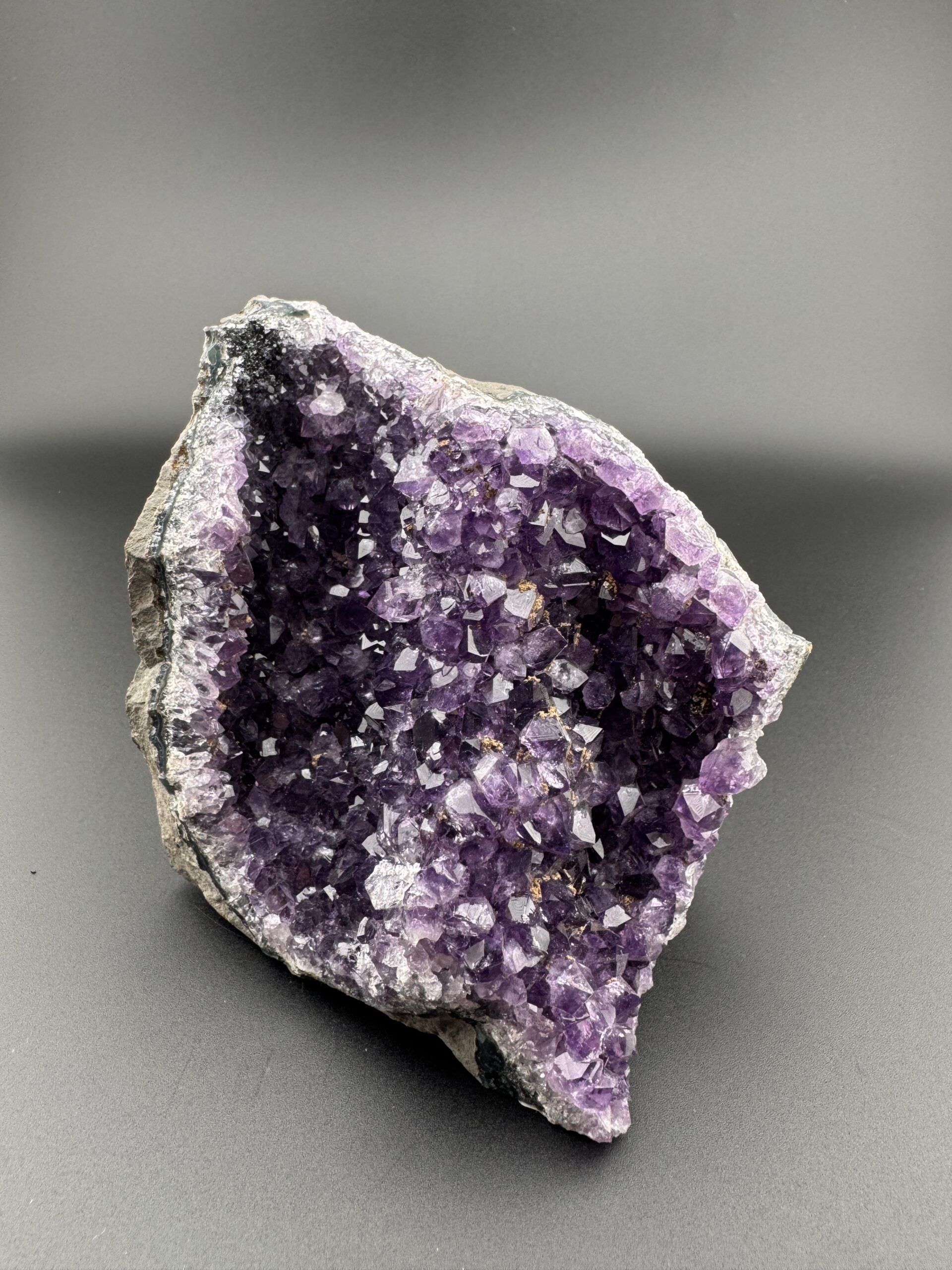 This stunning 21 ounce Amethyst features rich purple crystals that shimmer beautifully under light. Measuring approximately 4″ x 2.5″ x 4″, it displays a natural, open formation with sparkling points and raw edges that highlight the natural beauty of Brazilian Amethyst.