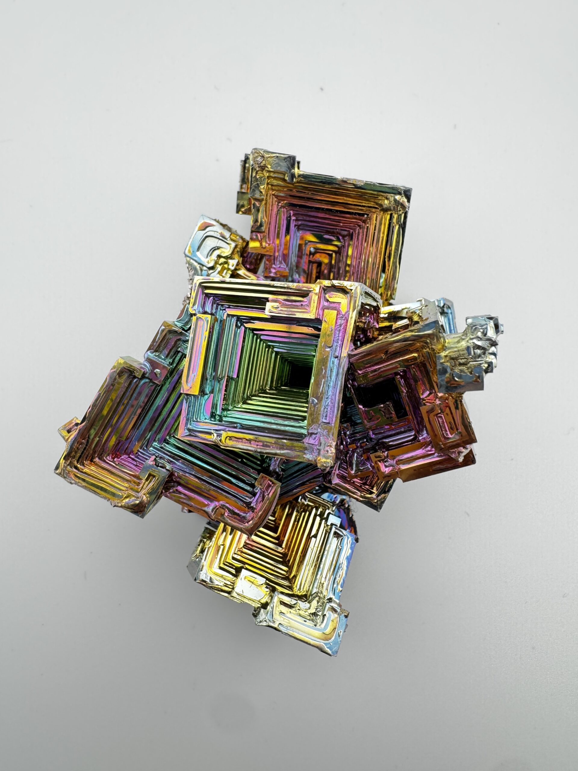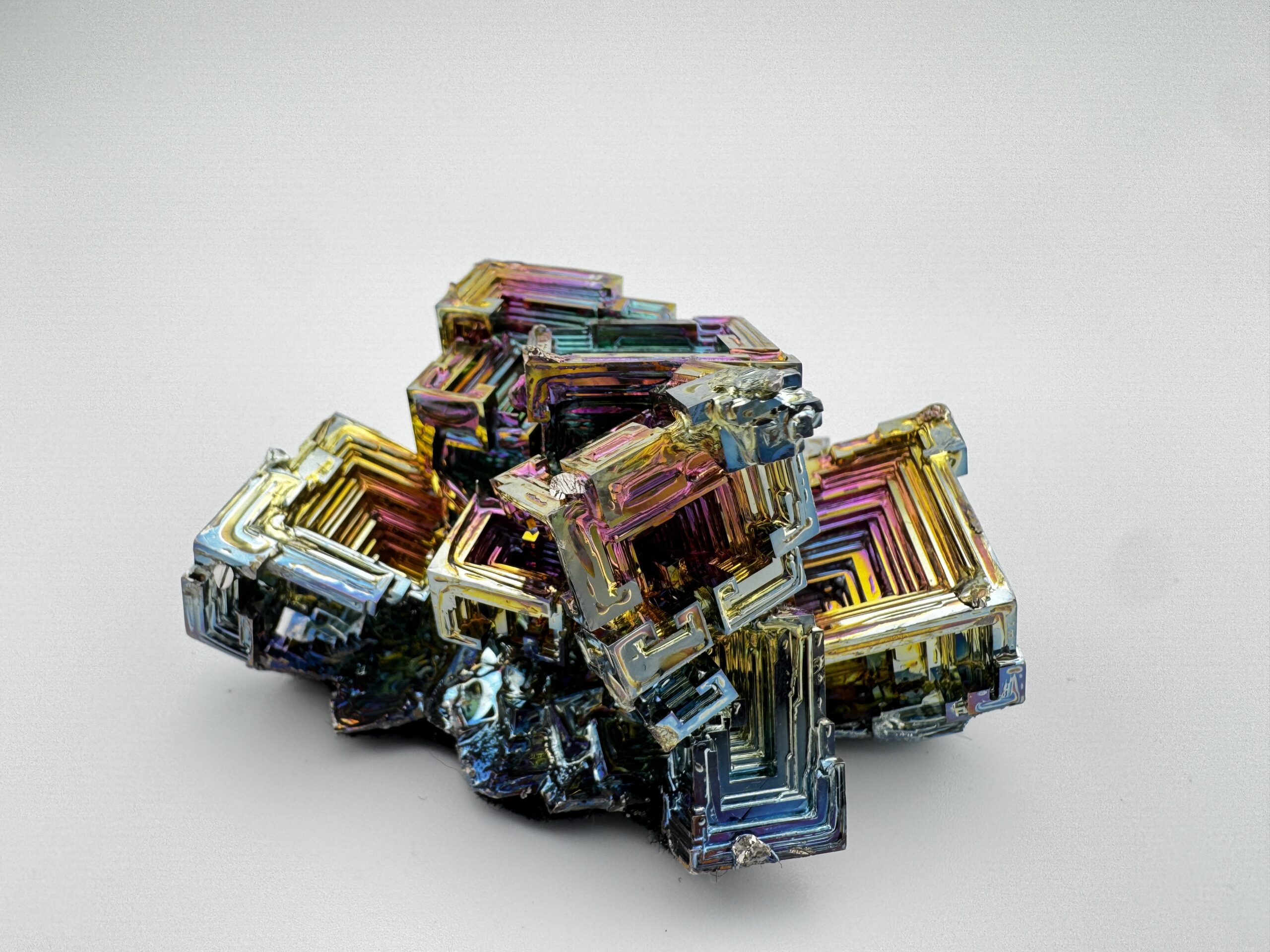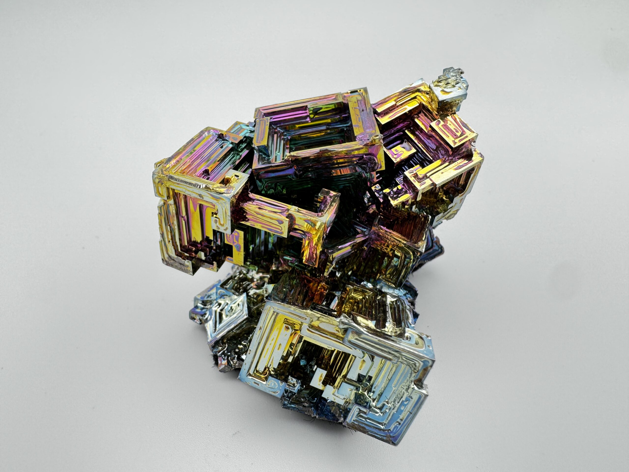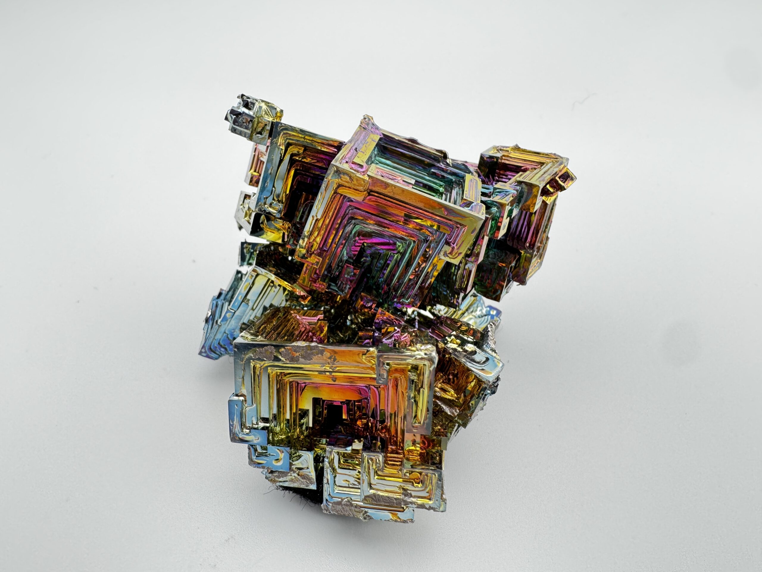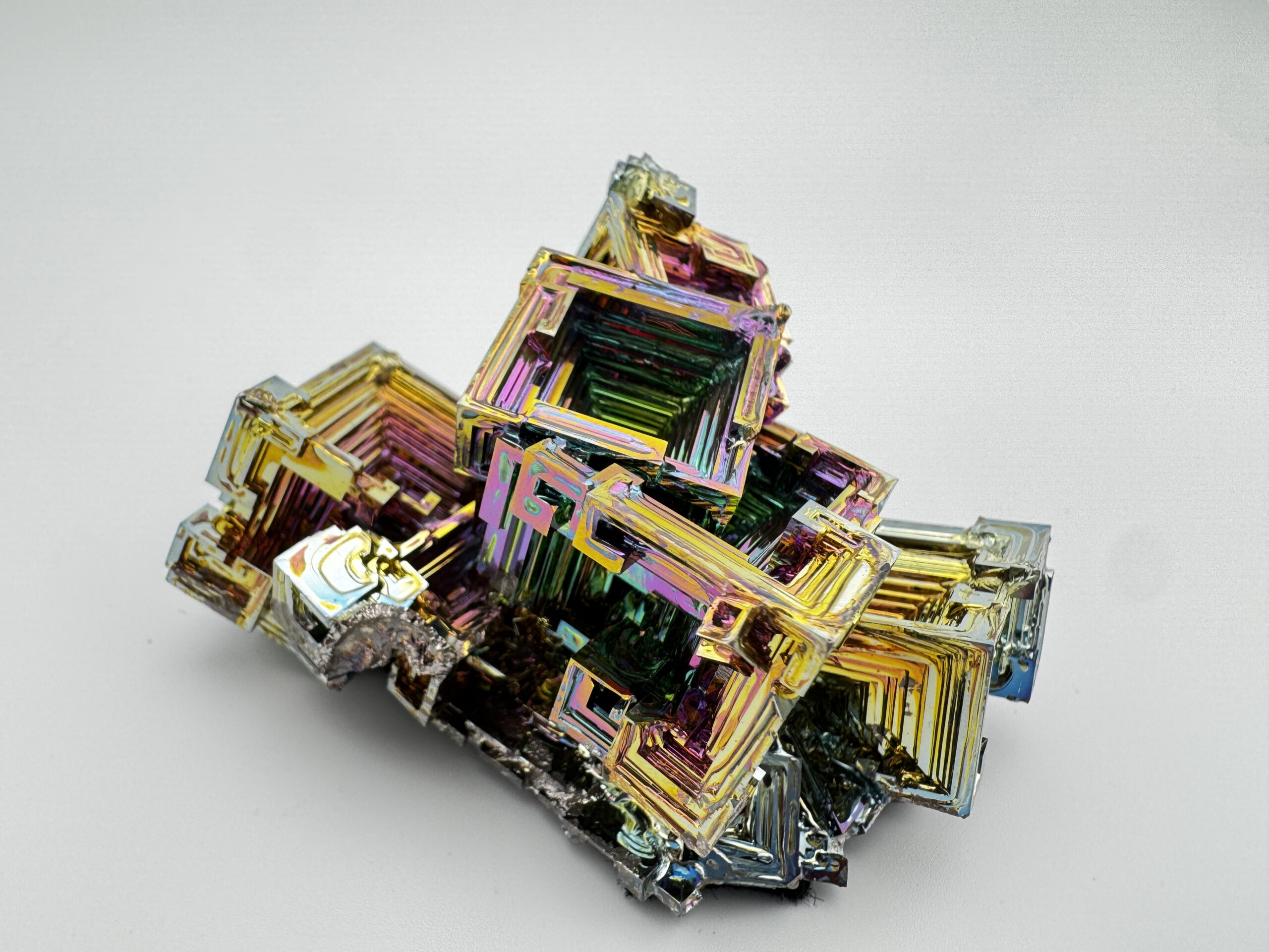 While natural bismuth rarely forms large crystals, controlled laboratory conditions allow these spectacular formations to develop. The rainbow colors result from a thin oxide layer that forms on the crystal surface, creating interference patterns that shift as viewing angle changes.