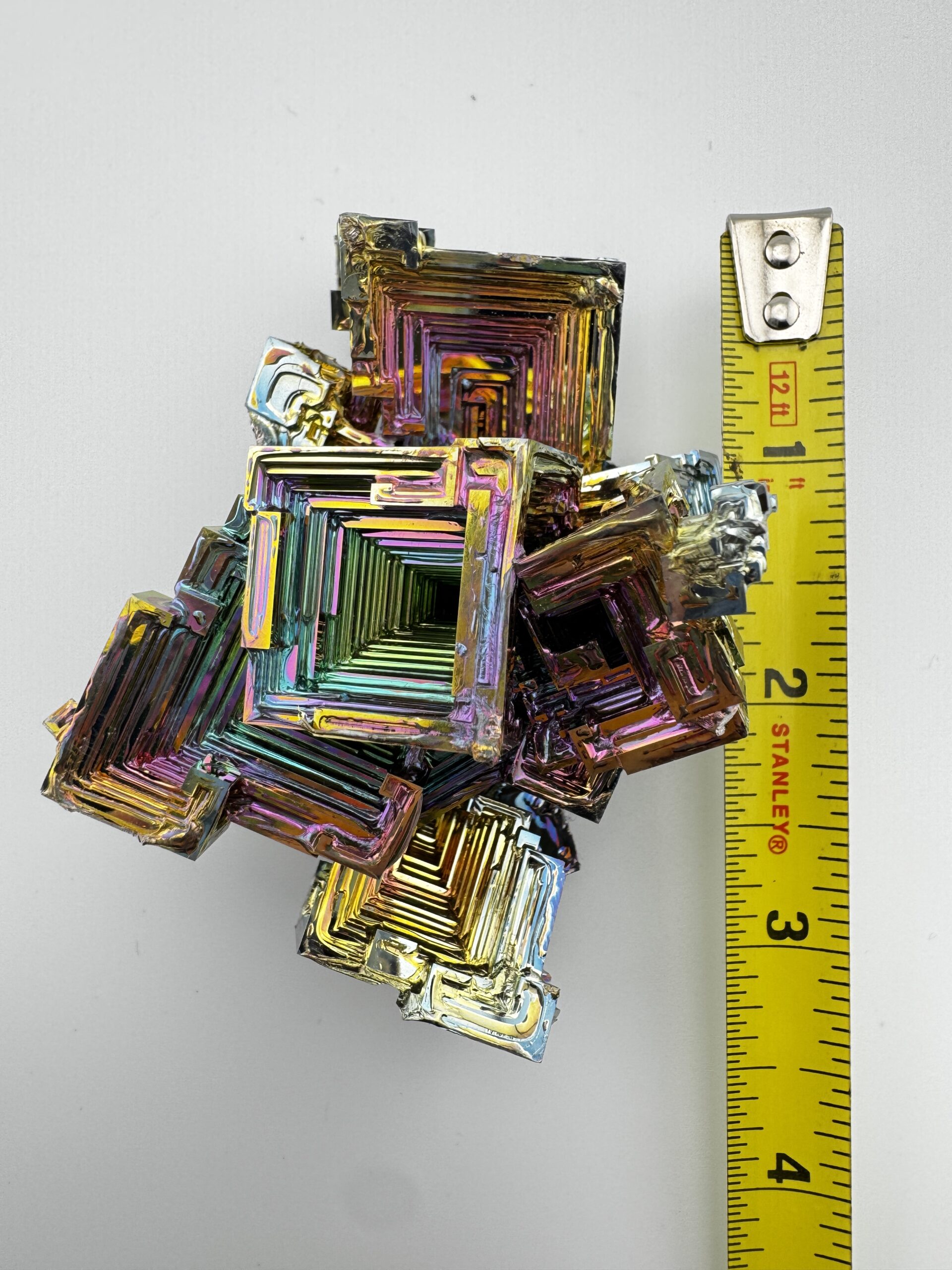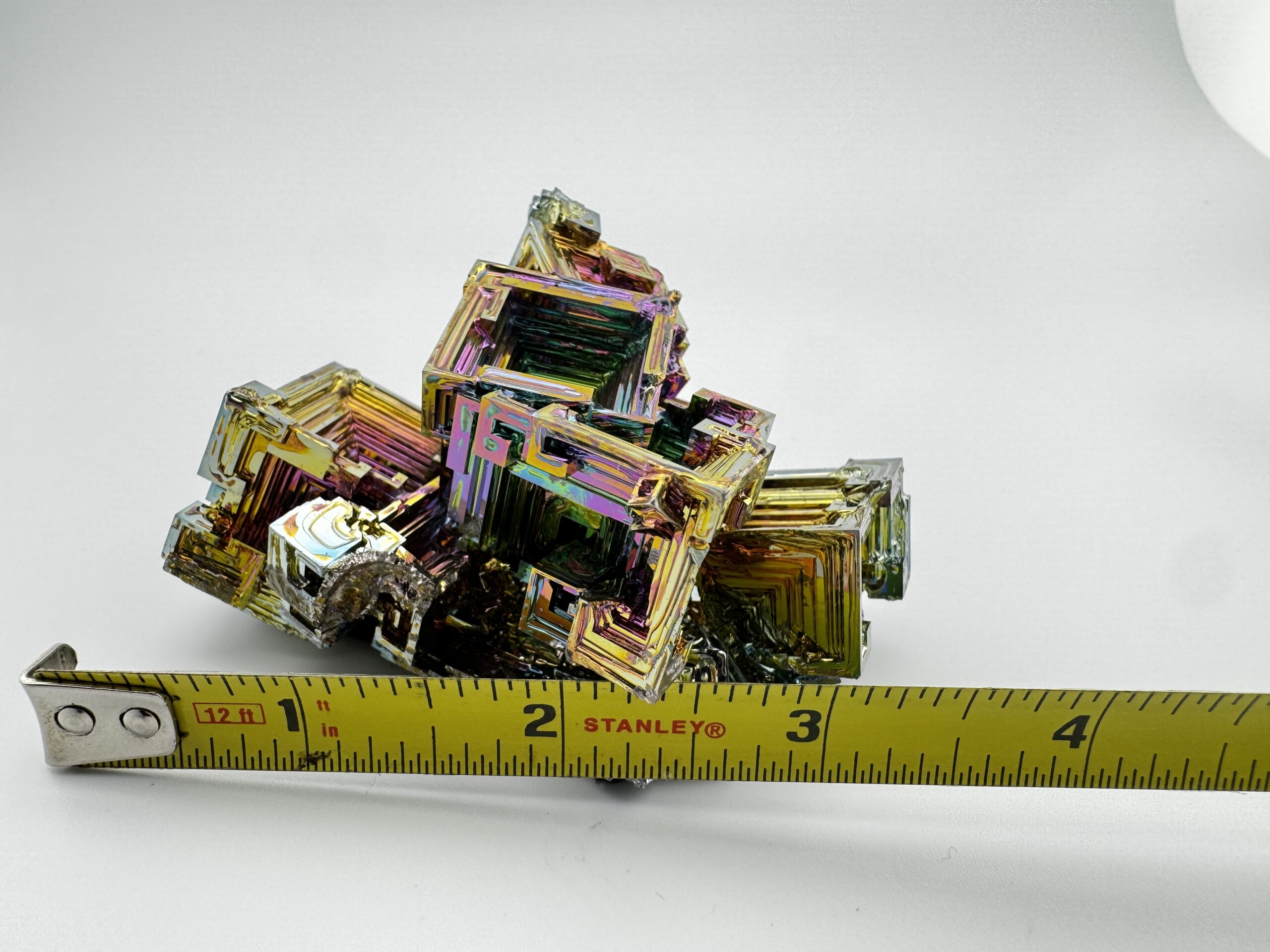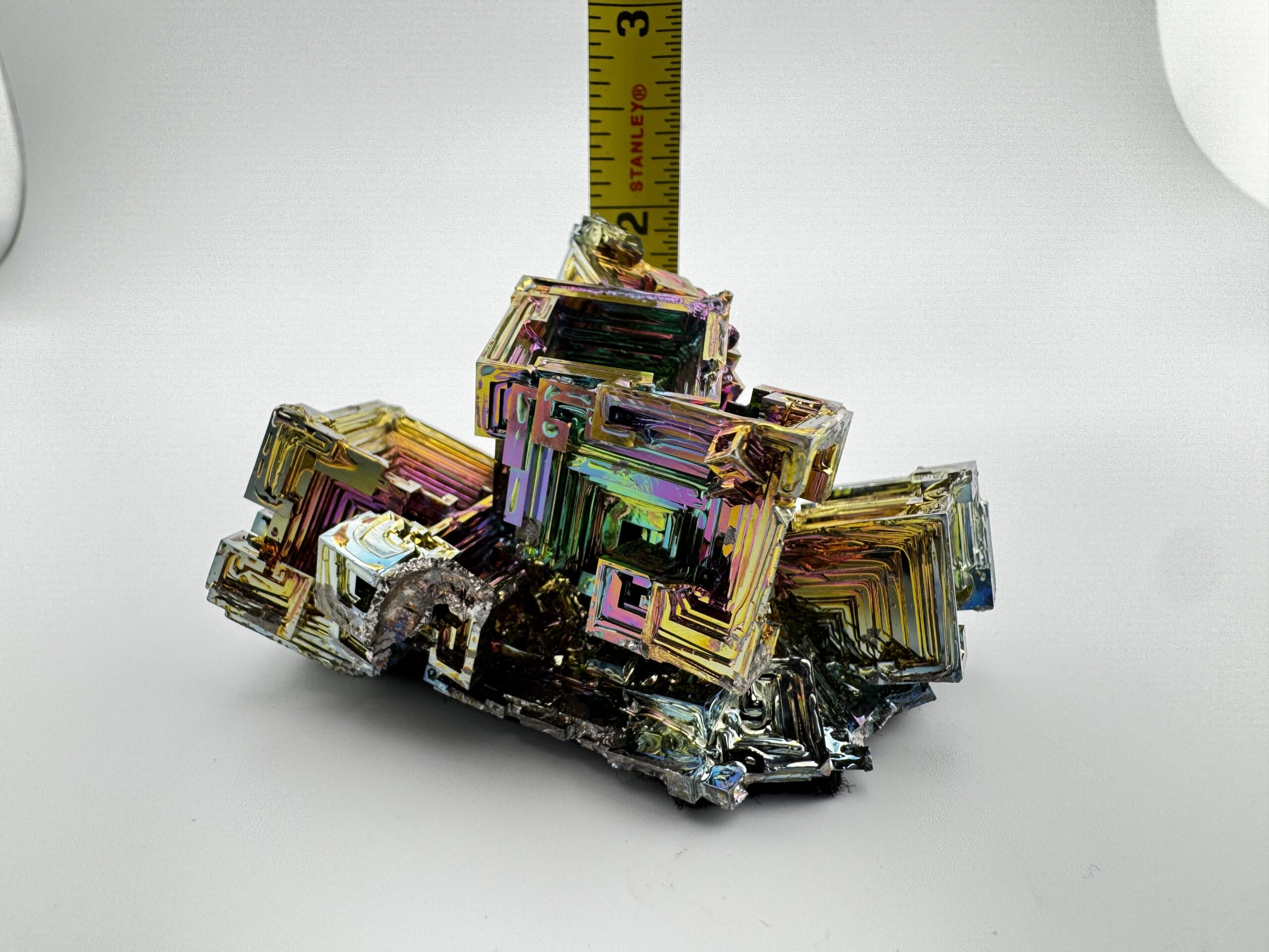 Laboratory-grown geometric perfection – this spectacular bismuth crystal displays the brilliant rainbow iridescence and stepped crystal formations that make bismuth a modern collector favorite. The geometric precision rivals nature’s finest crystal work.