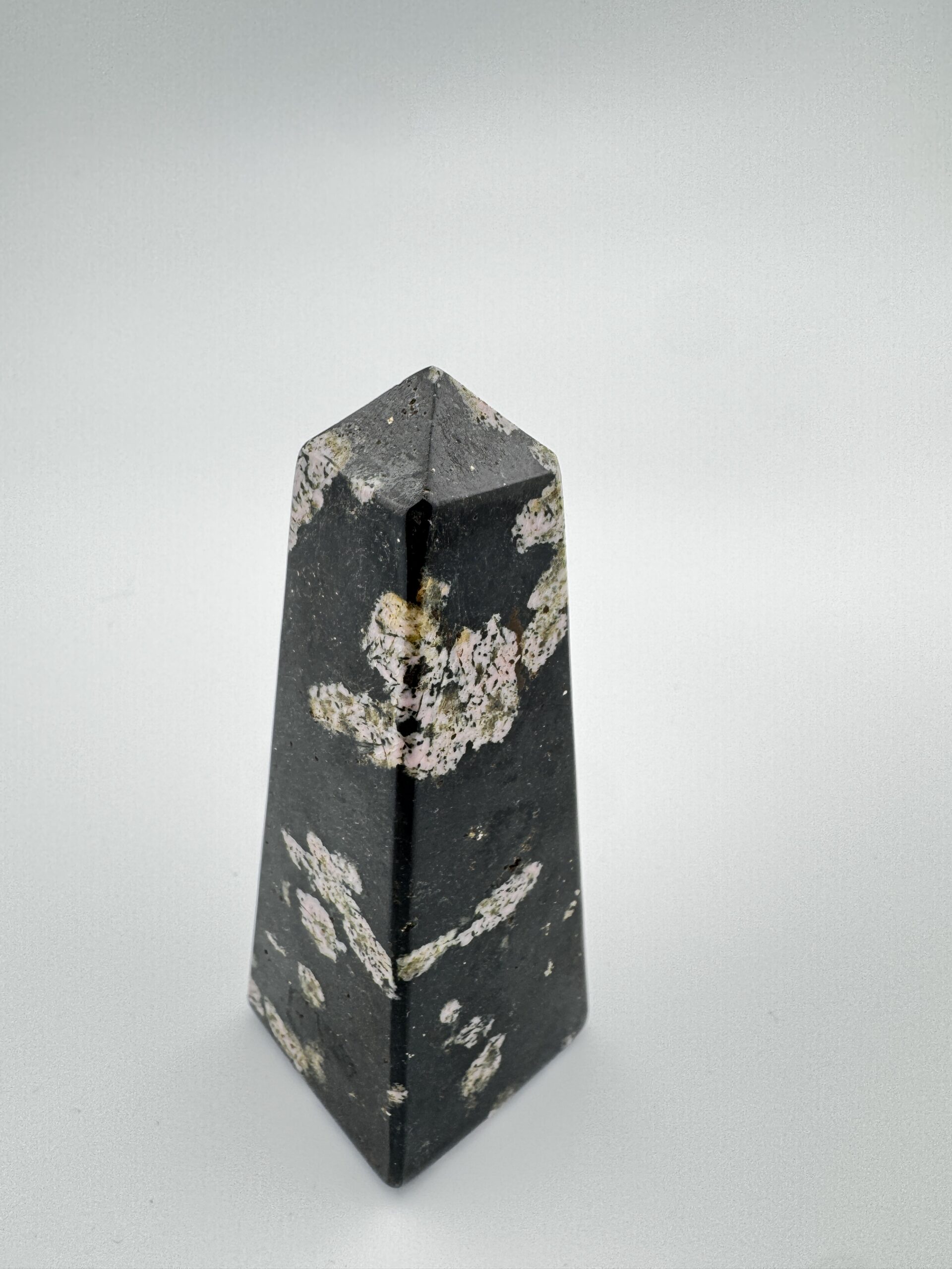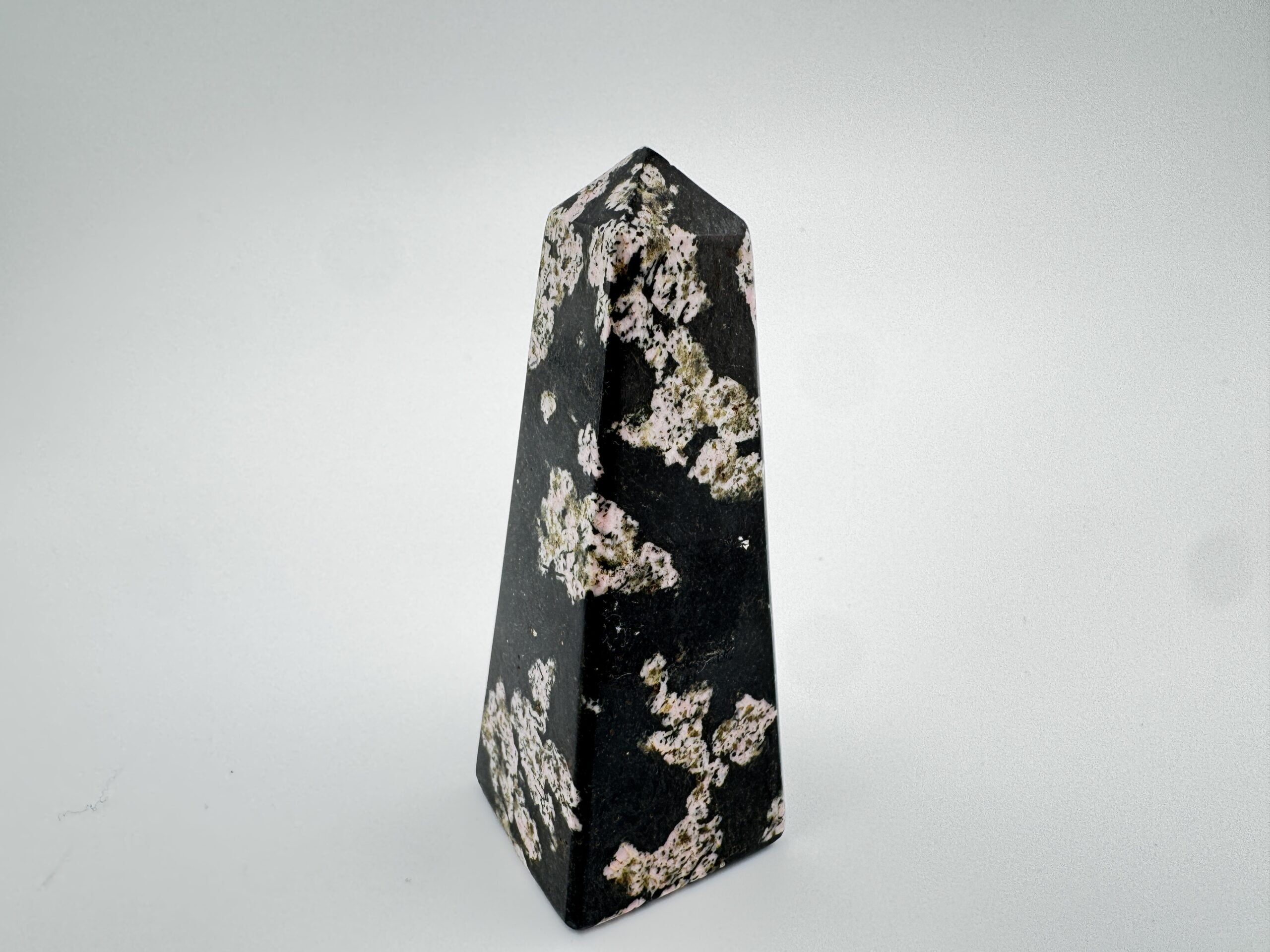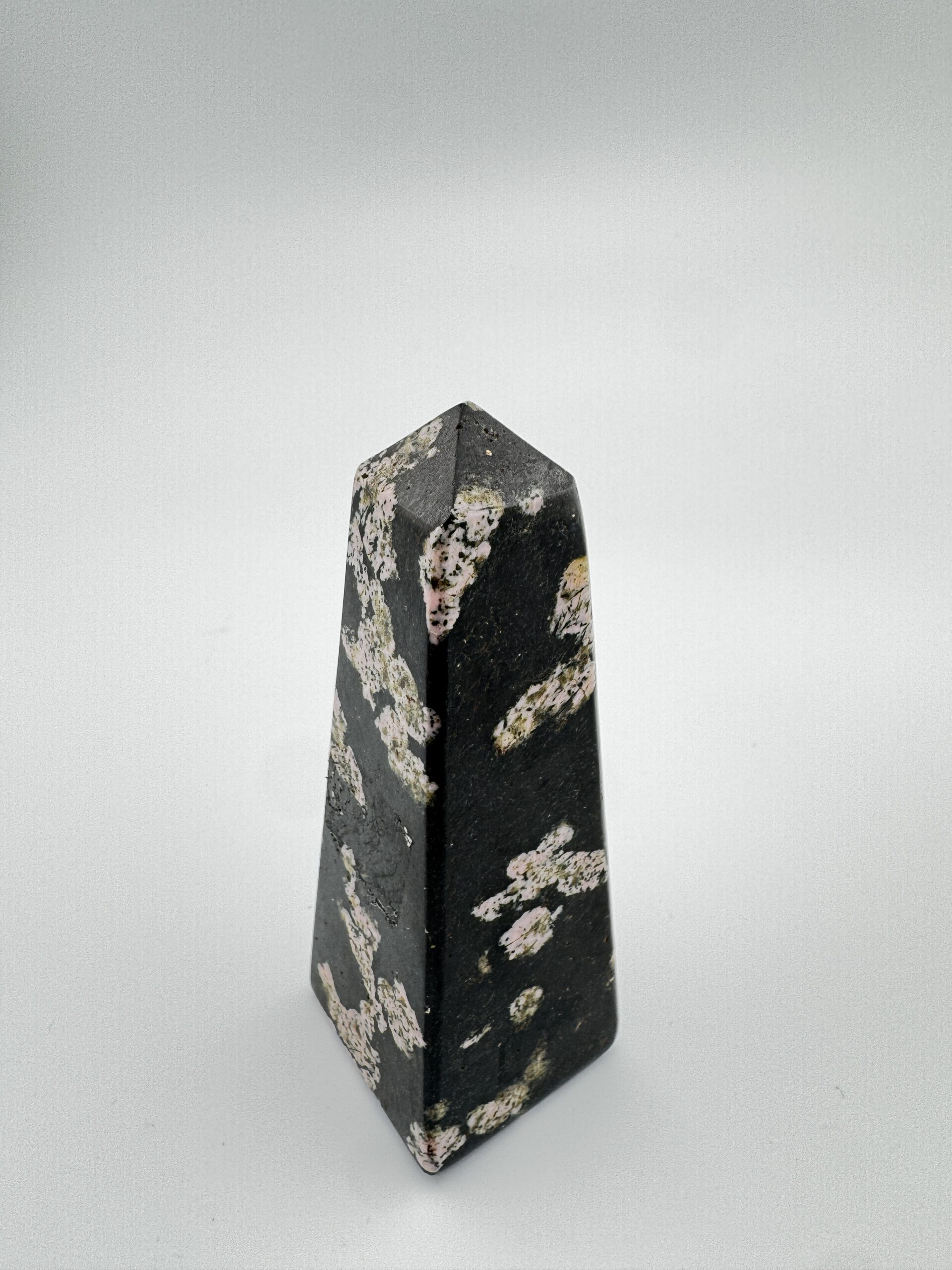 Natural artwork that no human craftsman could replicate – this striking combination formed when pink manganese-rich thulite intruded into existing black jade deposits. The result is a stunning polished tower showcasing nature’s ability to create perfect artistic contrasts.
