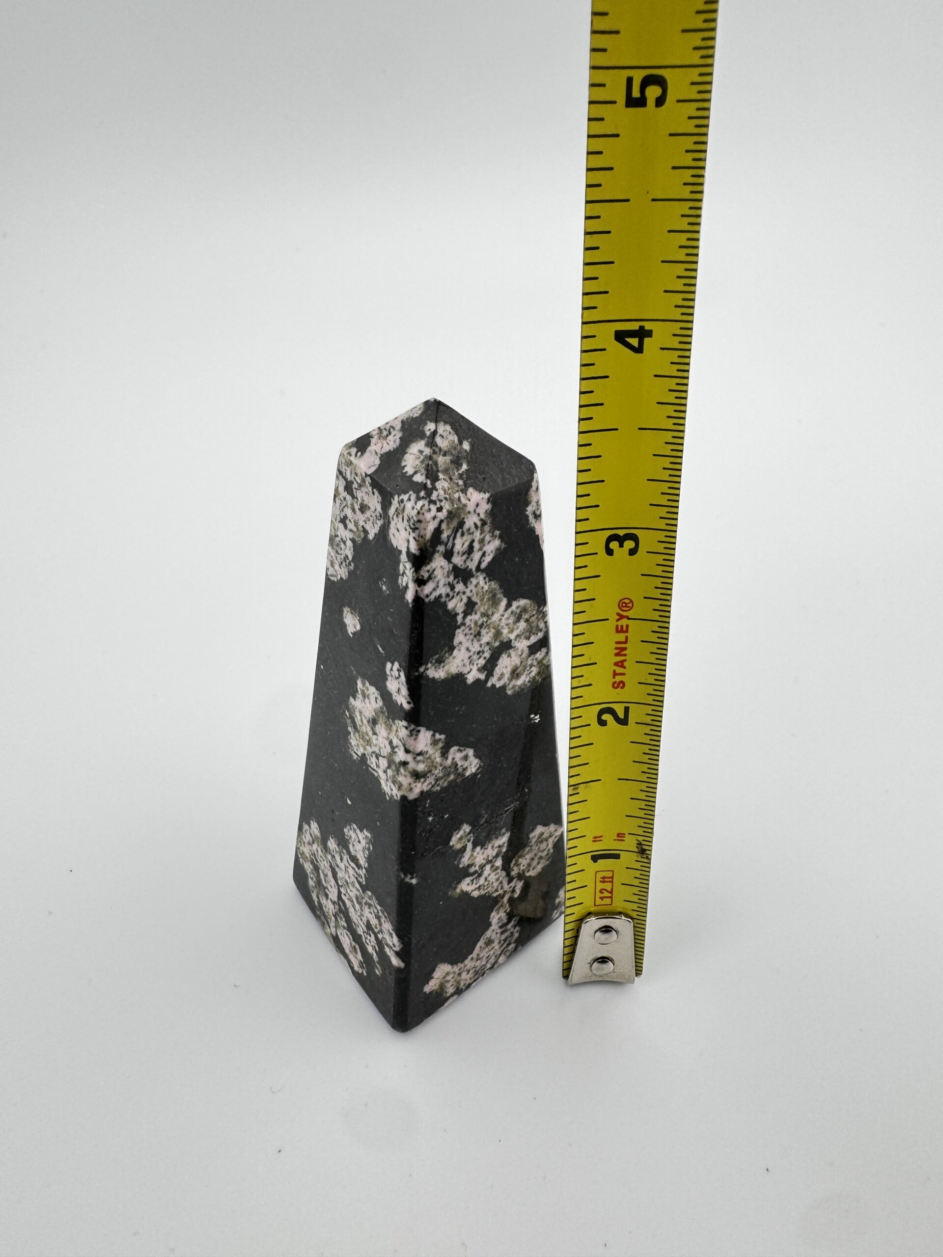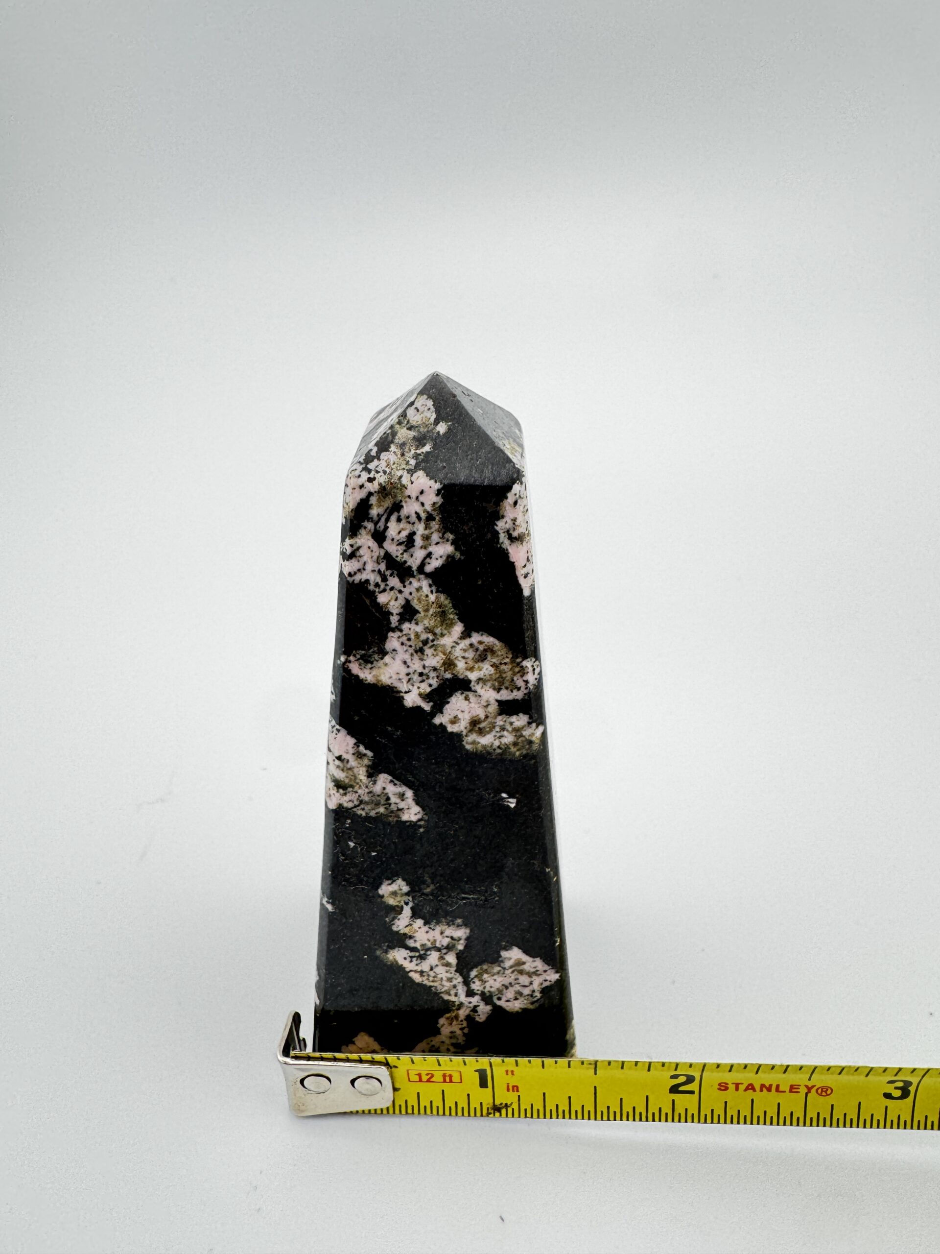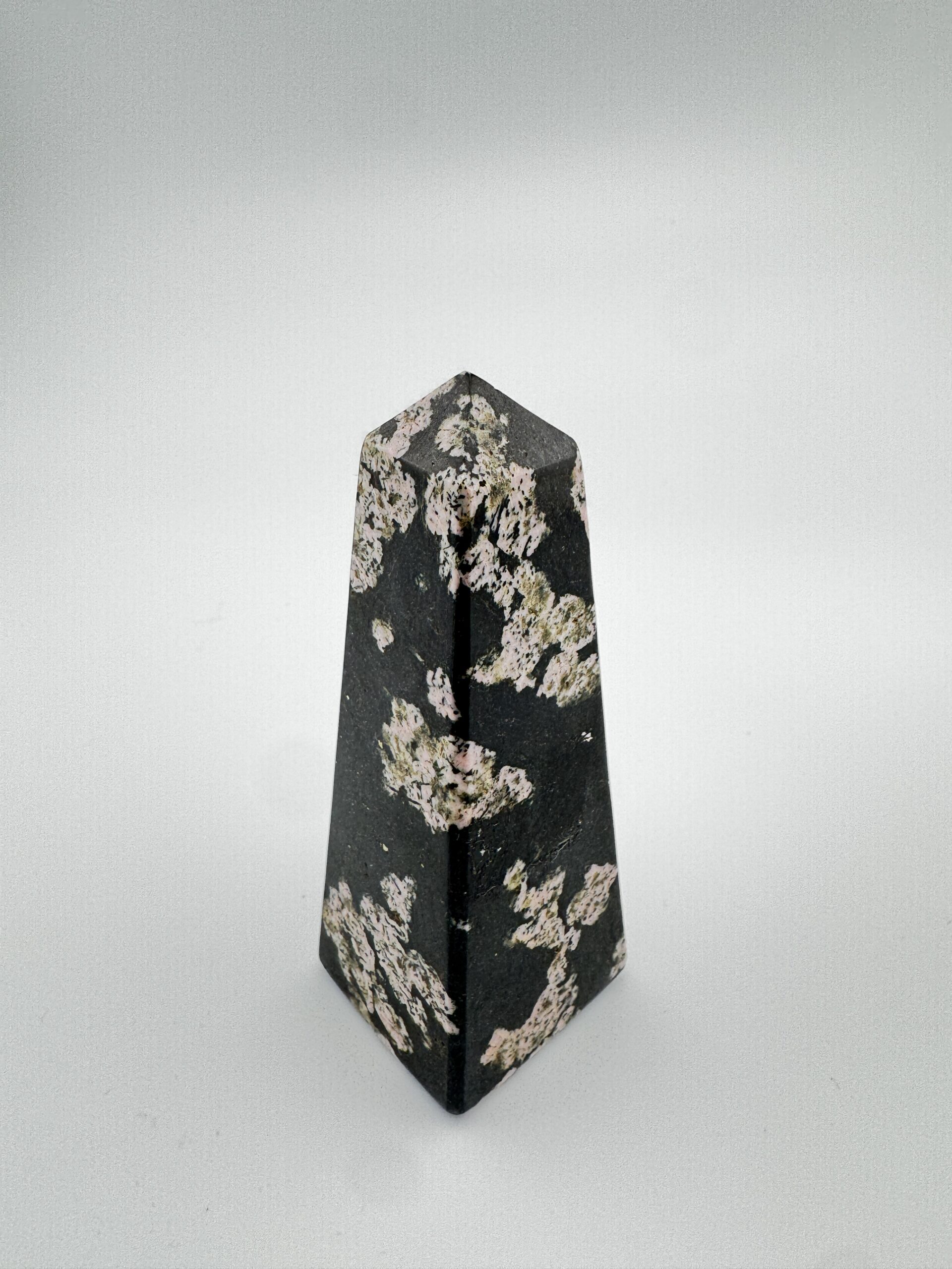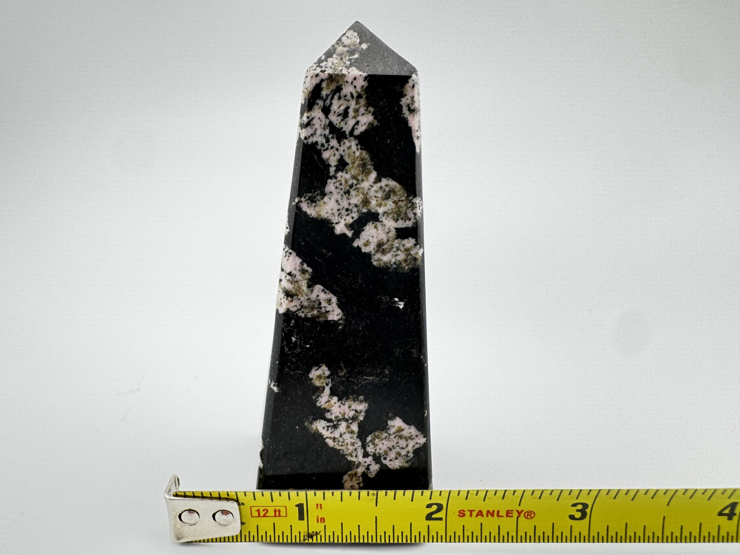 Natural artwork that no human craftsman could replicate – this striking combination formed when pink manganese-rich thulite intruded into existing black jade deposits. The result is a stunning polished tower showcasing nature’s ability to create perfect artistic contrasts.