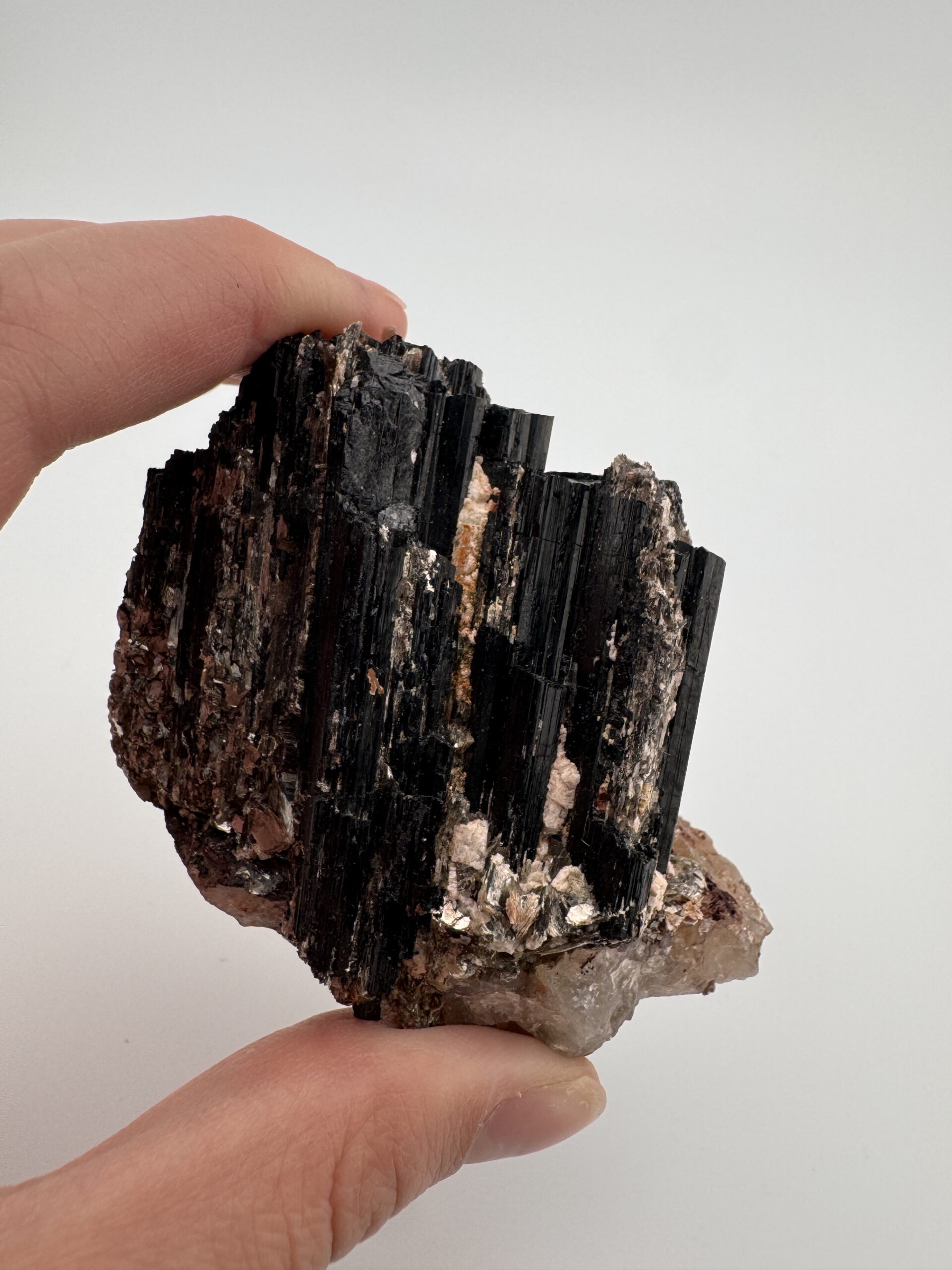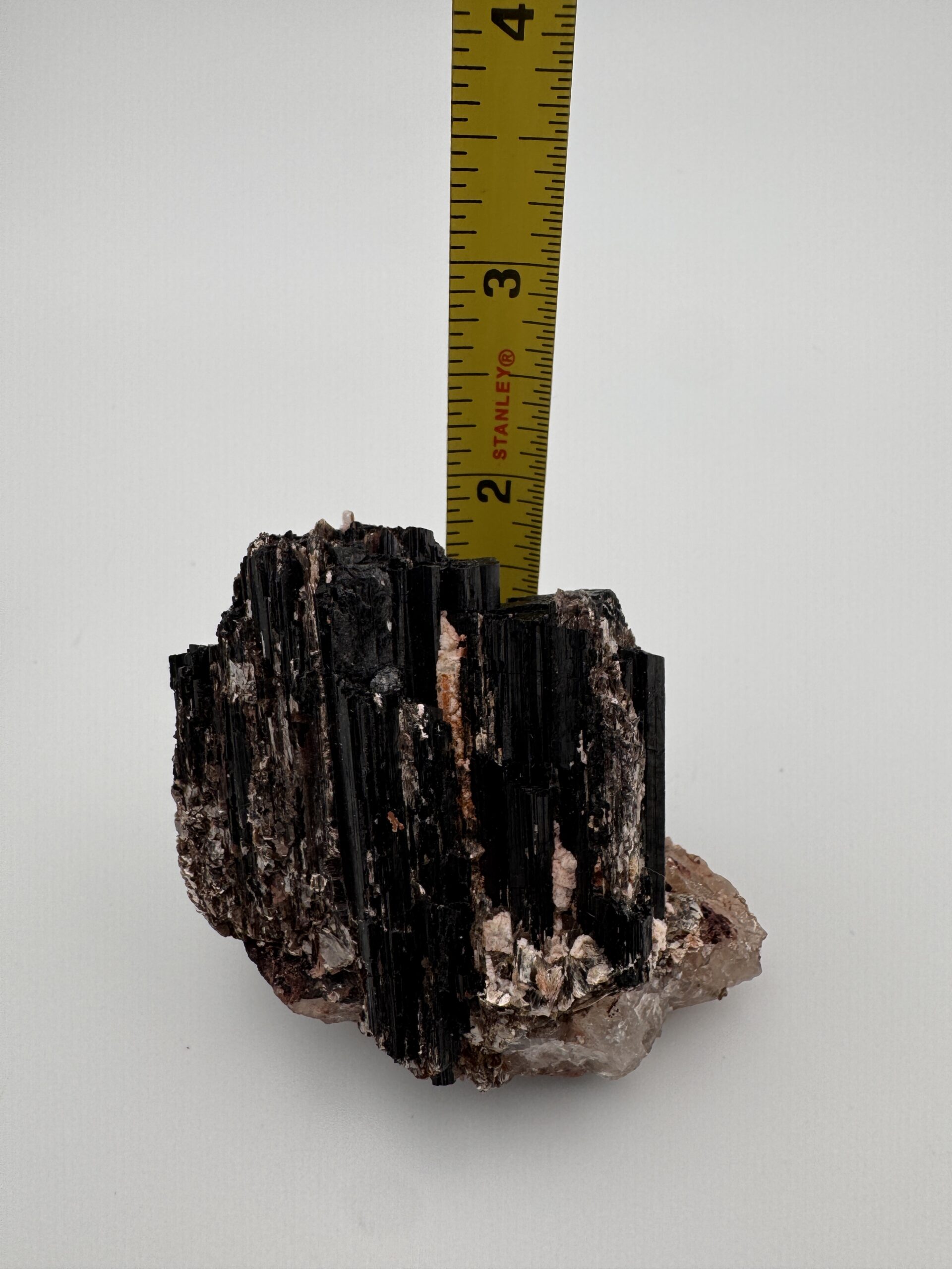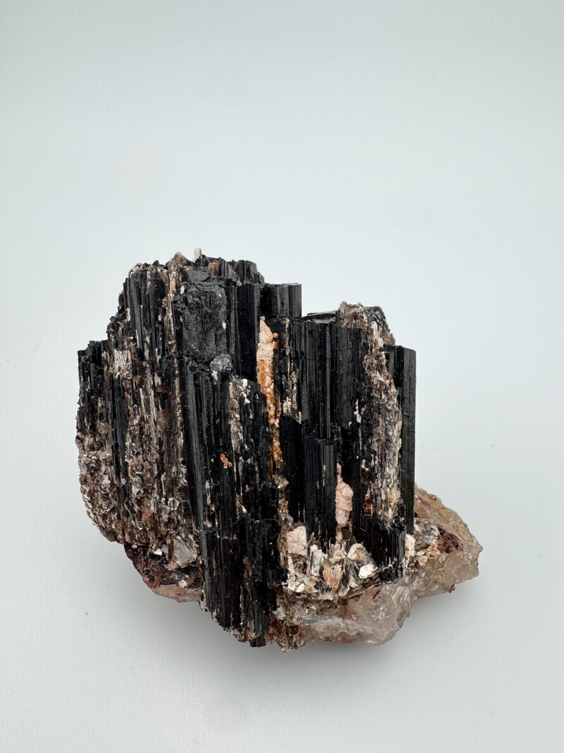 Raw geological beauty in its natural state – this black tourmaline crystal cluster displays excellent terminations embedded in their original host rock with beautiful contrasting mica and quartz. This specimen shows how tourmaline actually forms in nature. Measuring approximately 1.5″ x 2.5″ x 2.5″.