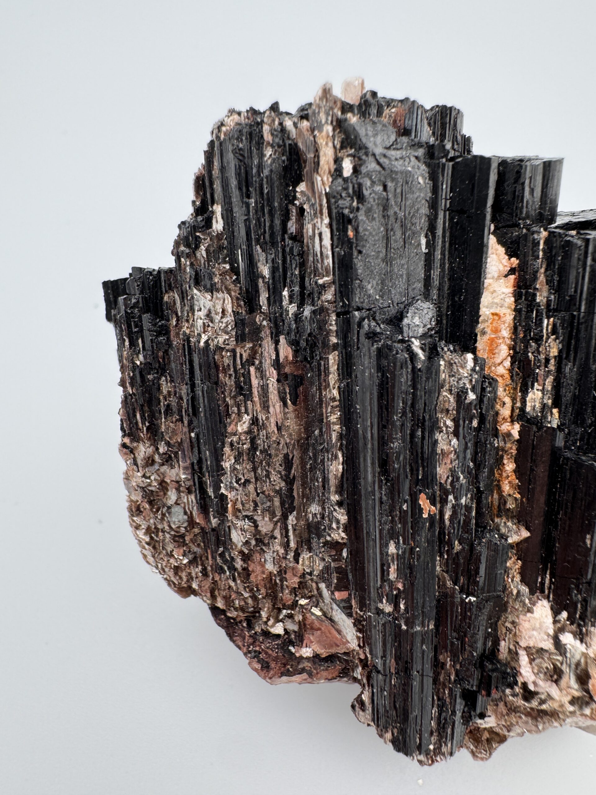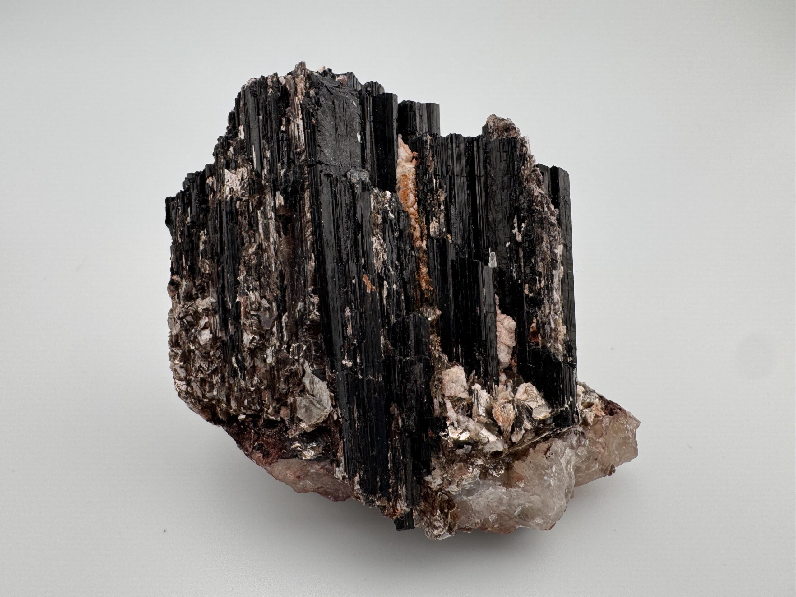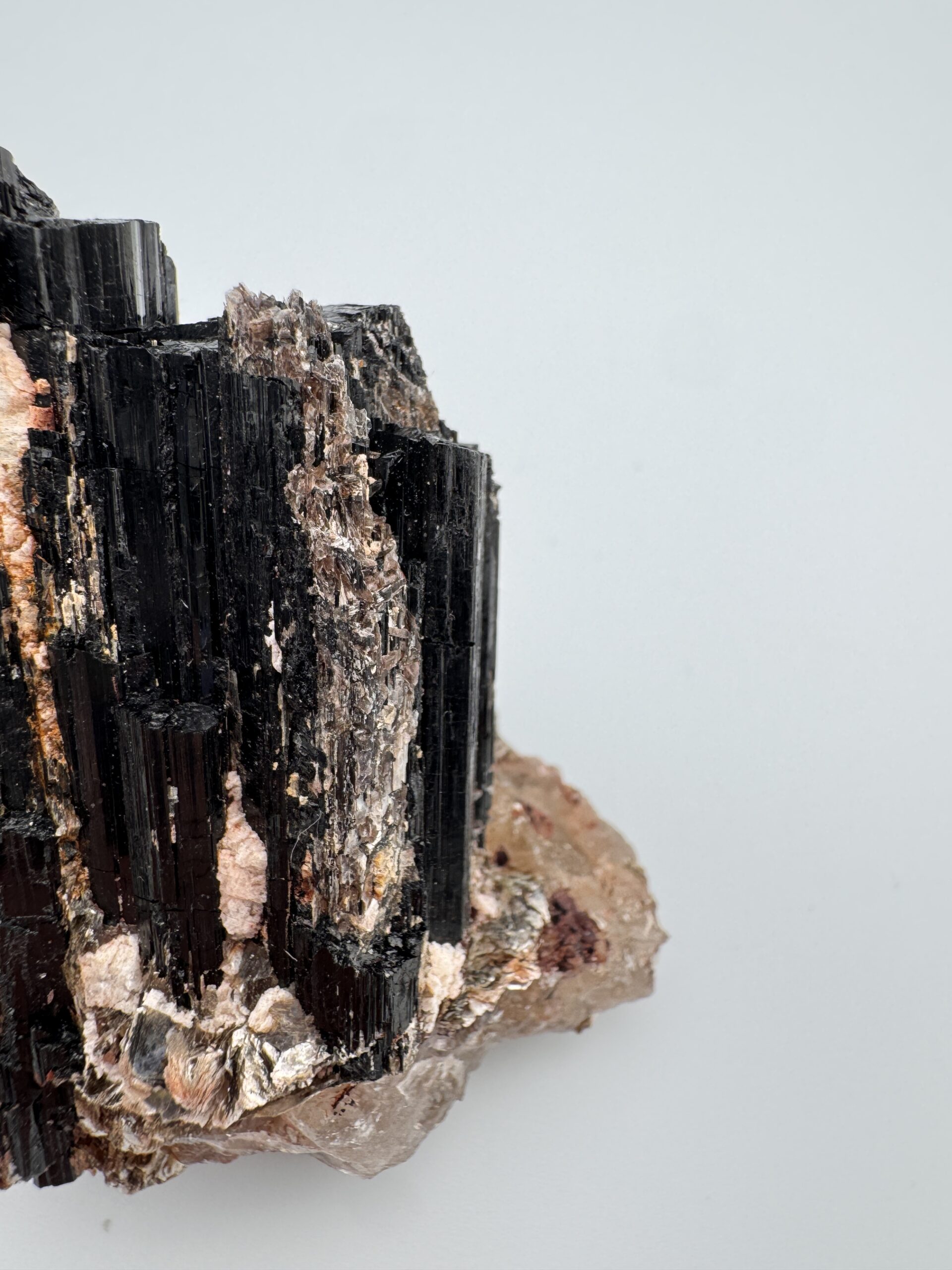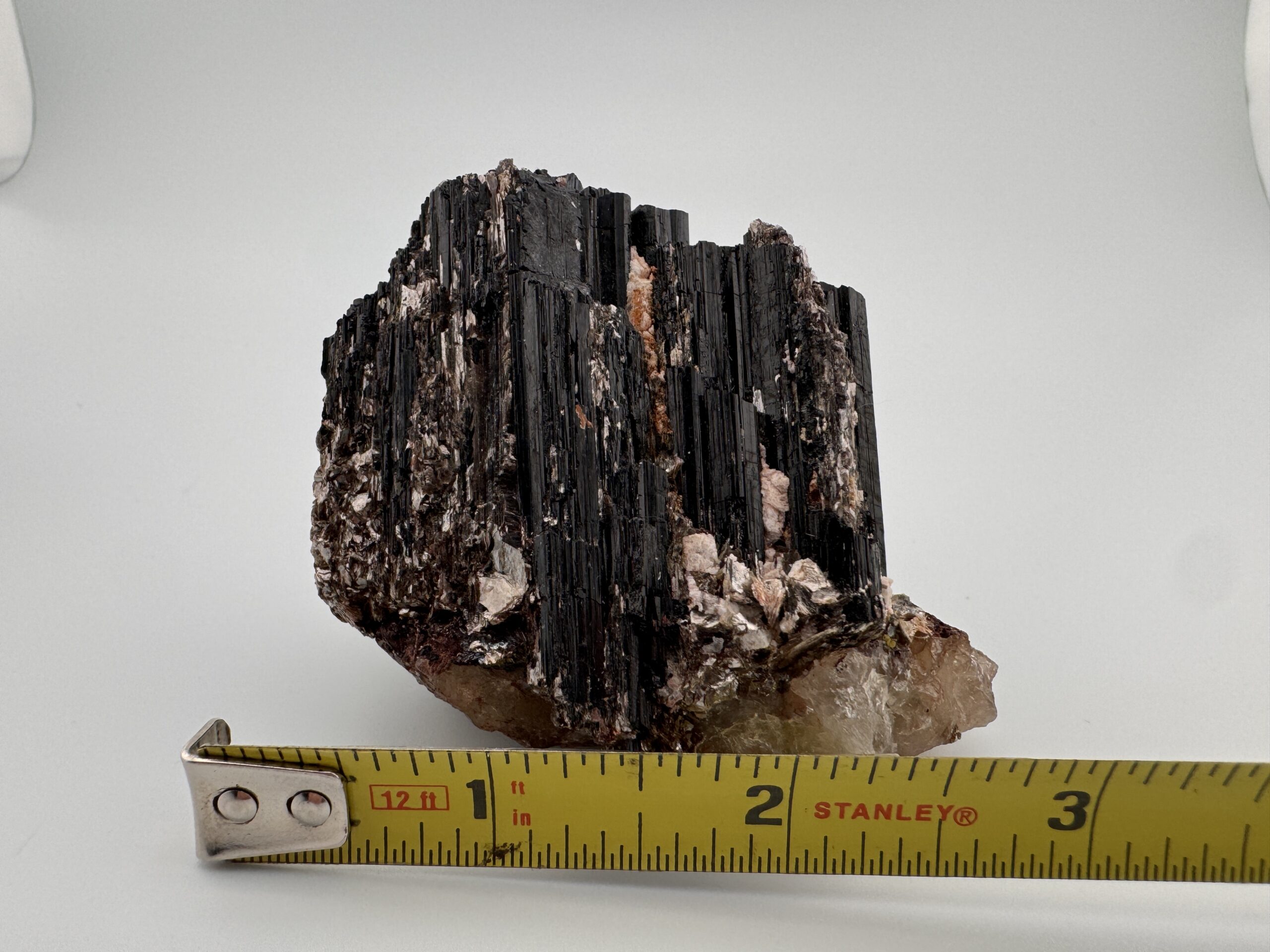 Raw geological beauty in its natural state – this black tourmaline crystal cluster displays excellent terminations embedded in their original host rock with beautiful contrasting mica and quartz. This specimen shows how tourmaline actually forms in nature. Measuring approximately 1.5″ x 2.5″ x 2.5″.