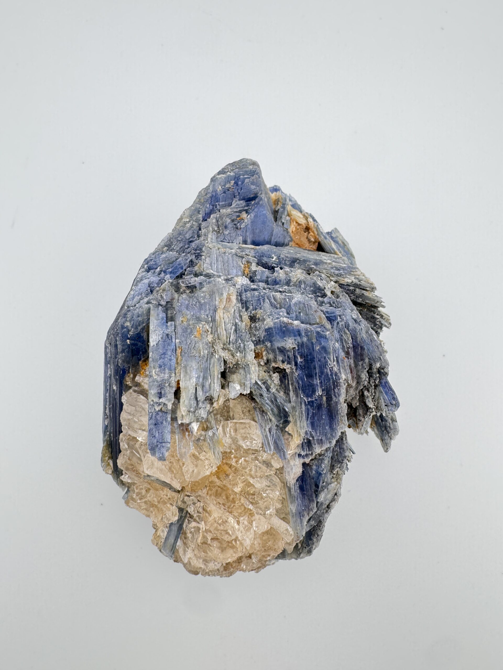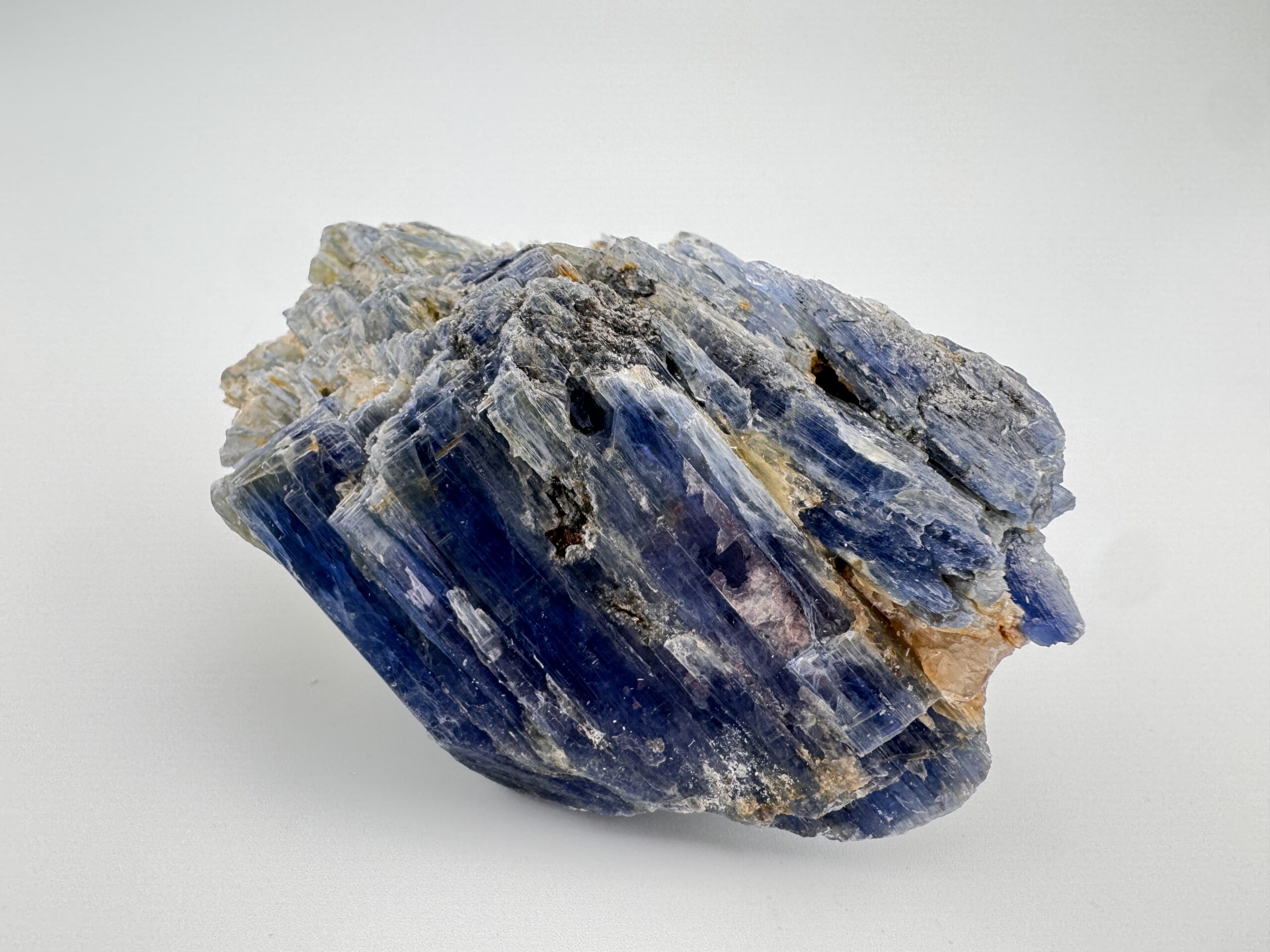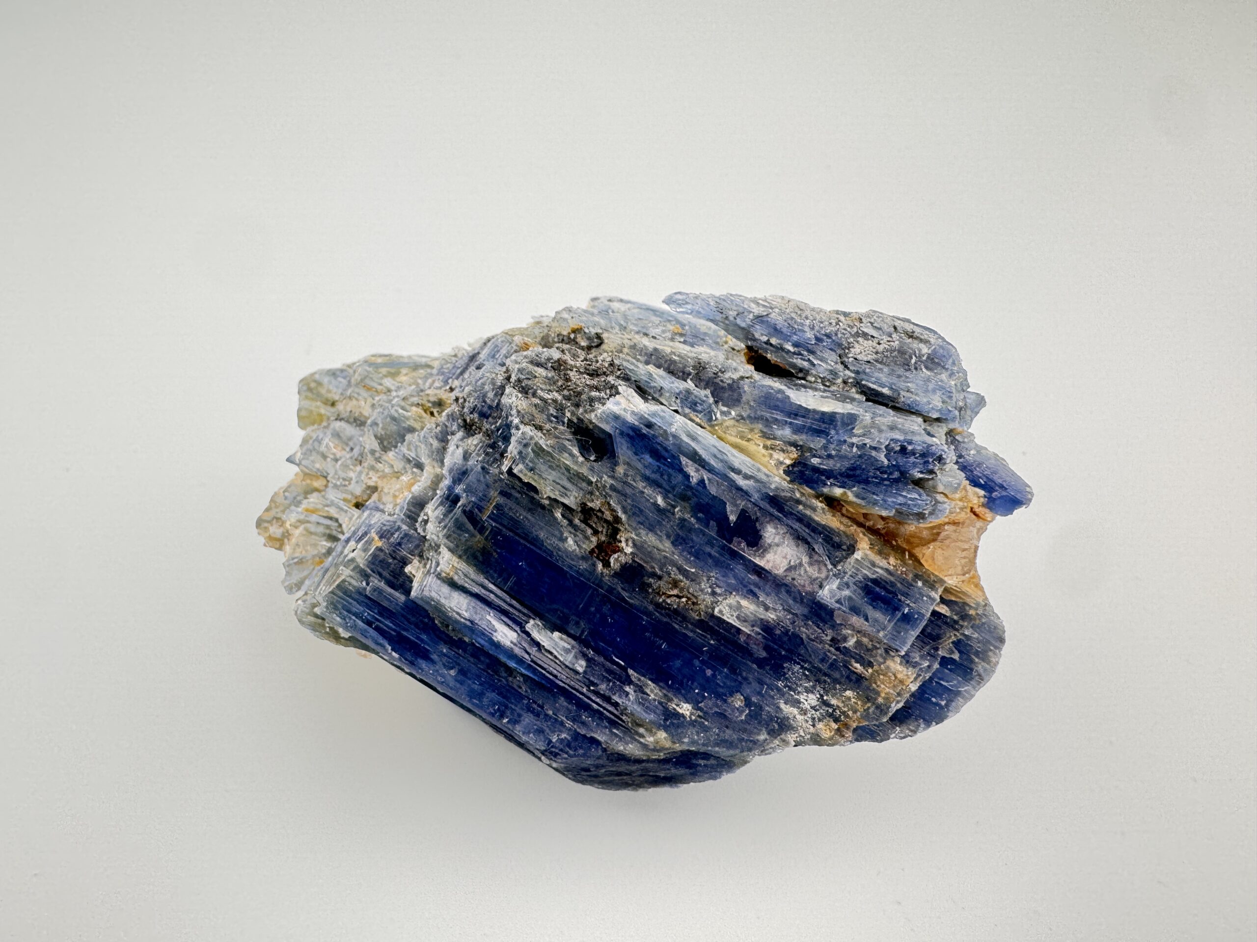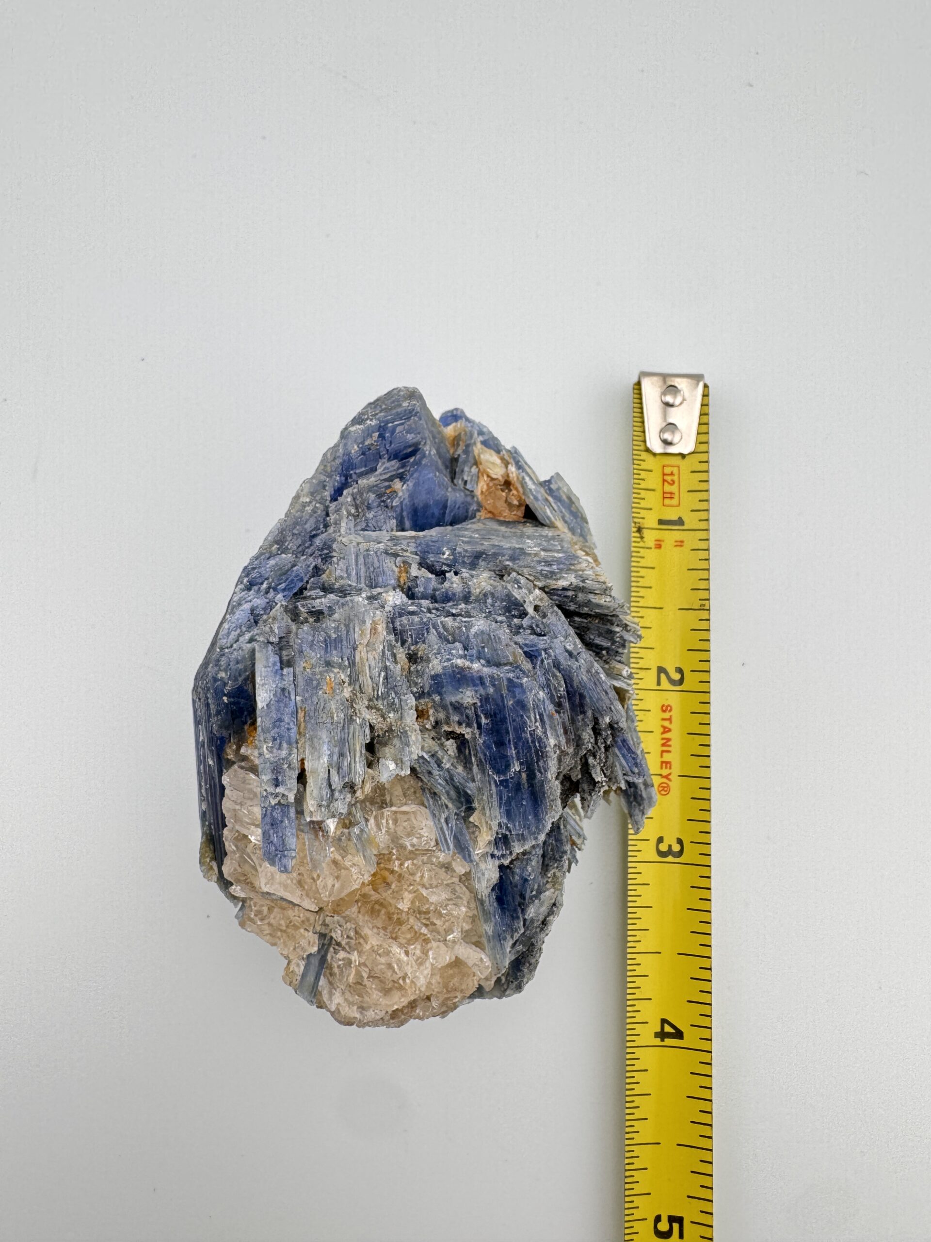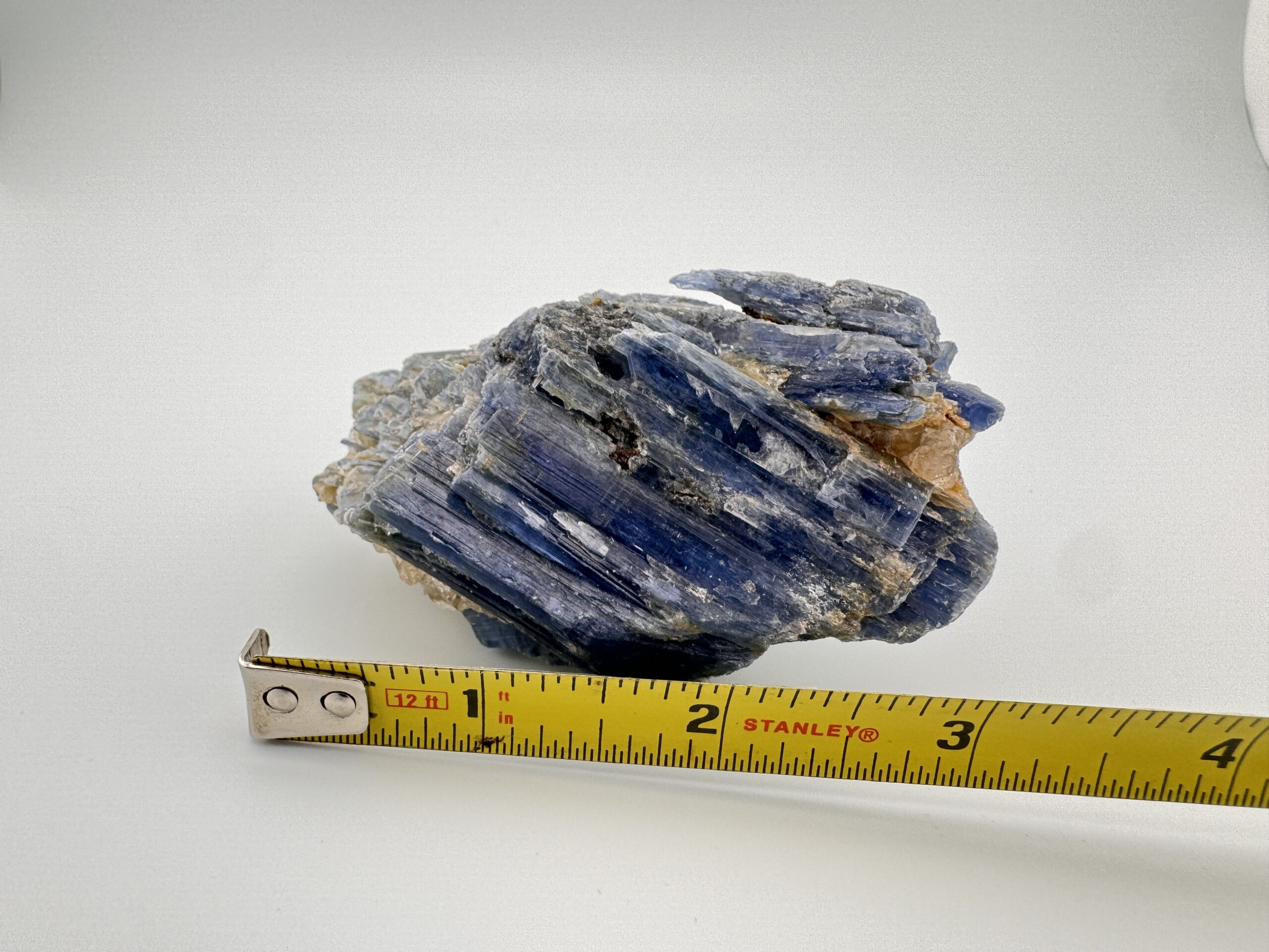 Brilliant raw blue Kyanite with layered crystal blades and silvery shimmer. Weighs 9.35 oz and measures approximately 3.5″ x 2.75″ x 1.75″.