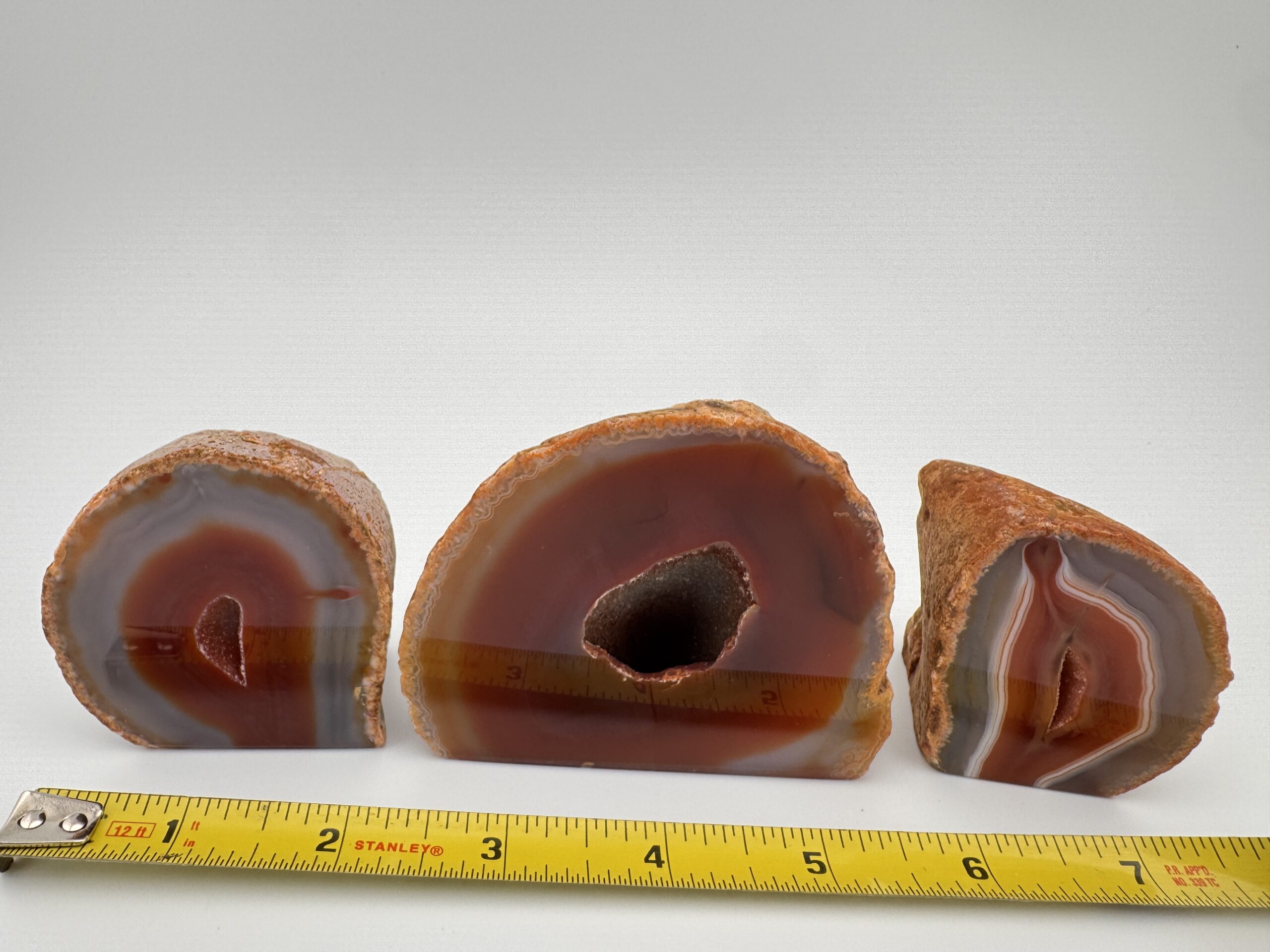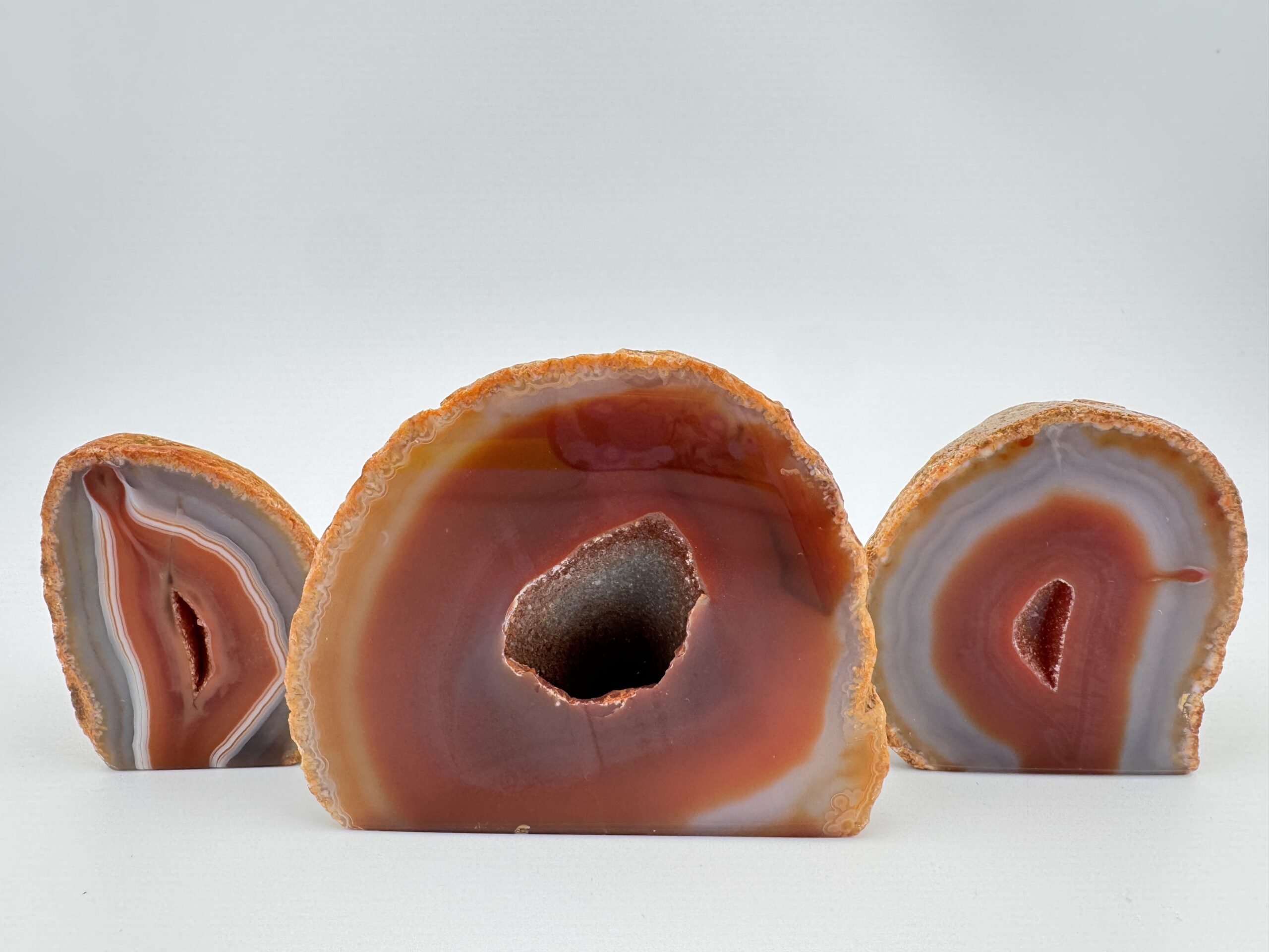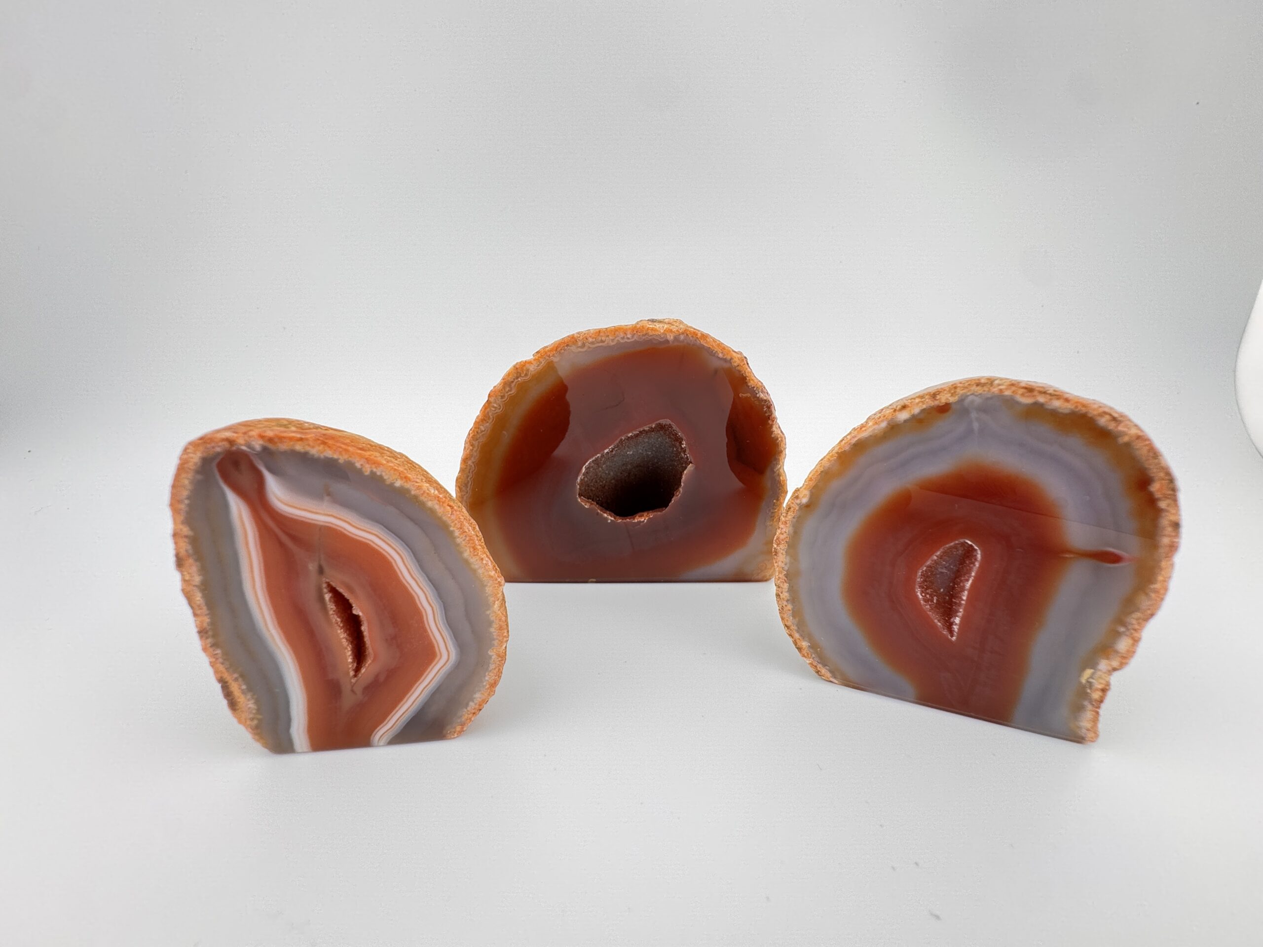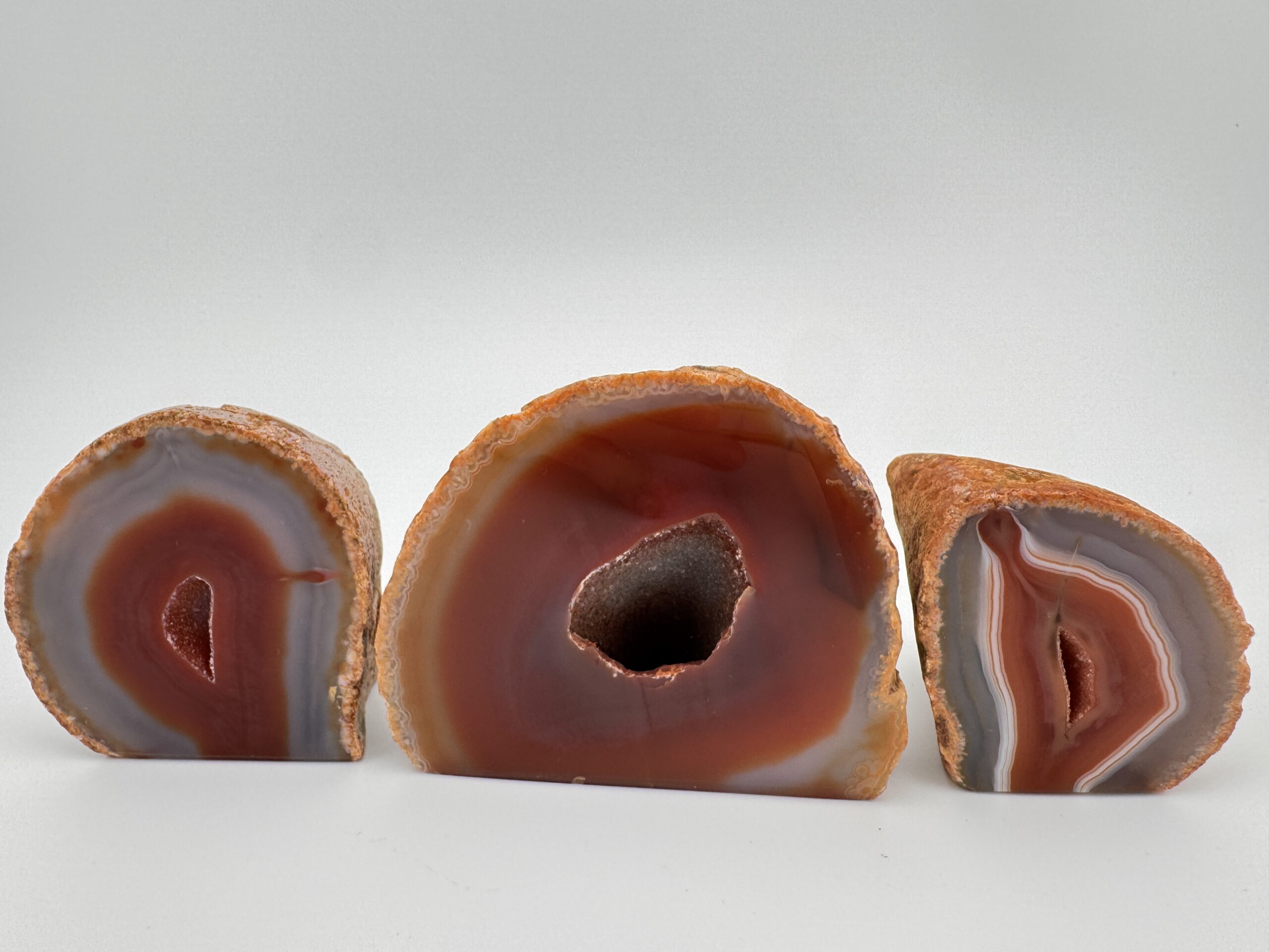 Vibrant set of 3 cut-base Carnelian geodes with polished faces and sparkling centers.