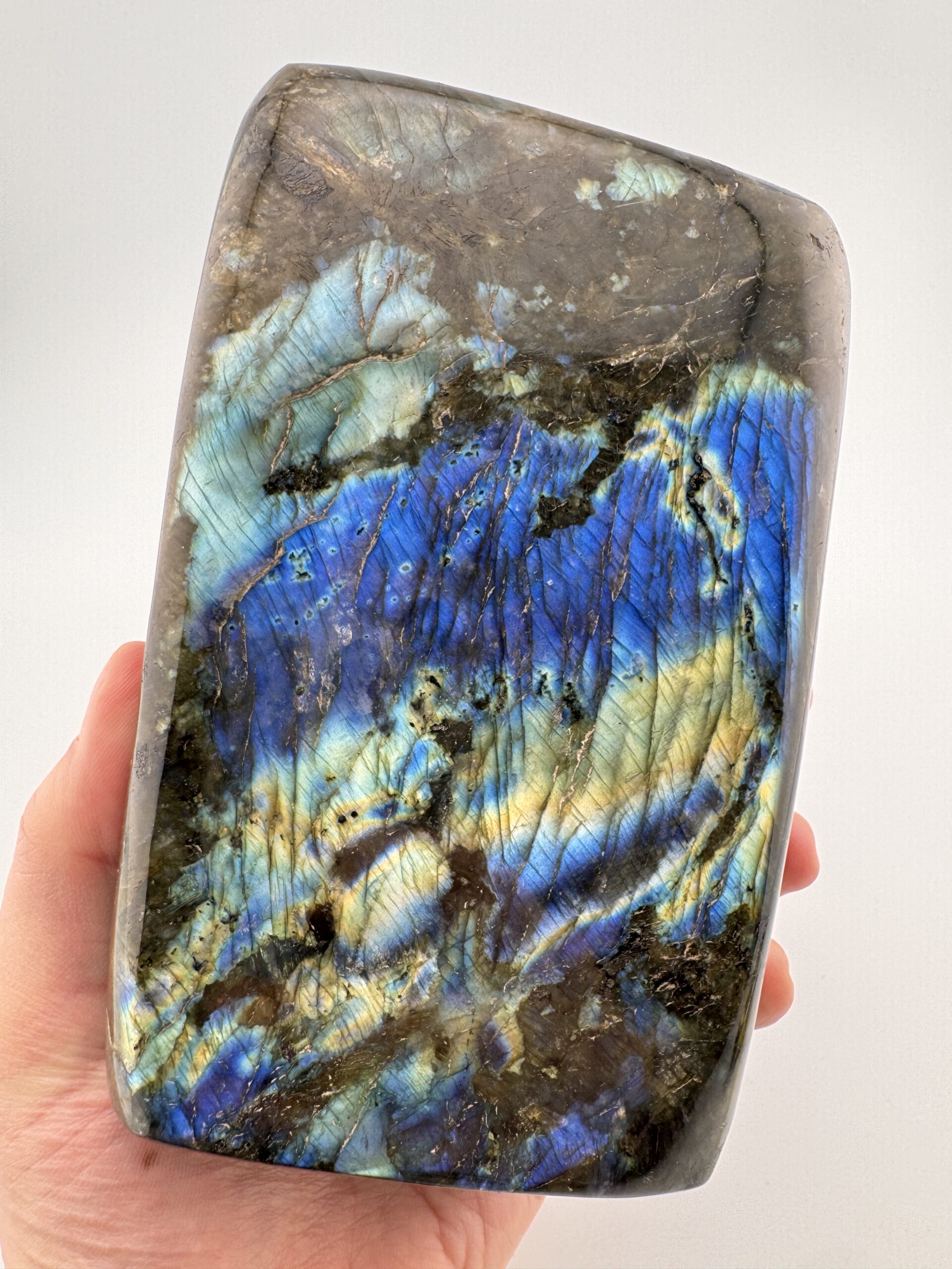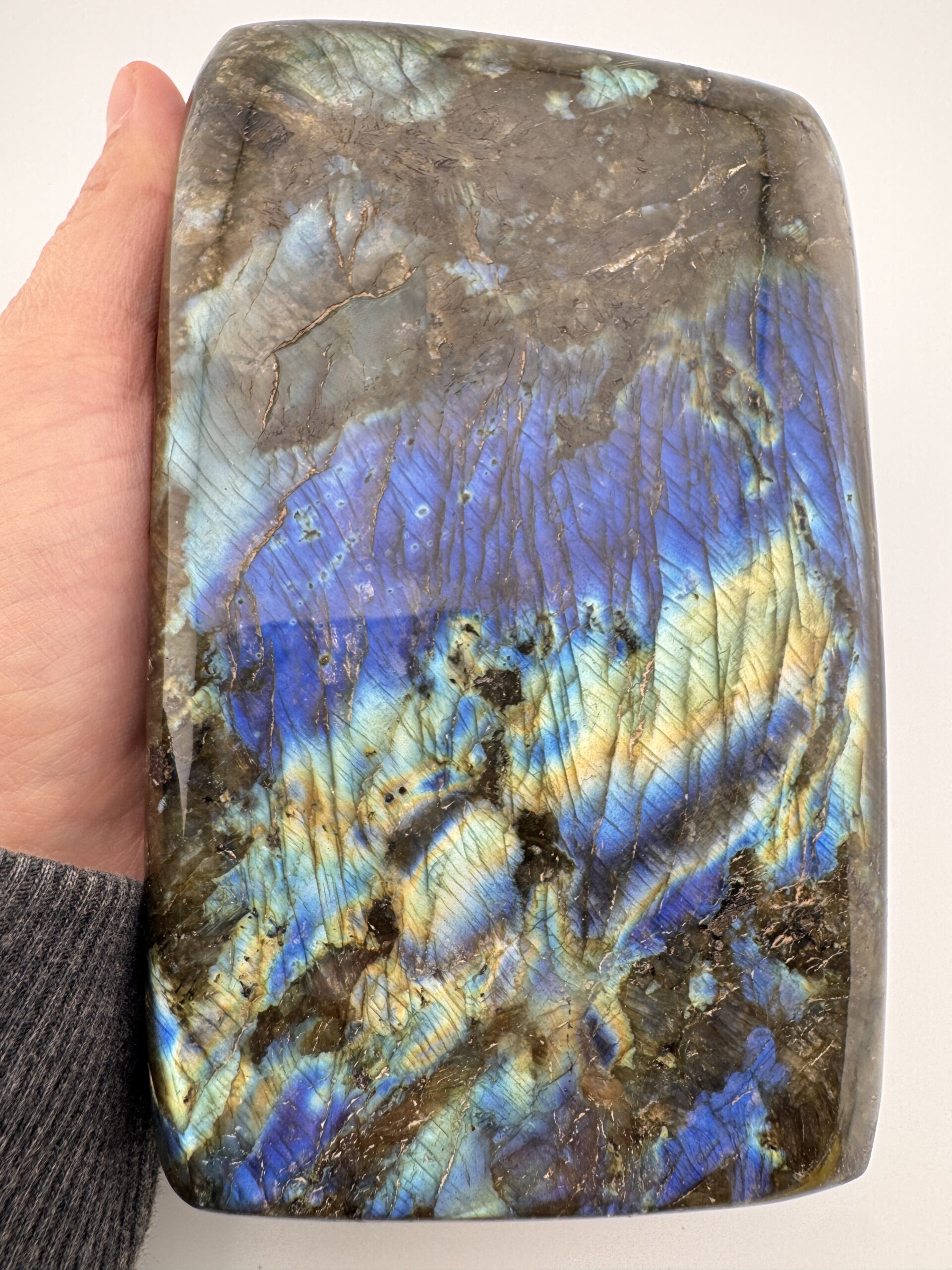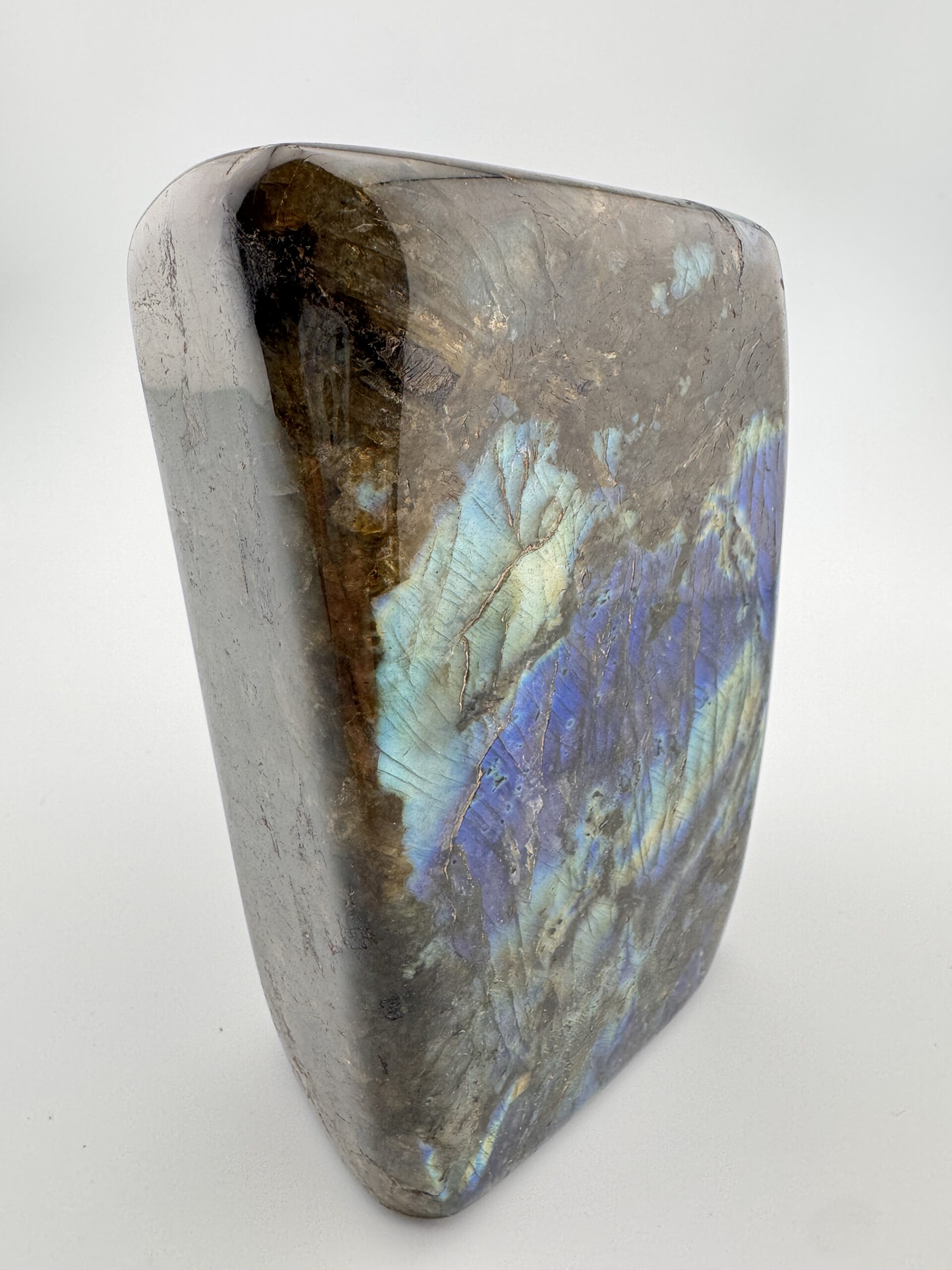 This impressive polished Labradorite piece weighs 61.25 ounces and displays a mesmerizing play of color, with flashes of blue, teal. and hints of gold dancing across its surface. Its smooth polish enhances the depth and sheen of the stone, bringing out the signature labradorescence that makes Labradorite so captivating. Each angle reveals new light and movement, making it a truly dynamic display piece.