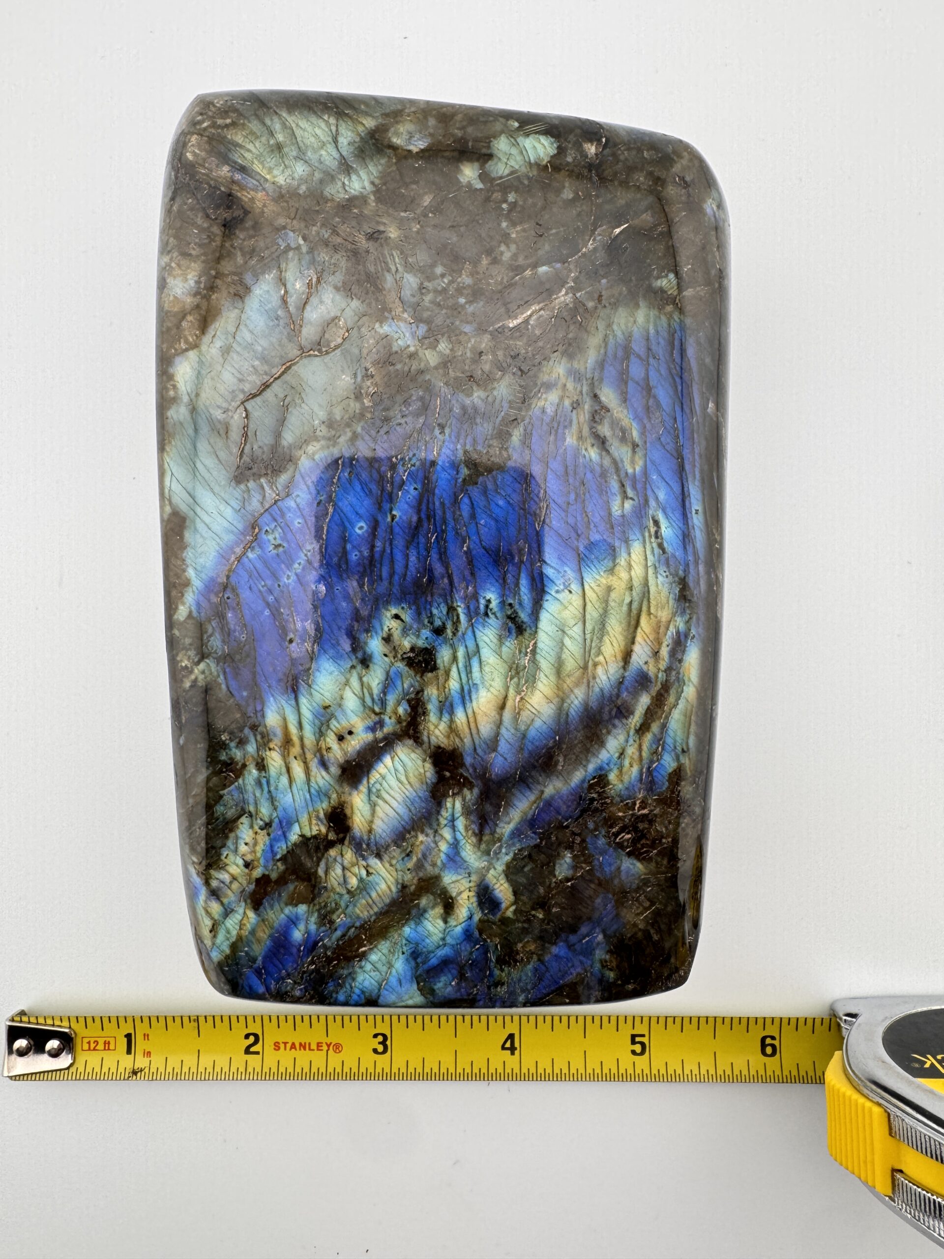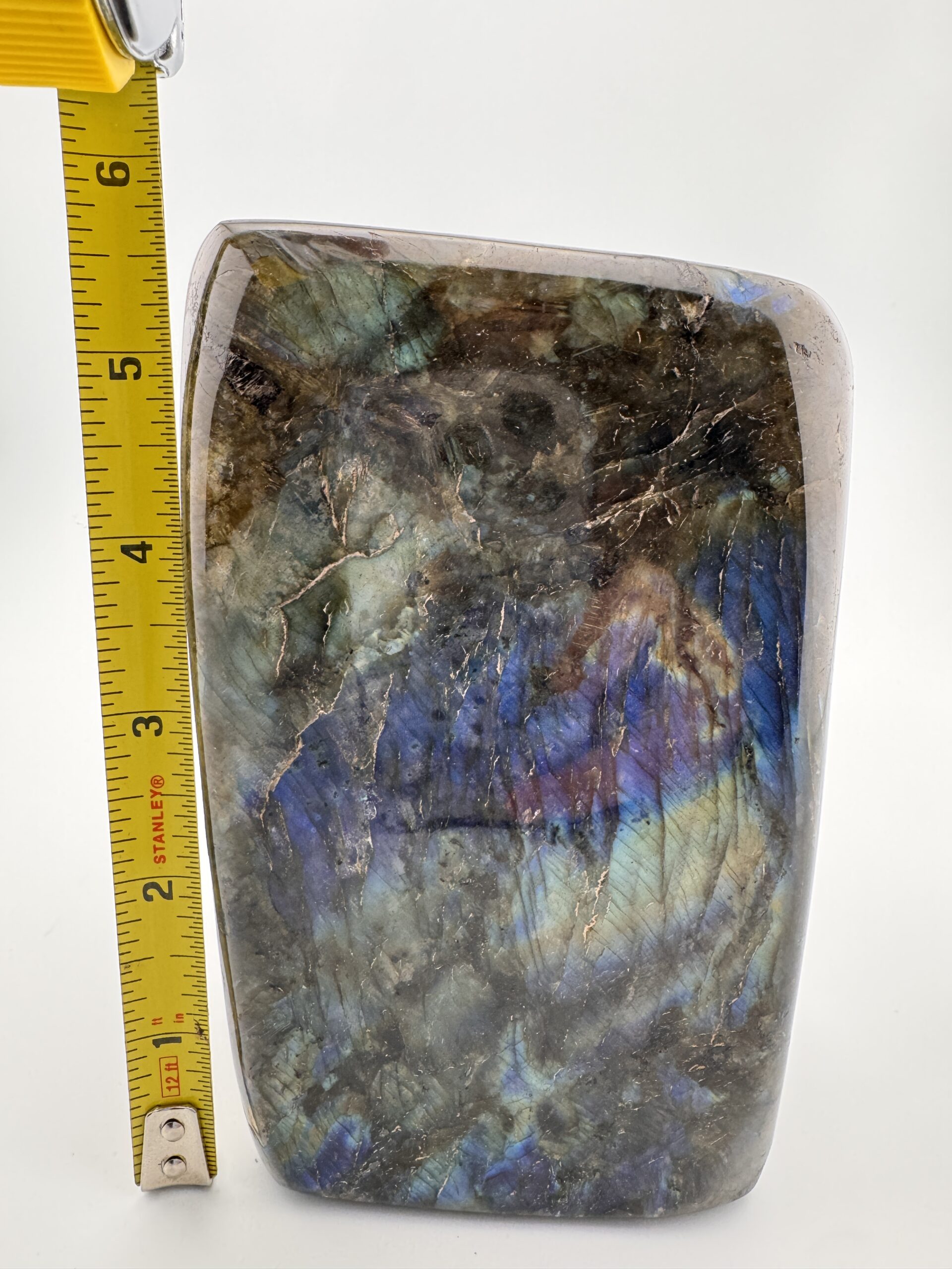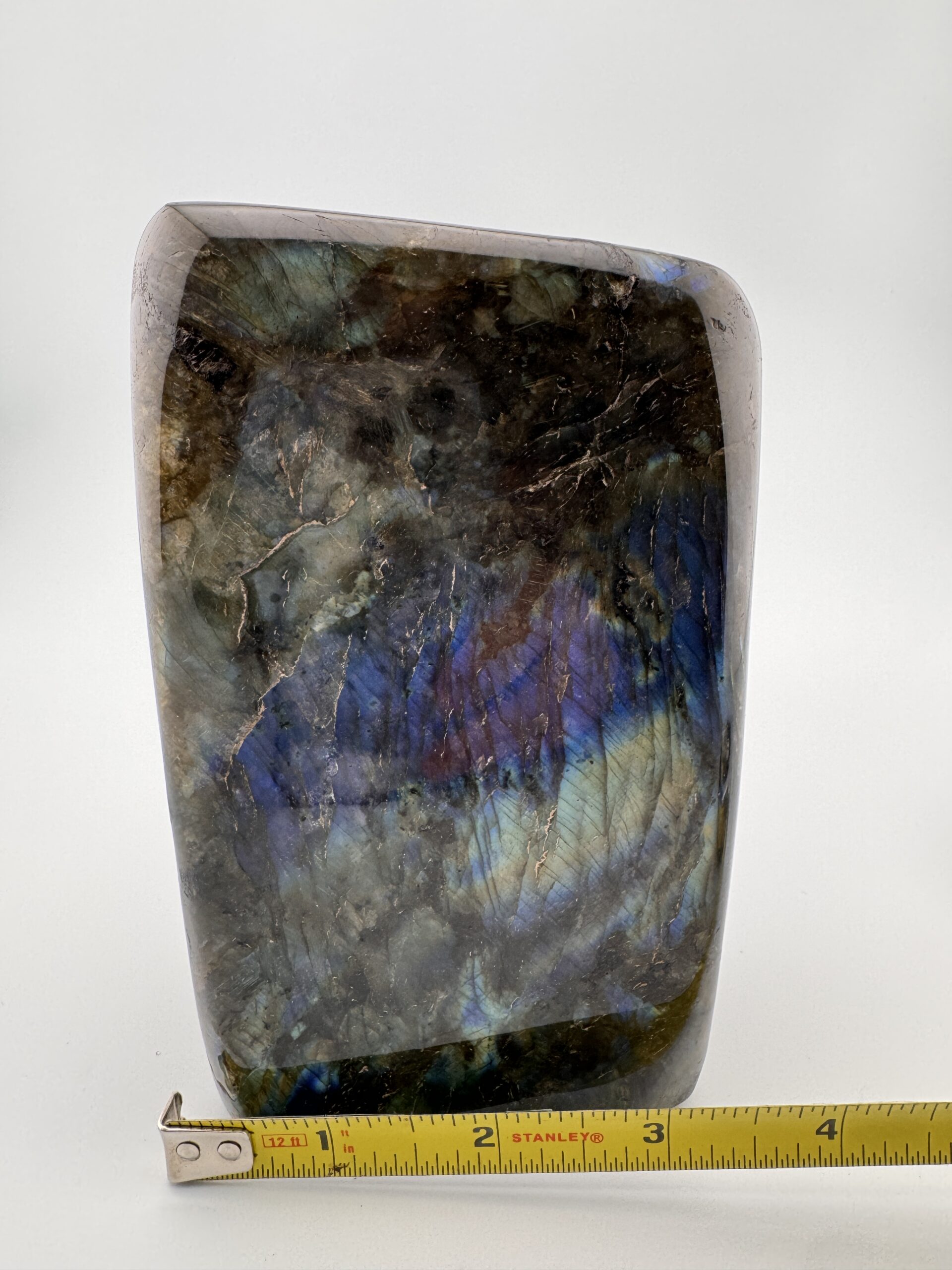 This impressive polished Labradorite piece weighs 61.25 ounces and displays a mesmerizing play of color, with flashes of blue, teal. and hints of gold dancing across its surface. Its smooth polish enhances the depth and sheen of the stone, bringing out the signature labradorescence that makes Labradorite so captivating. Each angle reveals new light and movement, making it a truly dynamic display piece.