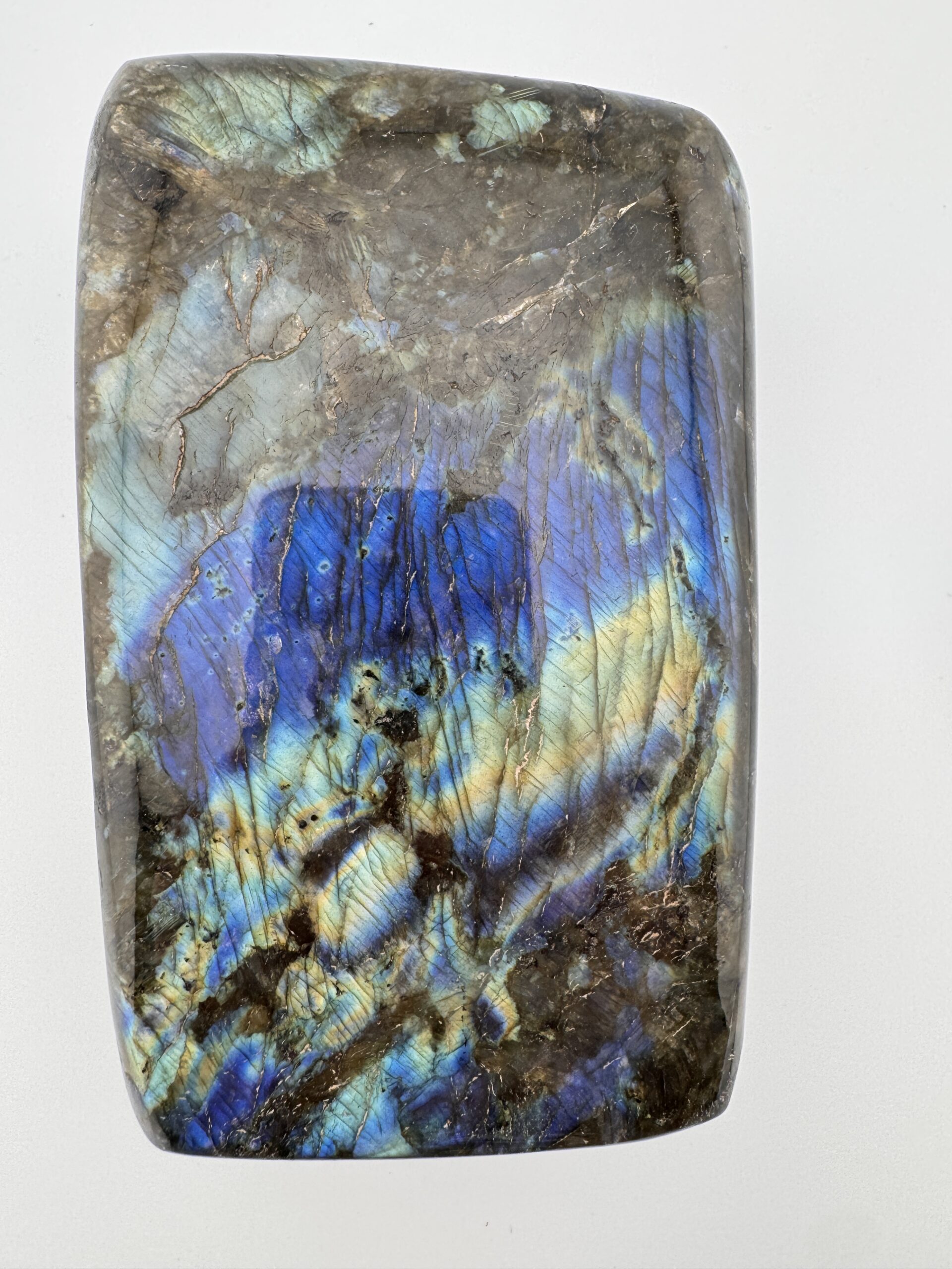 A Polished Labradorite glowing with brilliant flashes of blue, green, and gold tones—truly a show stopping display piece.