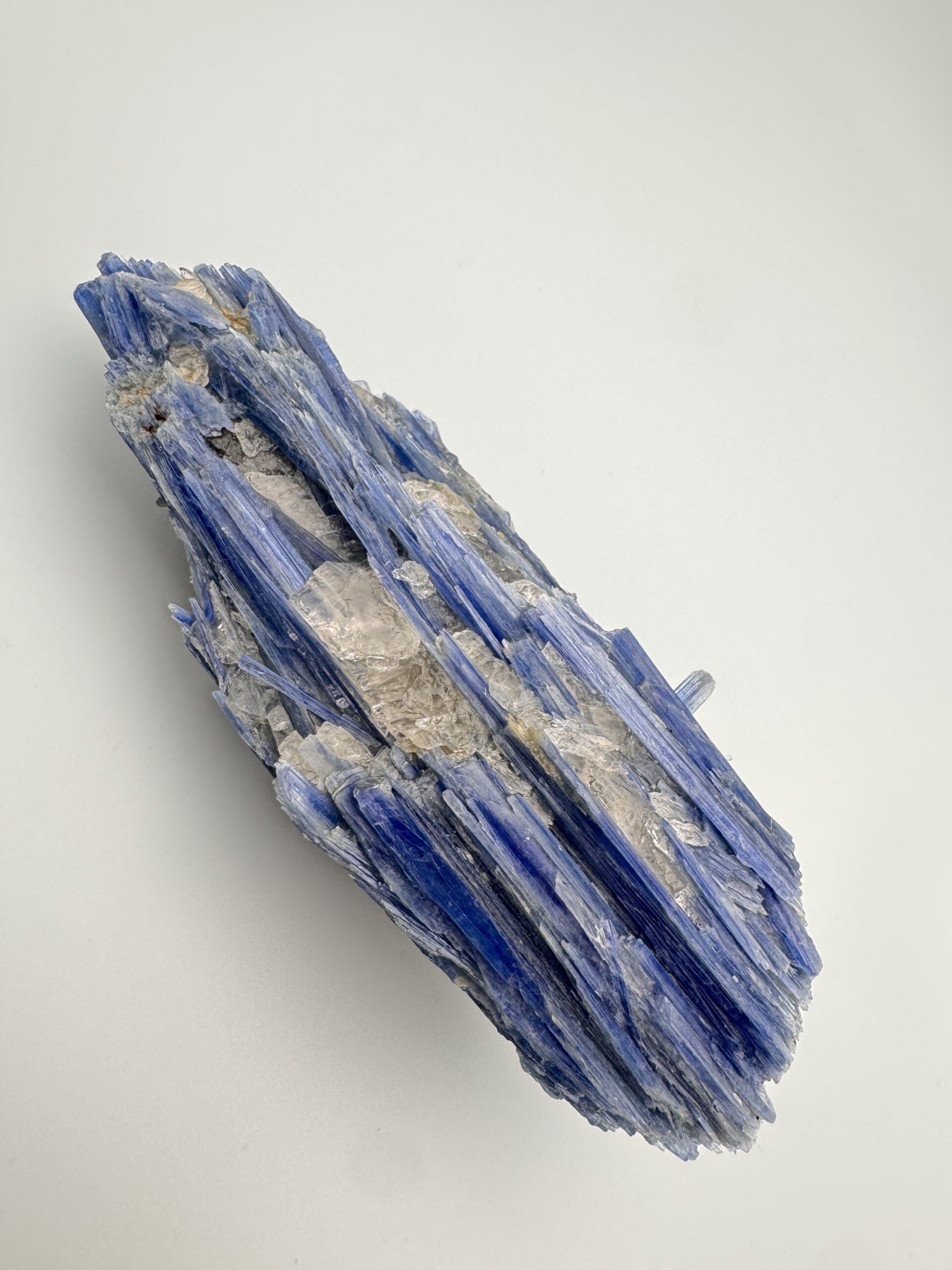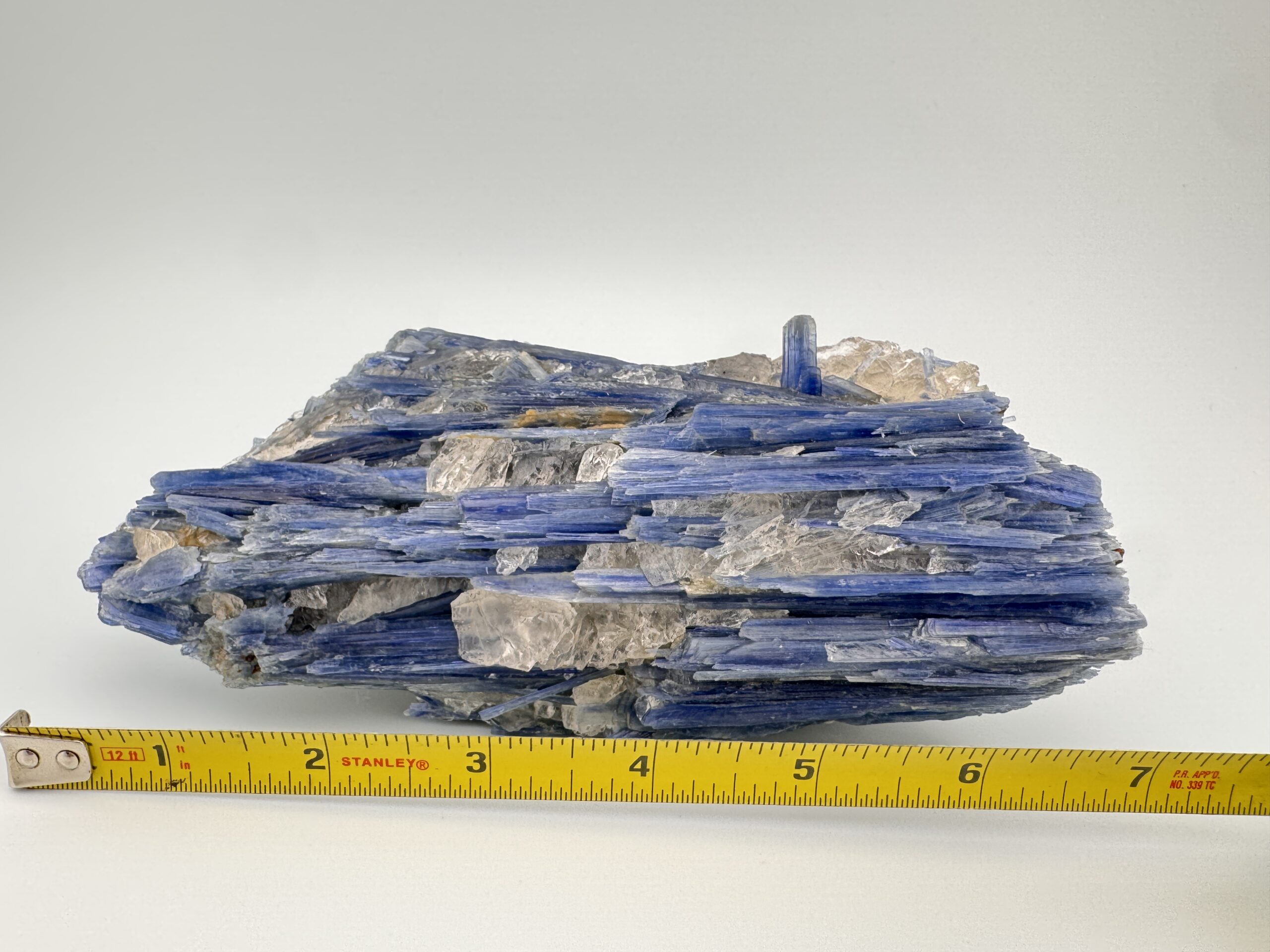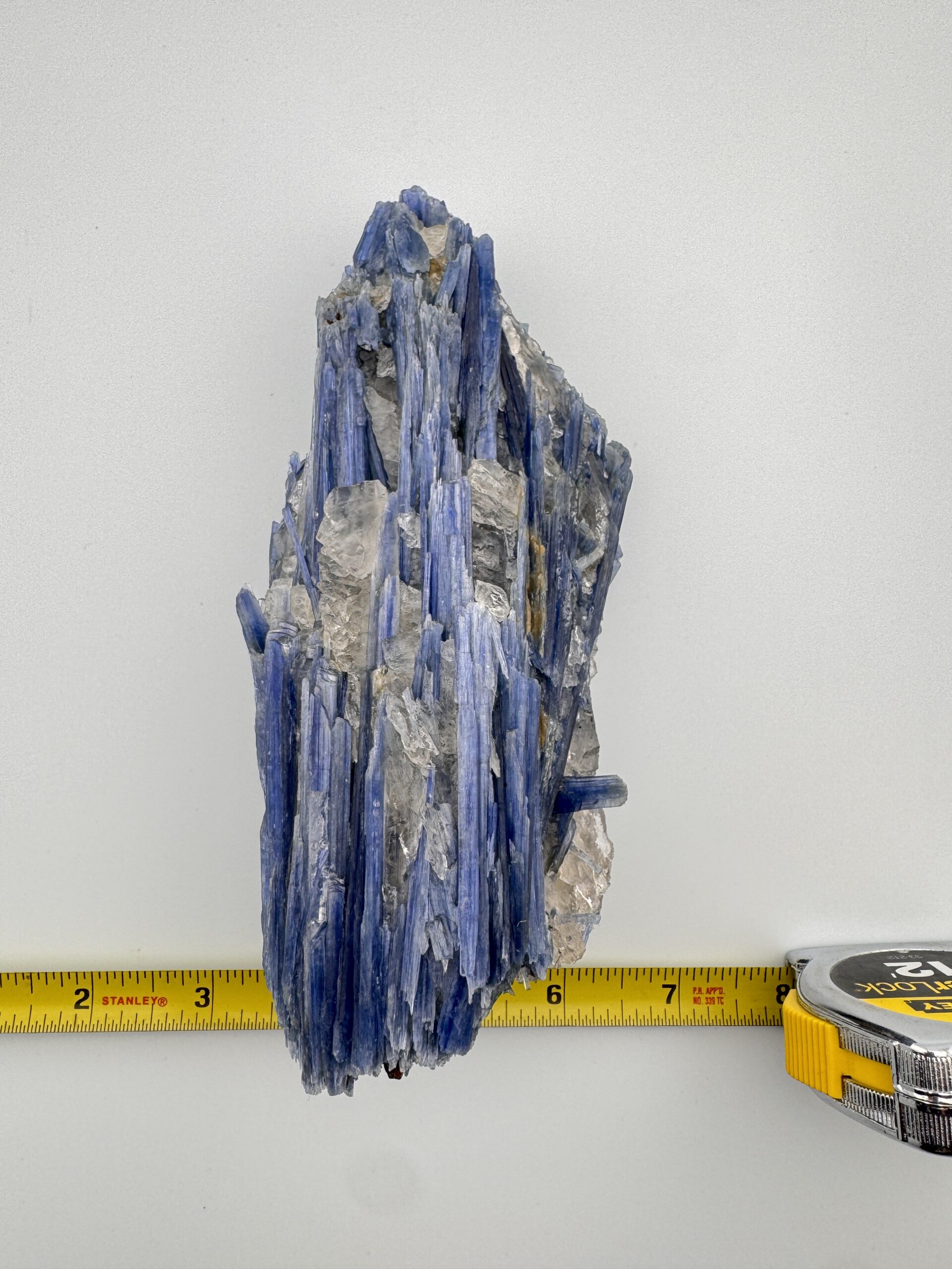 Vibrant blue Kyanite specimen with layered crystal blades and Quartz accents. Weighing 1.9 pounds and measures approximately 3.5″ x 7″ x 2.15″.