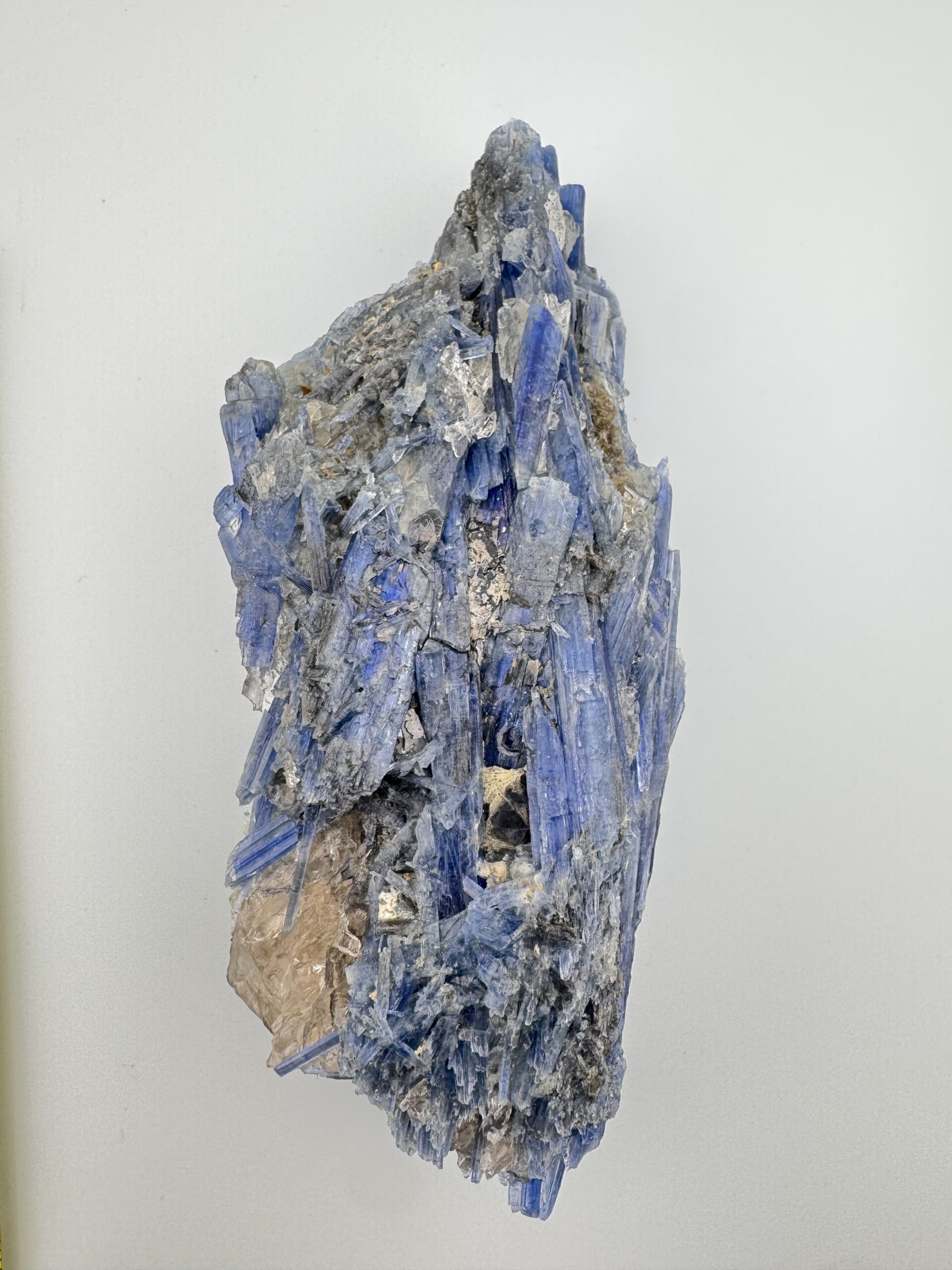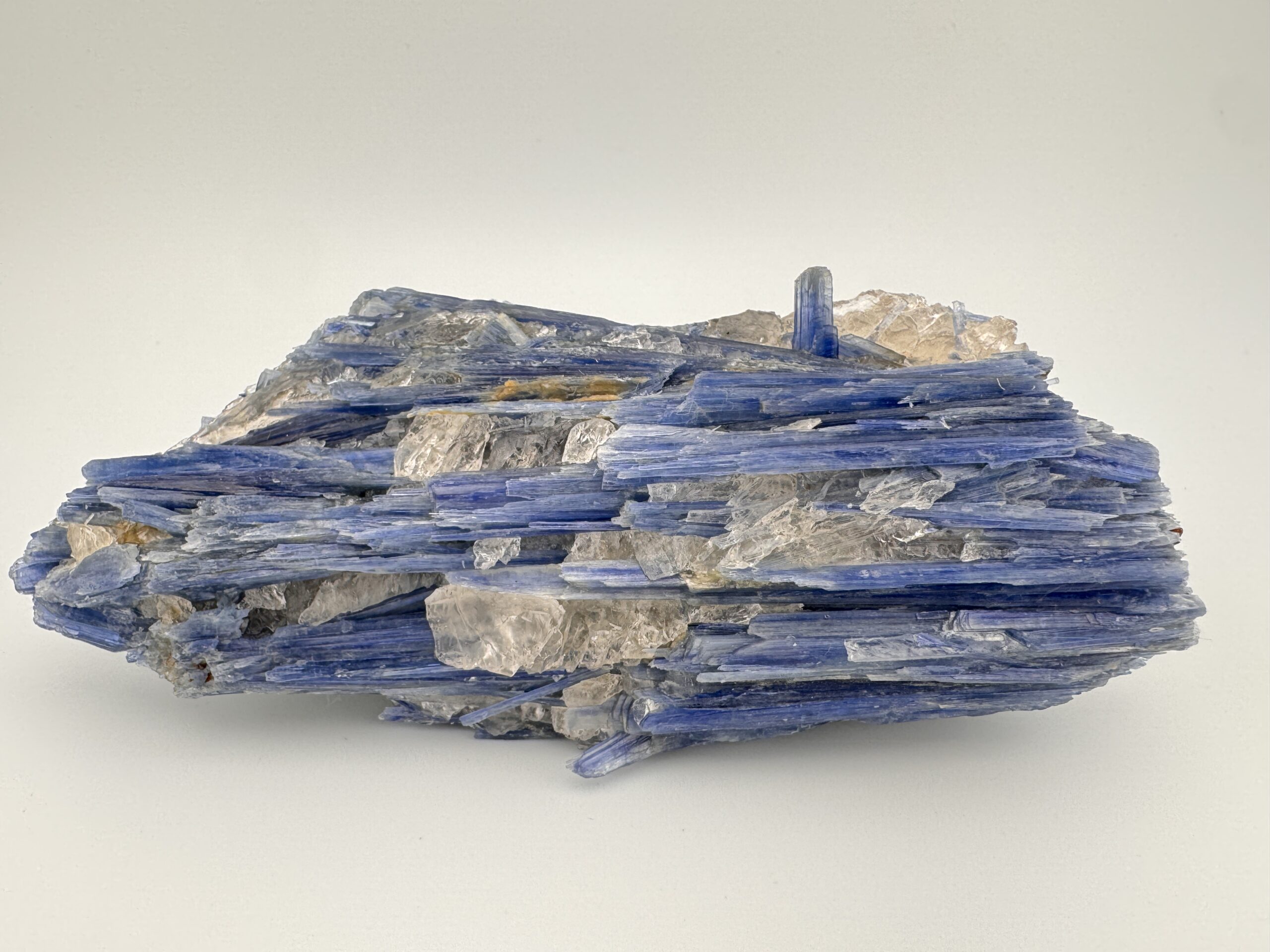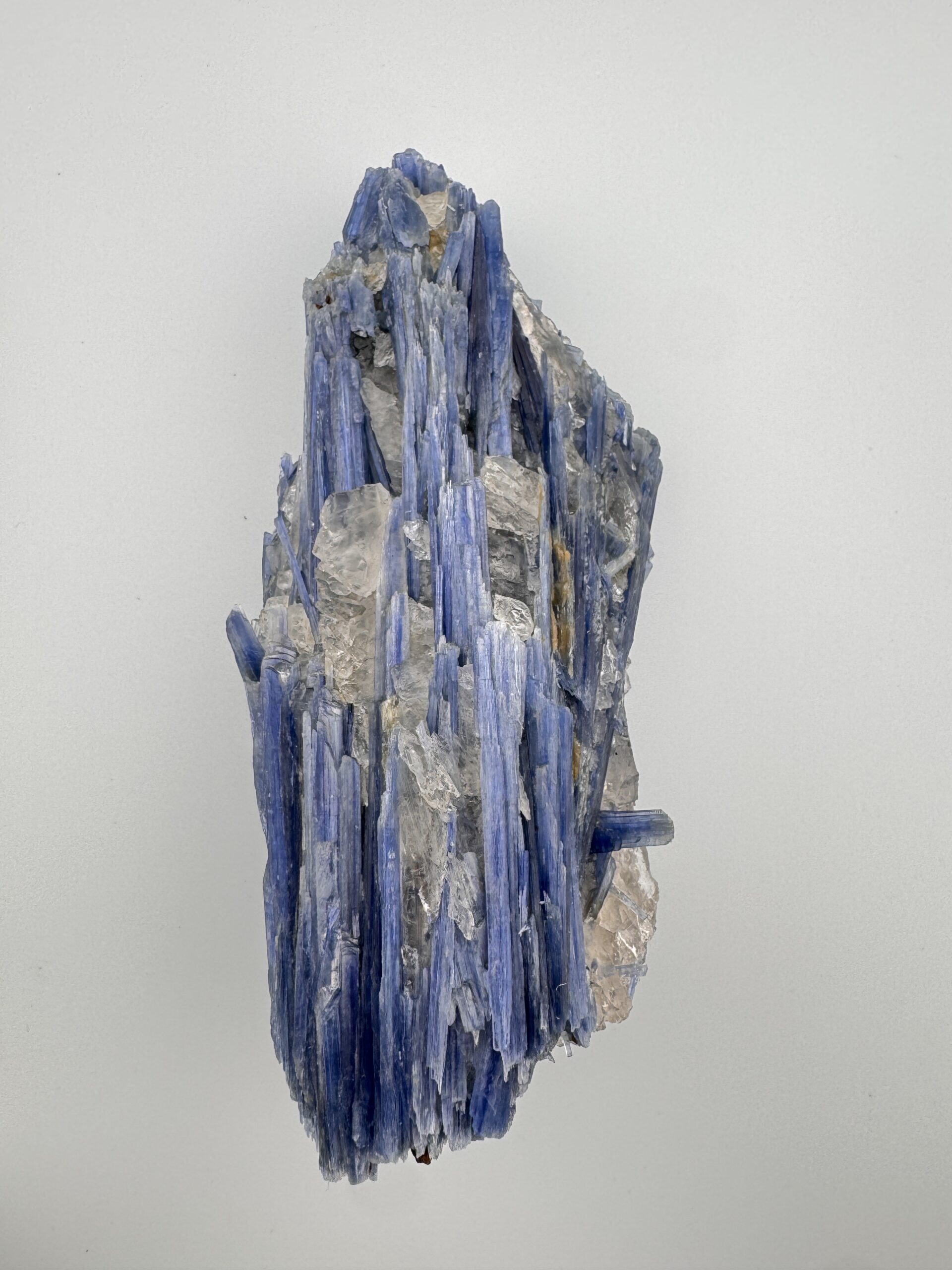 Vibrant blue Kyanite specimen with layered crystal blades and Quartz accents. Weighing 1.9 pounds and measures approximately 3.5″ x 7″ x 2.15″.