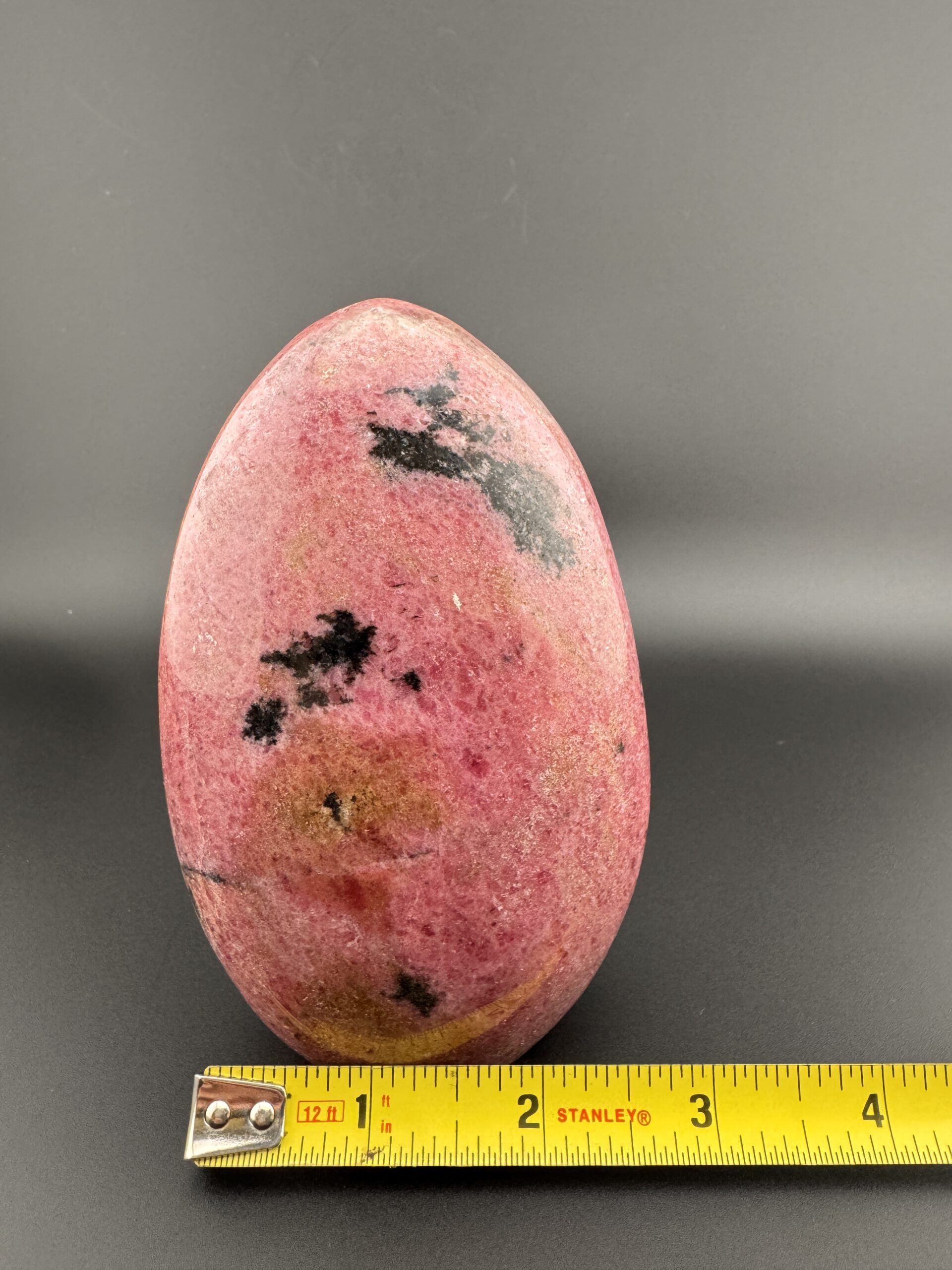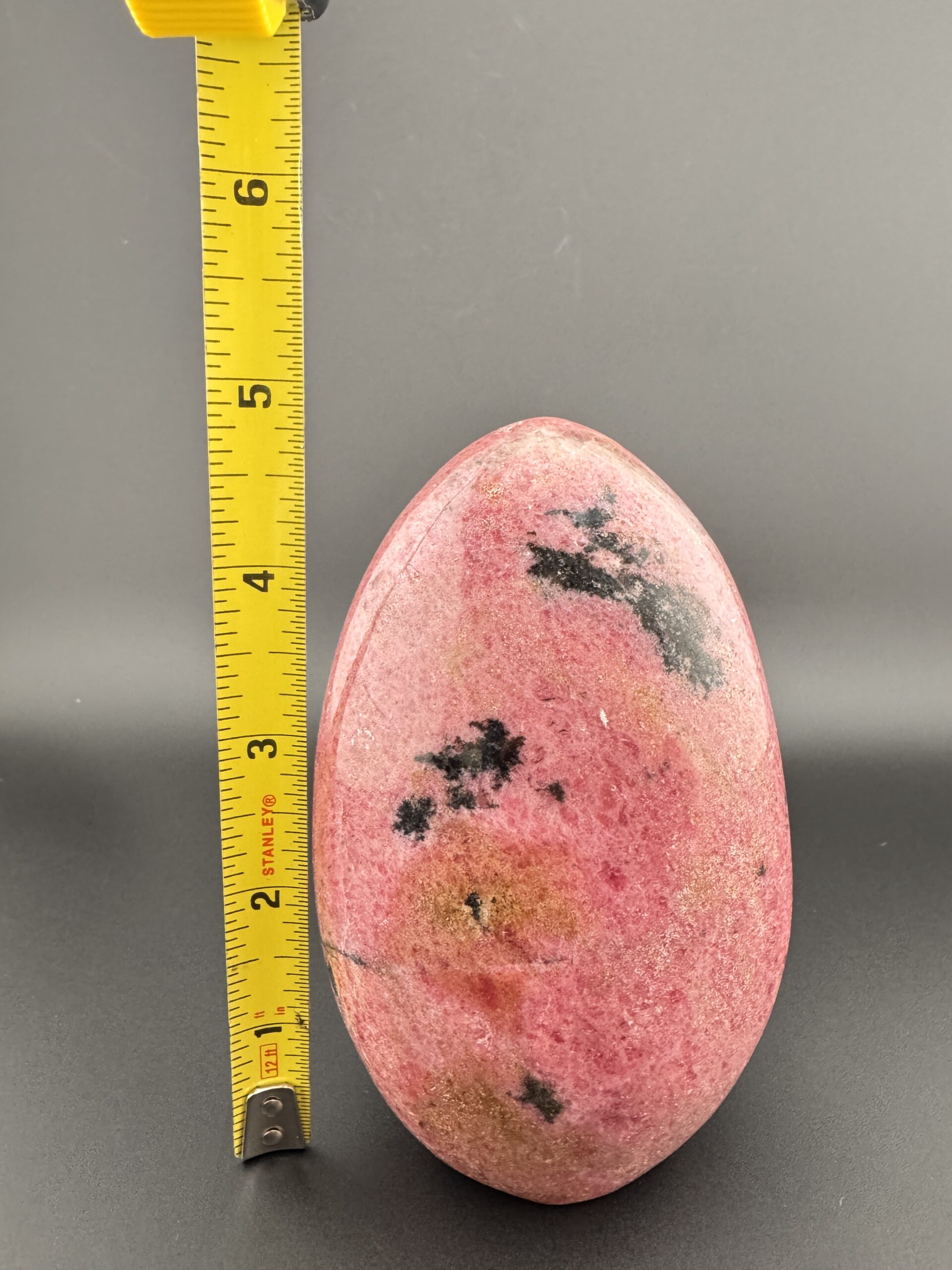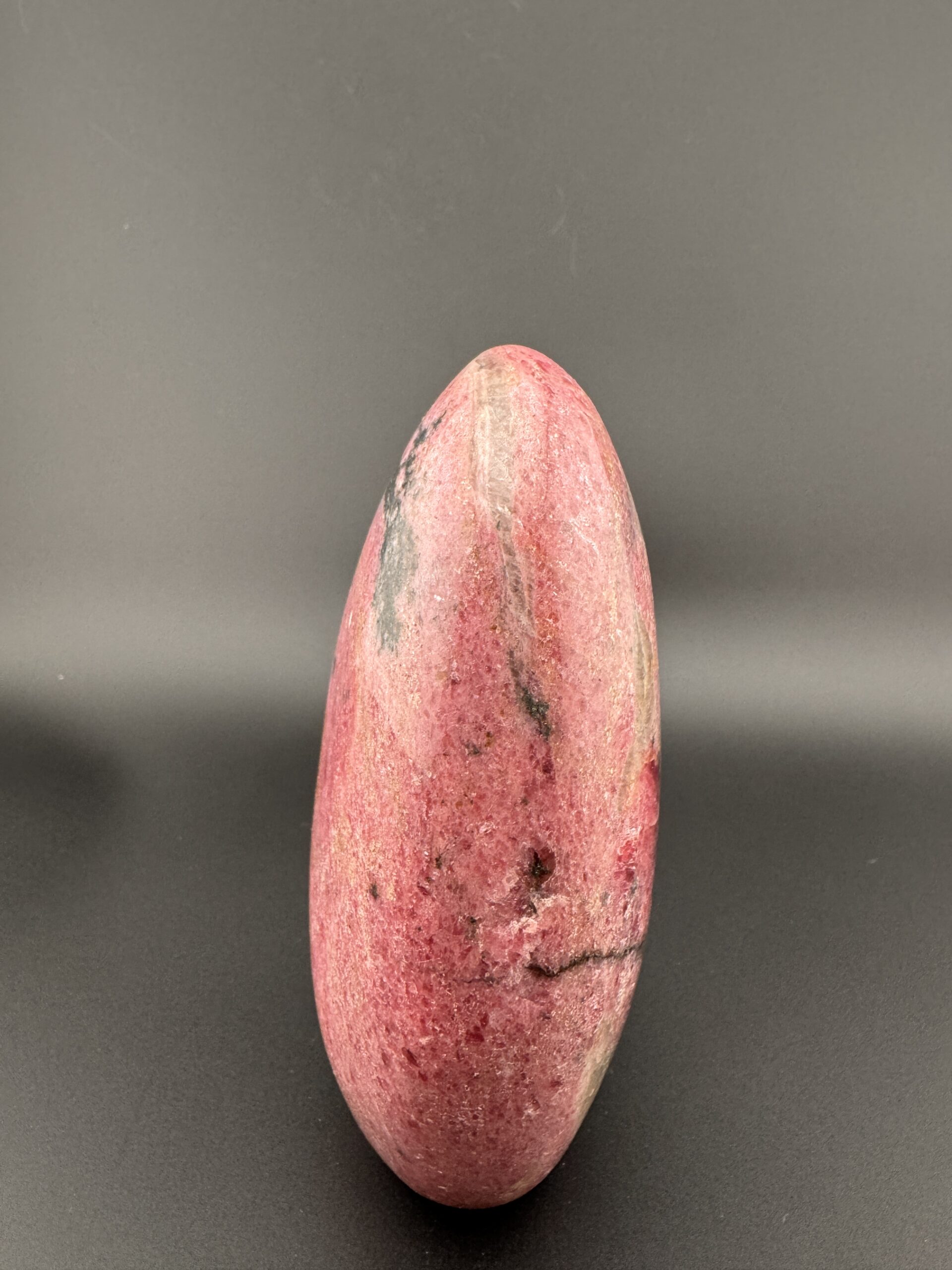 This striking Rhodonite piece stands 4.75″ tall and weighs 31.5 ounces. Polished to a smooth finish, it reveals beautiful blends of deep pink tones with natural black deposits throughout. Each angle highlights the stone’s bold yet balanced appearance, making it a stunning statement piece for any collection or decor space.