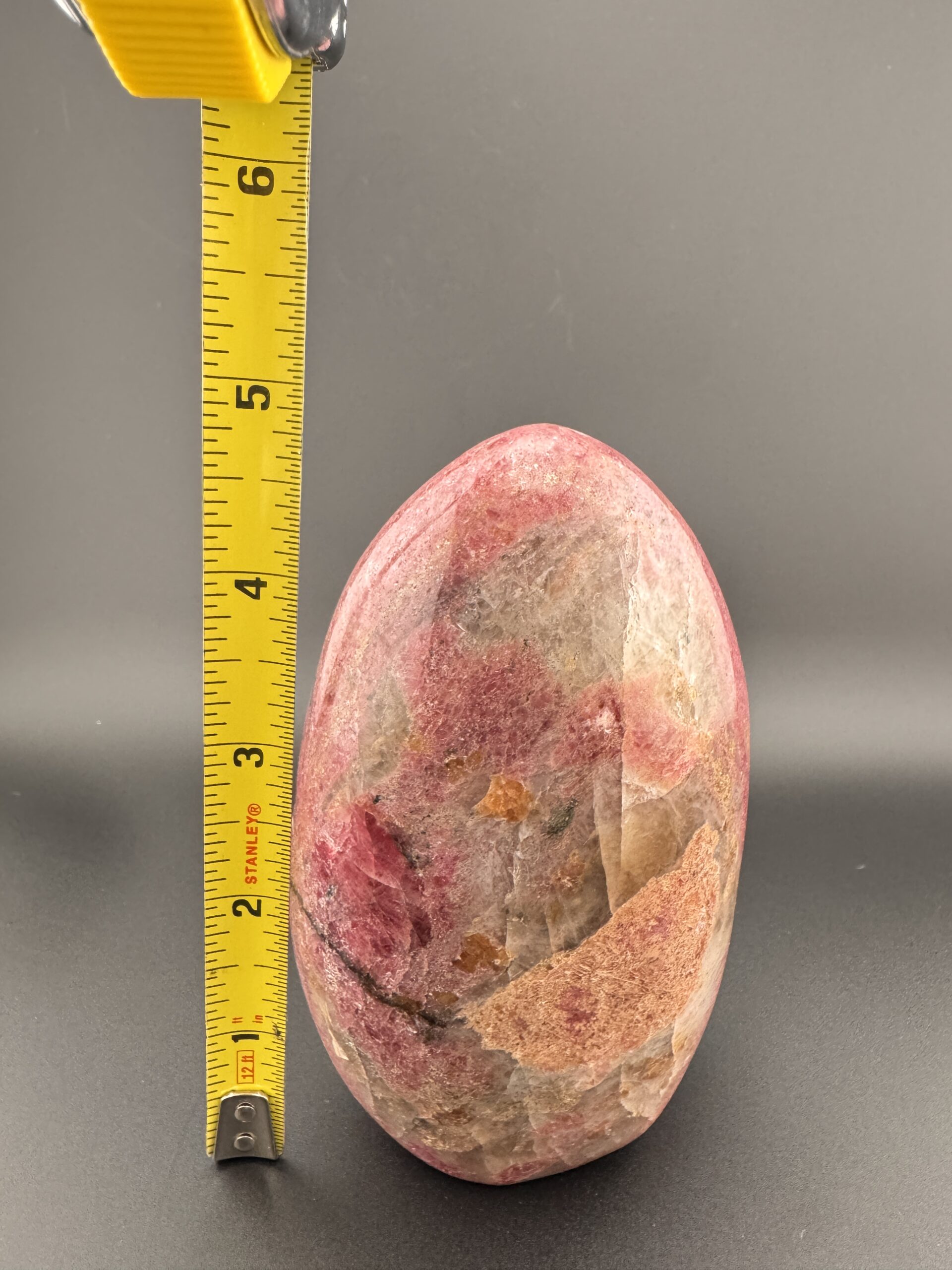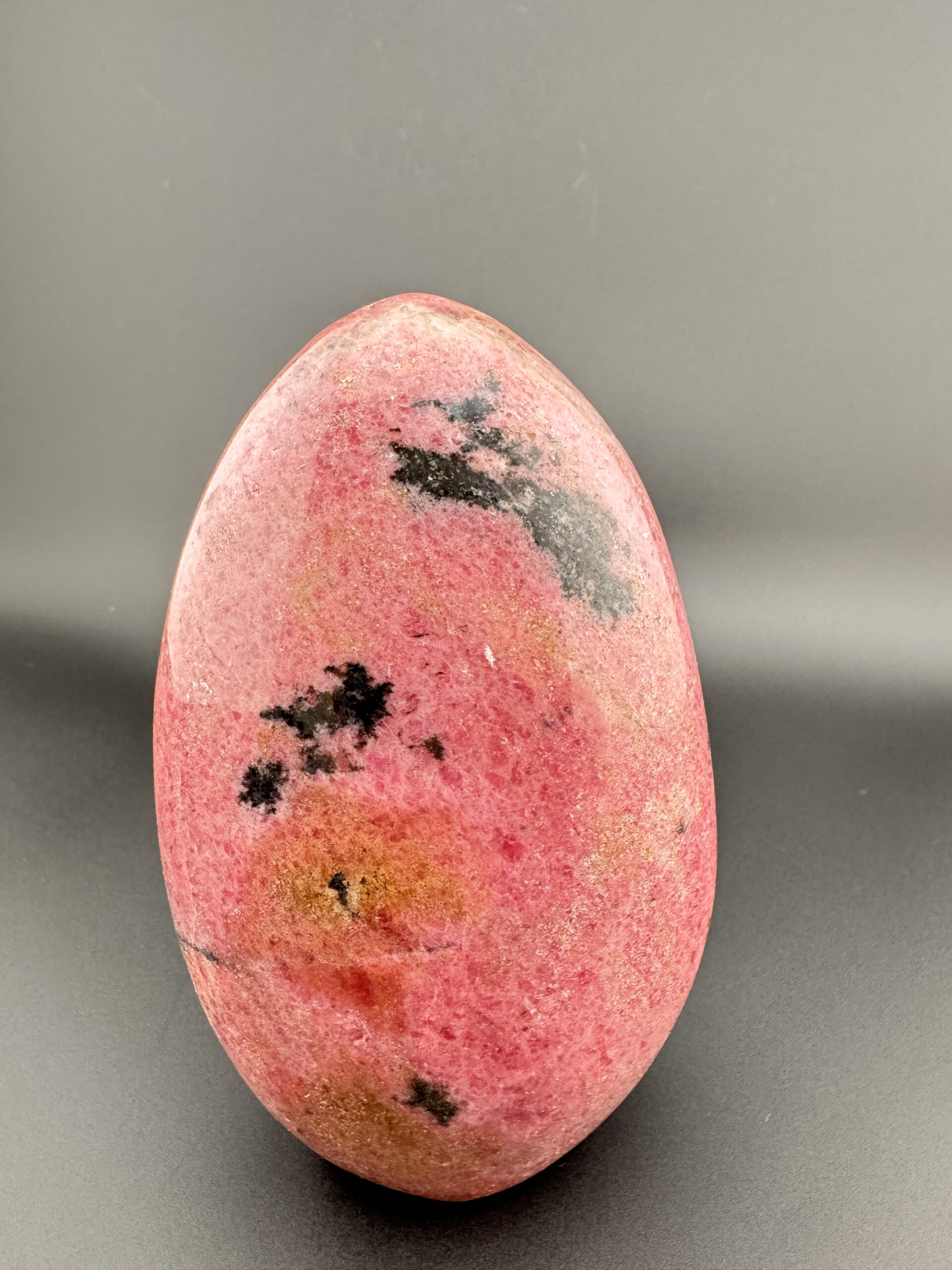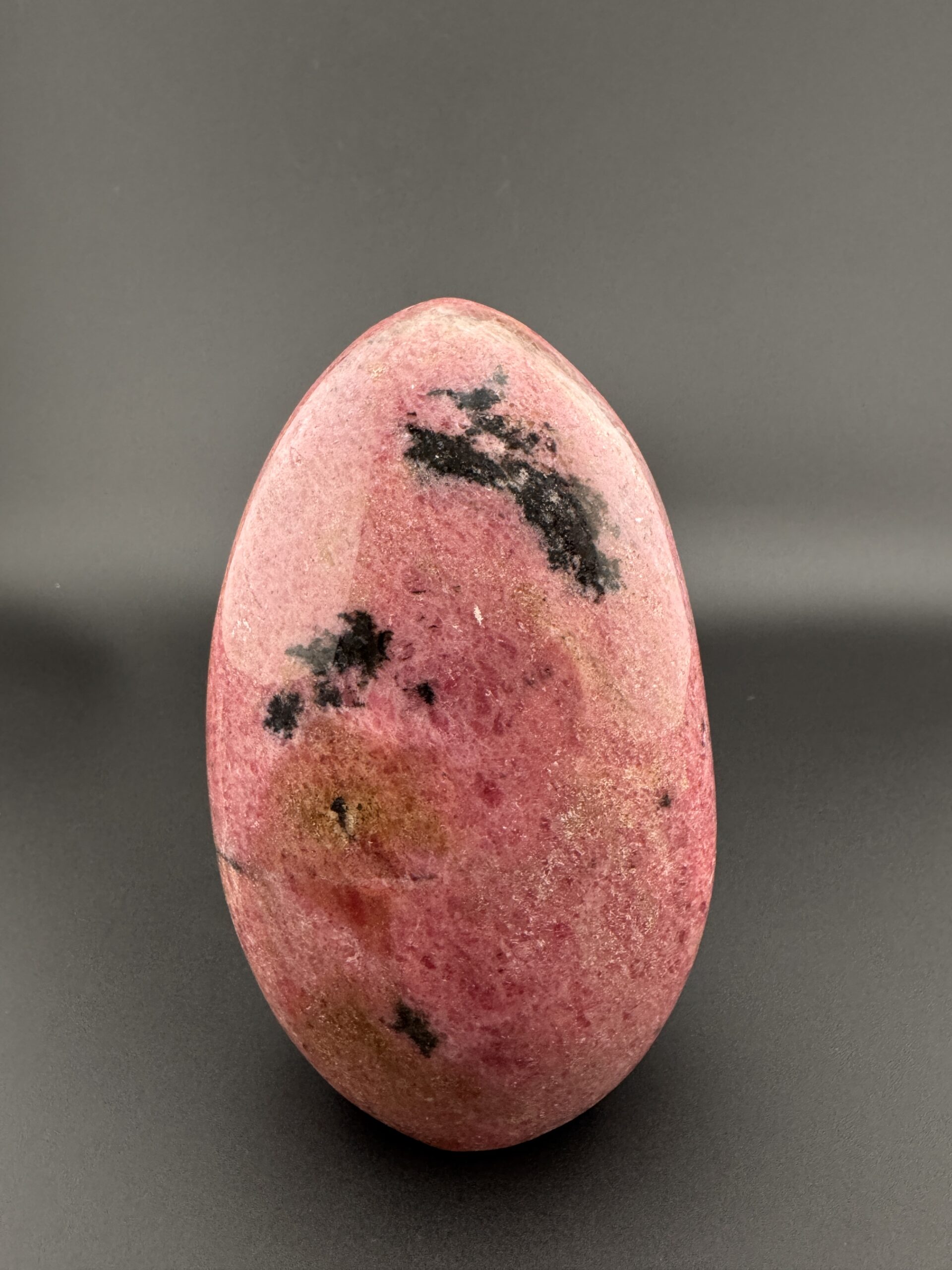 This striking Rhodonite piece stands 4.75″ tall and weighs 31.5 ounces. Polished to a smooth finish, it reveals beautiful blends of deep pink tones with natural black deposits throughout. Each angle highlights the stone’s bold yet balanced appearance, making it a stunning statement piece for any collection or decor space.