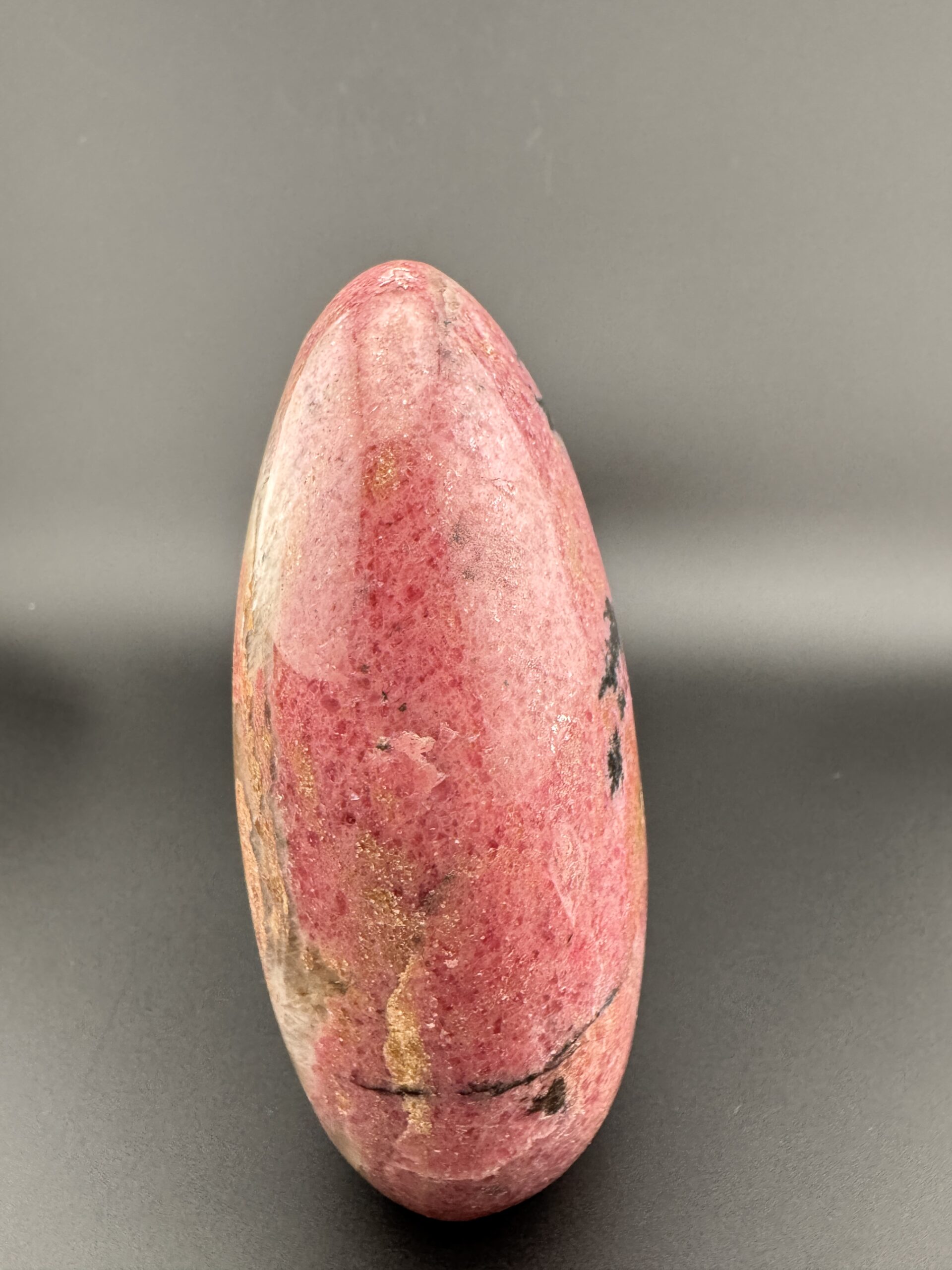 Polished Rhodonite with rich pink hues and dark natural deposits, 4.75″ tall.