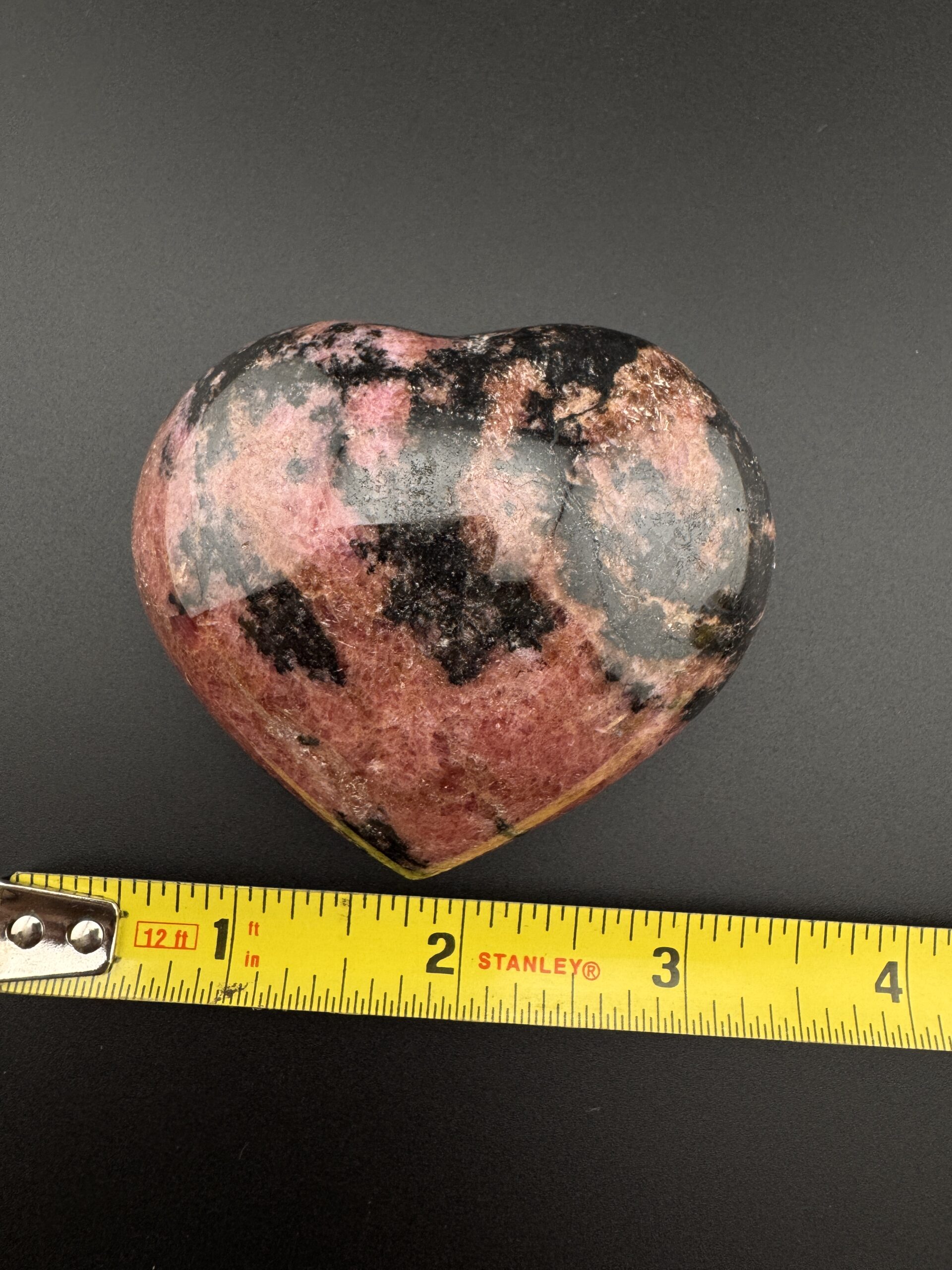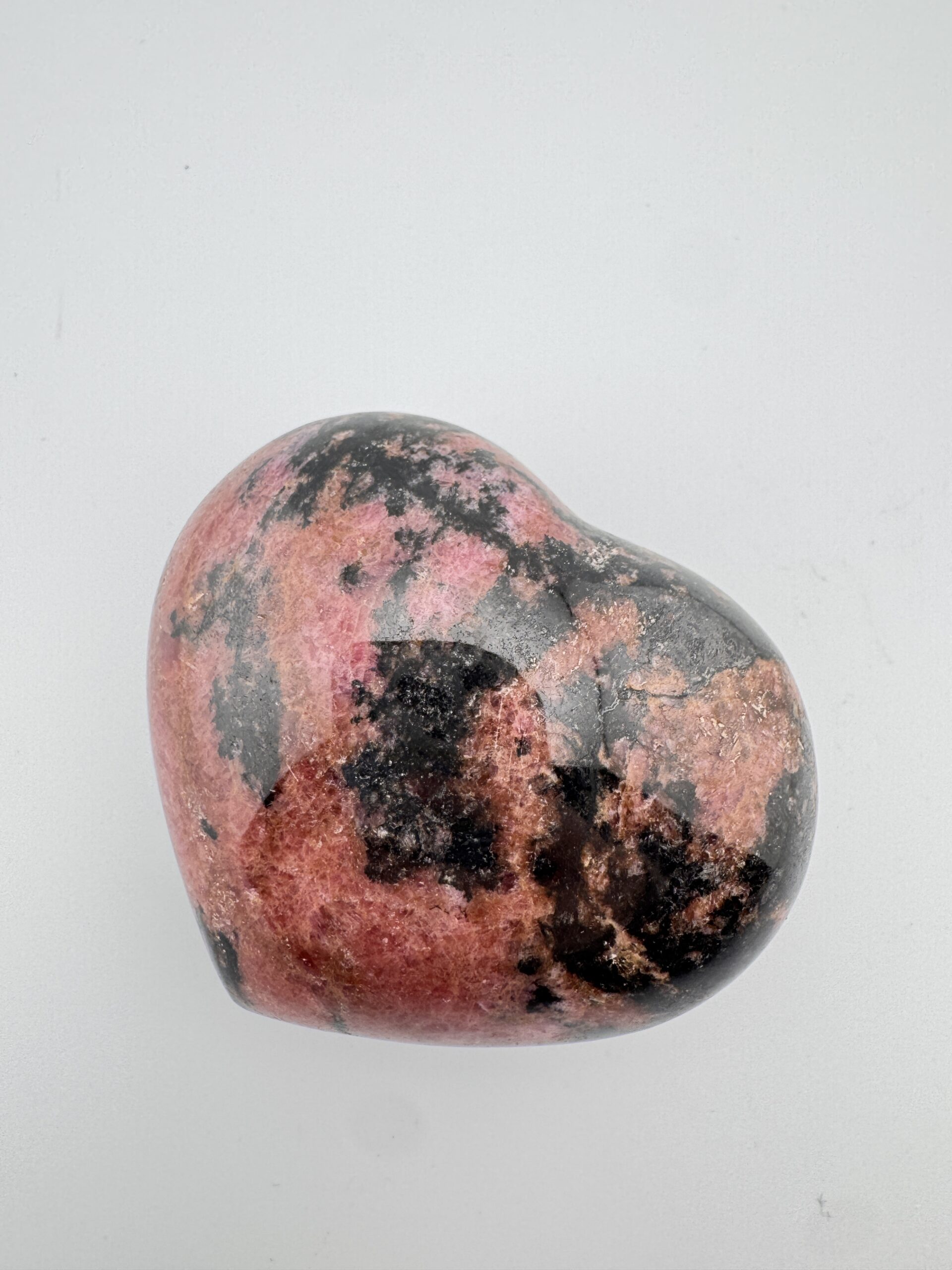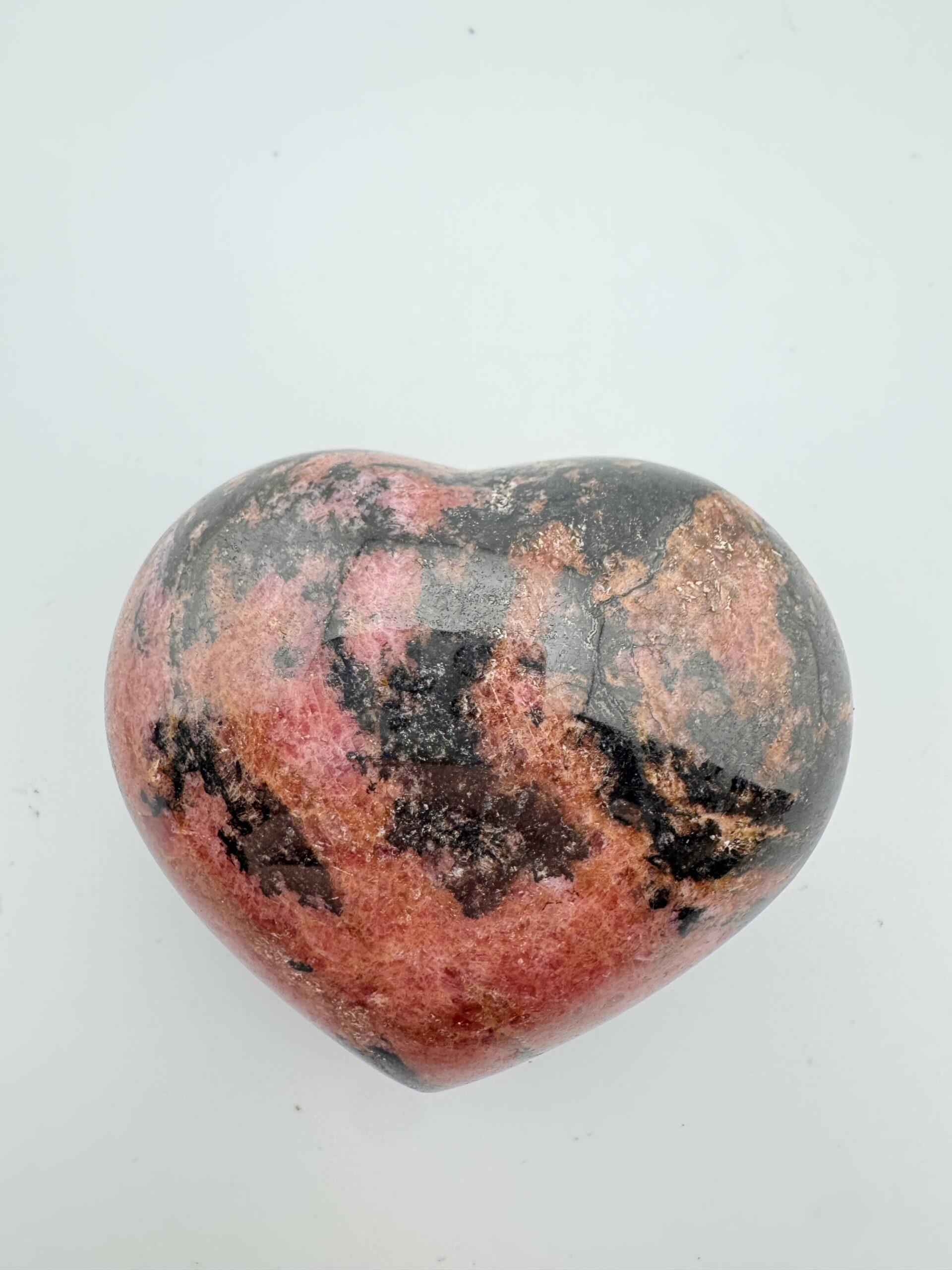This polished Rhodonite heart weighs 8.35 ounces and displays a beautiful blend of deep pink tones with natural black spotting. Its smooth surface and full shape highlight the stone’s natural charm, making it a lovely piece for display or as a thoughtful gift that lasts a lifetime.