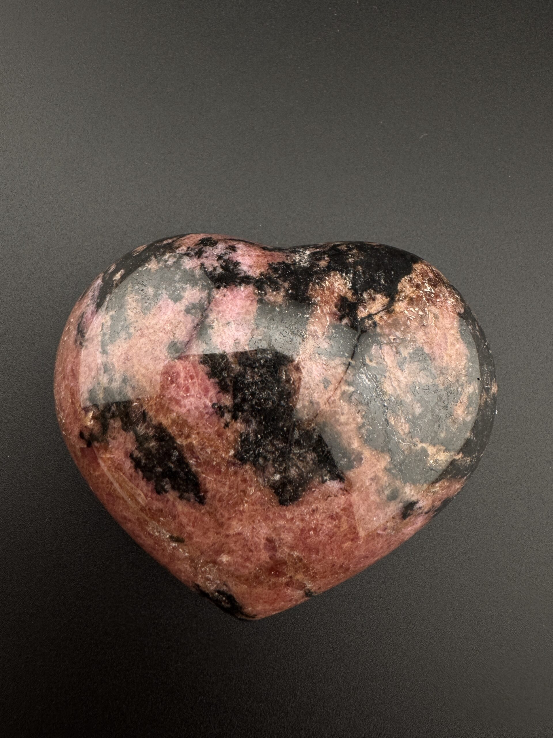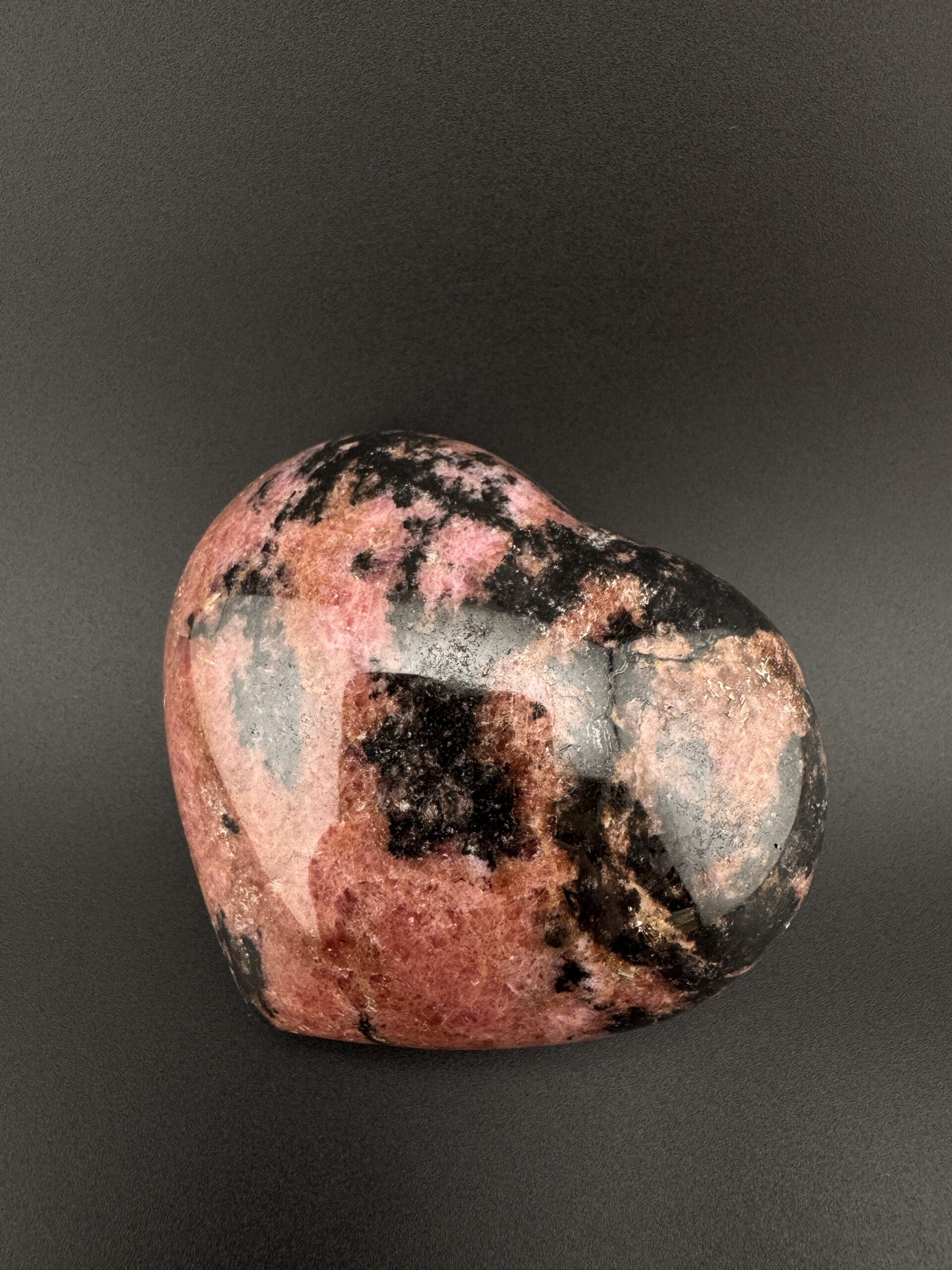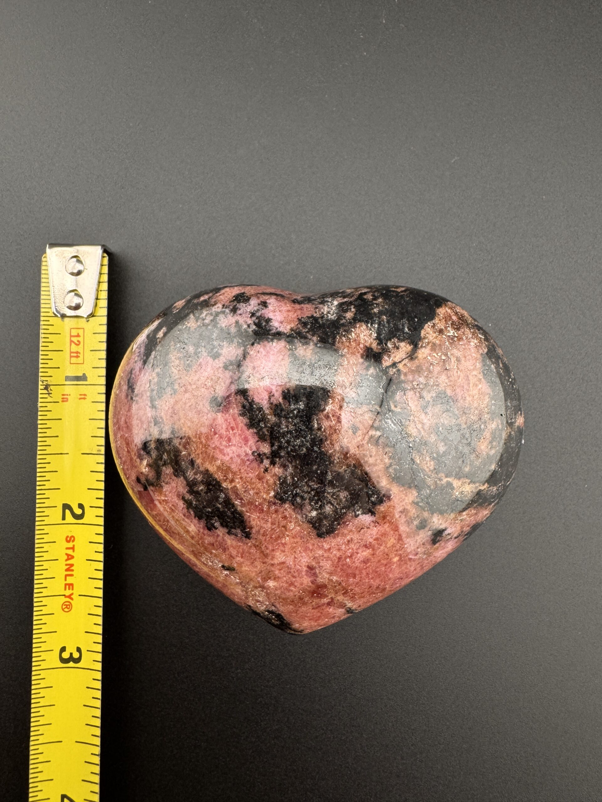 This polished Rhodonite heart weighs 8.35 ounces and displays a beautiful blend of deep pink tones with natural black spotting. Its smooth surface and full shape highlight the stone’s natural charm, making it a lovely piece for display or as a thoughtful gift that lasts a lifetime.